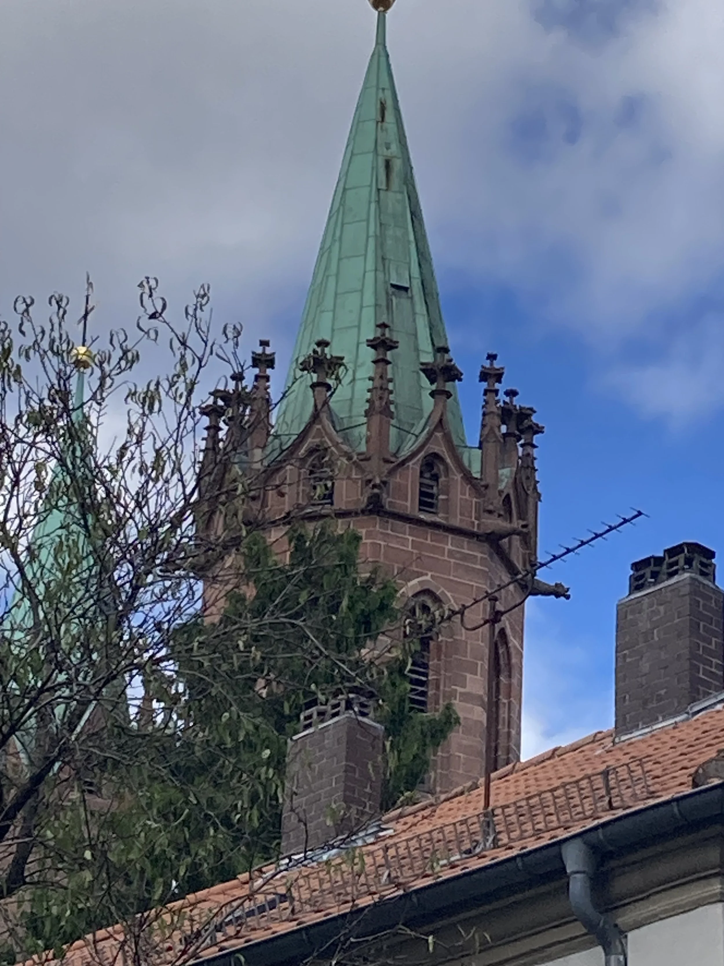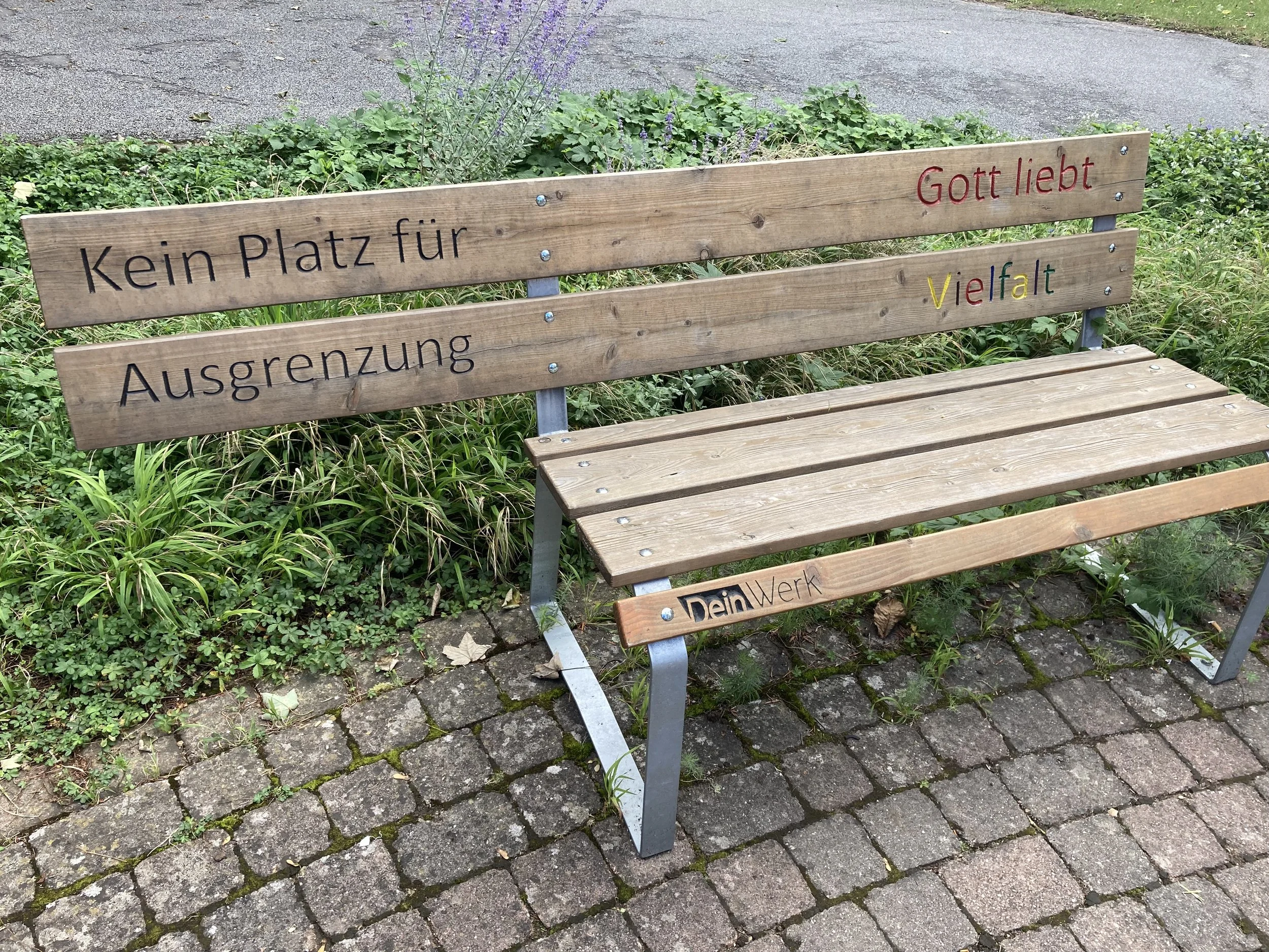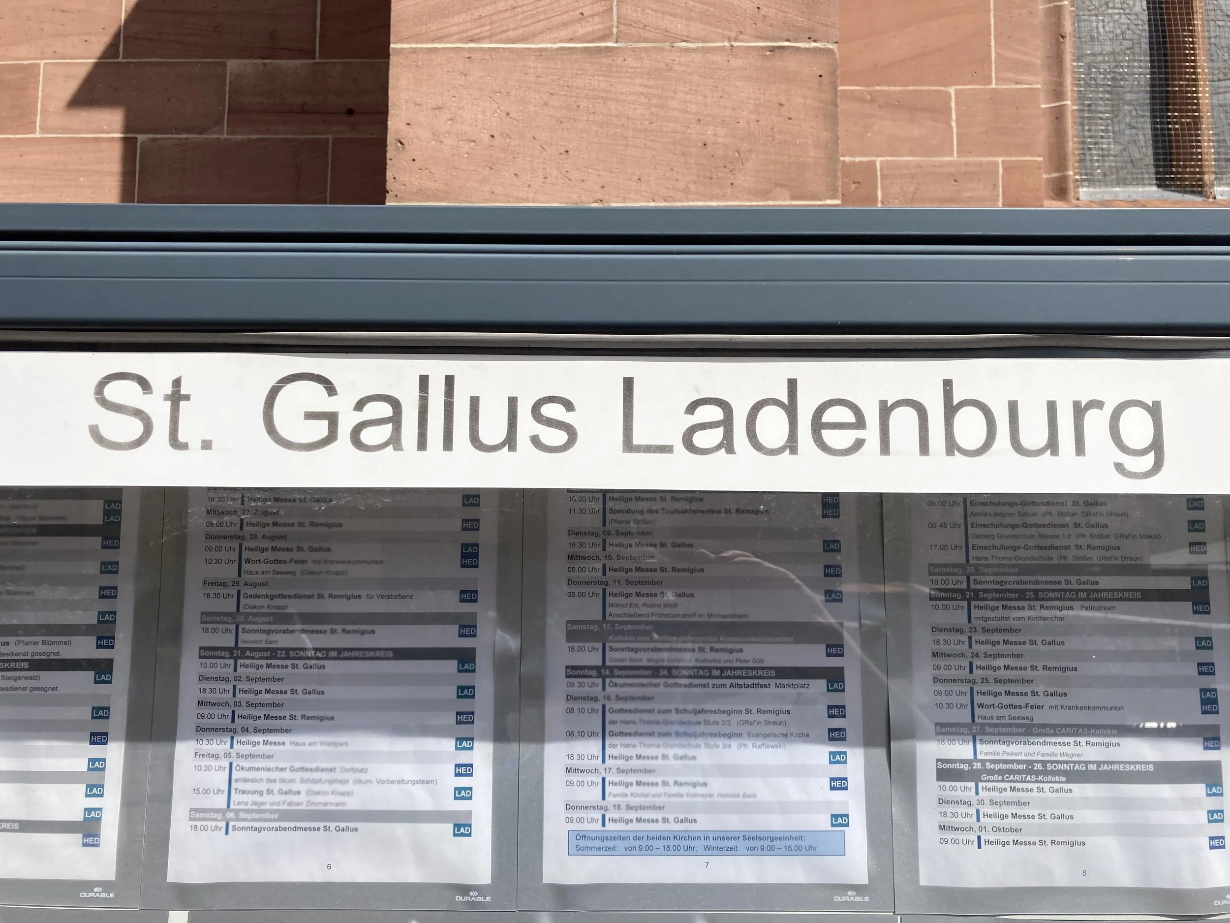 Next up was St. Gallus which is the town church totally renovated. What caught my eye was the inclusive bench outside the church which included a seat for a wheelchair as well as a call-out for LGBTQ+, which Violet noticed and posed for a picture in front of this part of the bench.