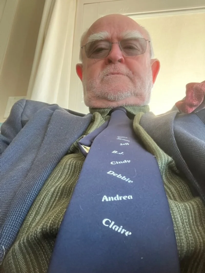 Couple of things to note that I really appreciate. Aunt Chris’ favorite color was pink so all my uncles wore pink in her honor. Uncle Paul wore a pink handkerchief, Uncle Dan wore pink socks and the tie Uncle Paul is wearing has all of my grandfather’s grandchildren’s names on it — it was originally my mother’s father’s tie (Reg McLean). And Aunt Chris was buried in Scottish boxers (which Uncle Ron shared in the eulogy).