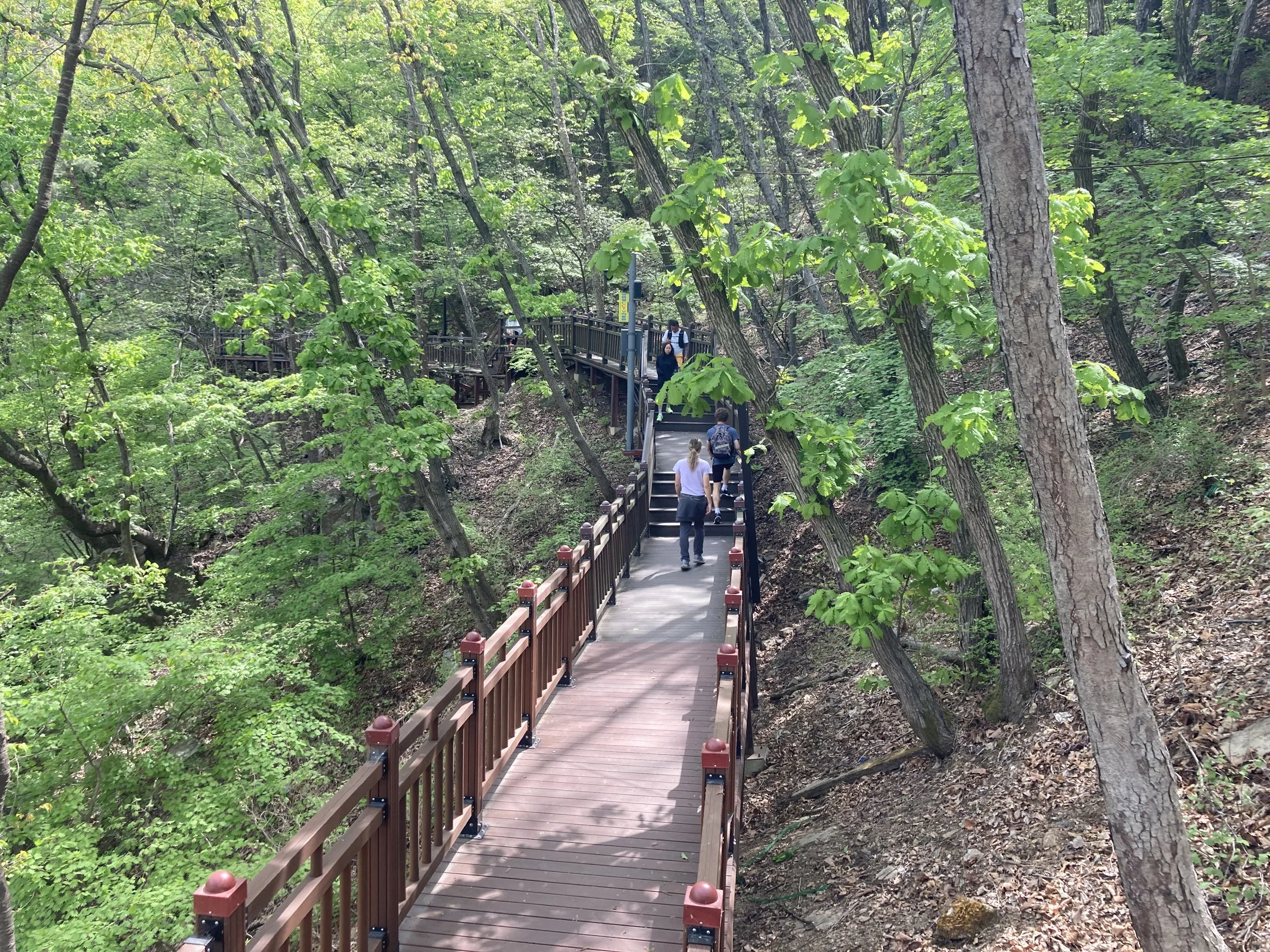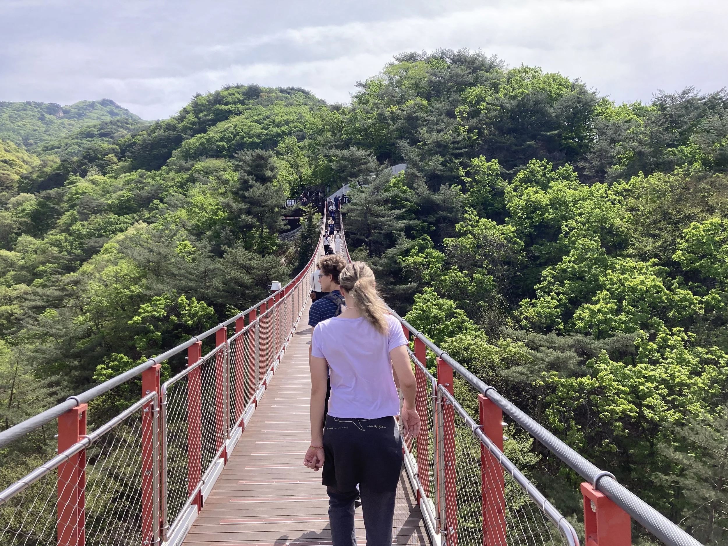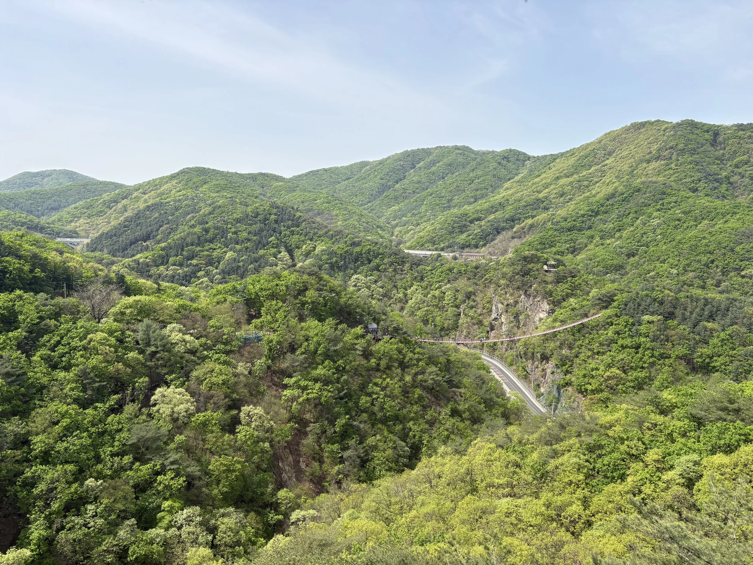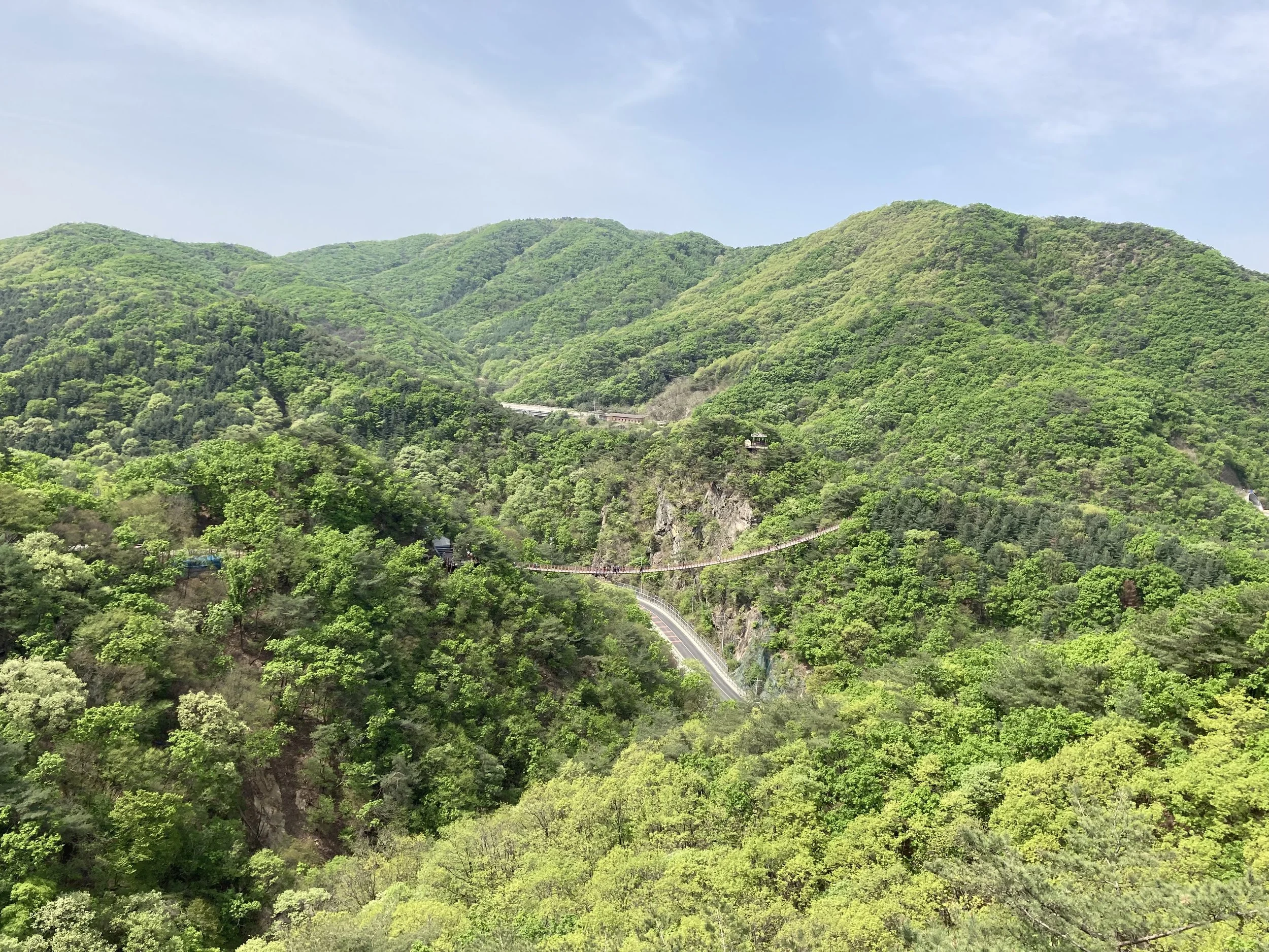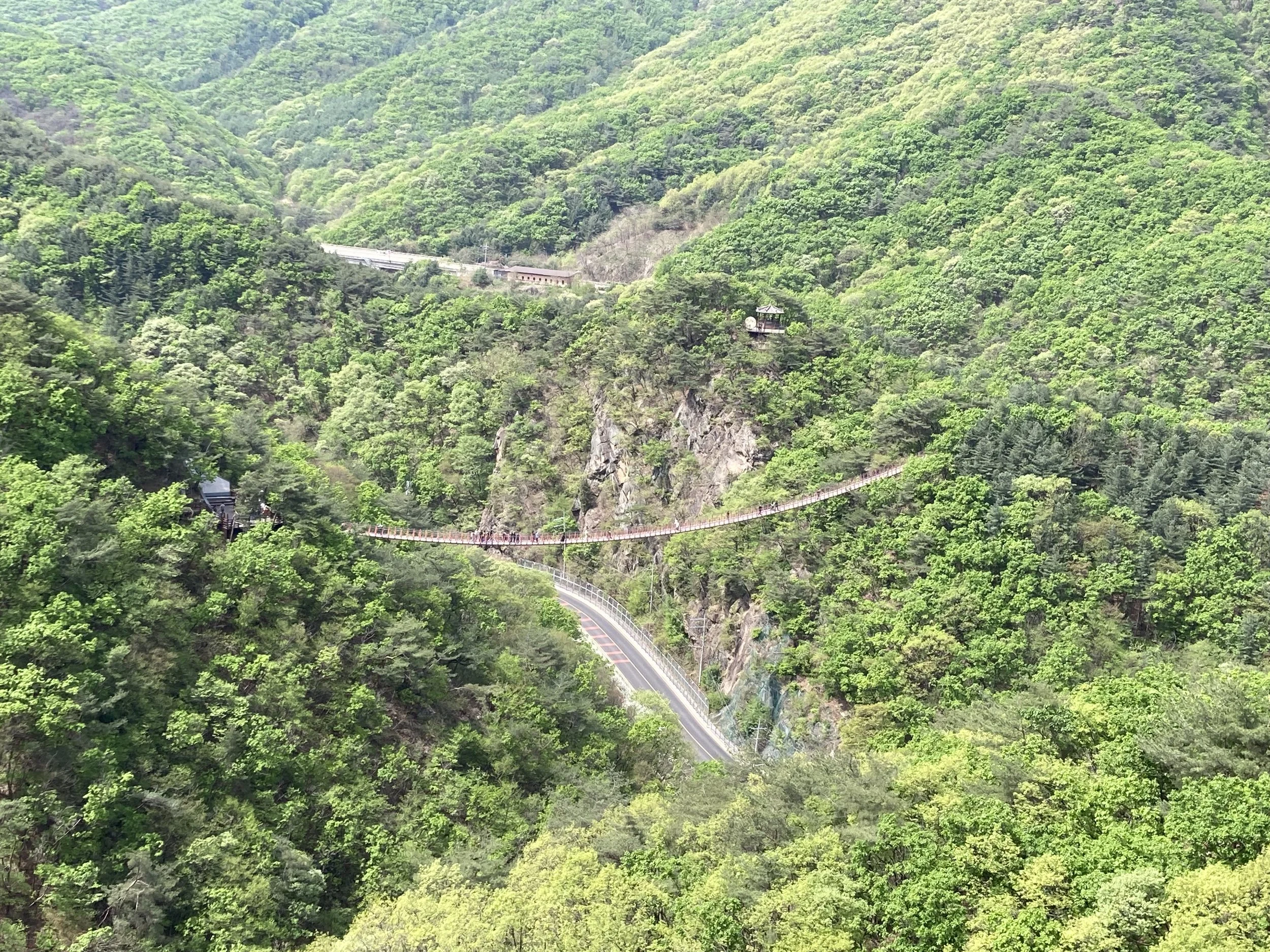 At the top of the mountain is a gazebo overlooking the suspension bridge. The bridge looks so tiny from the top. Meanwhile the mountains of South Korea are sweeping and the perfect color green. There may have been some forest bathing, but today it felt more like being charged up by the many mountains of South Korea.
