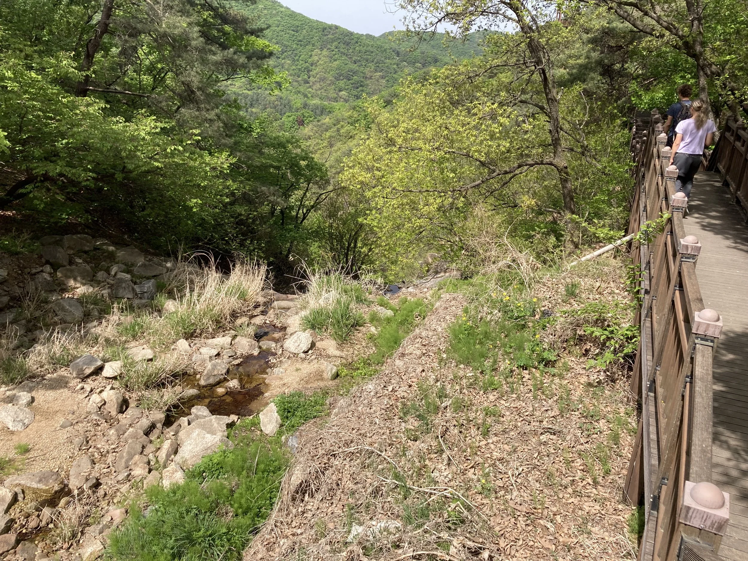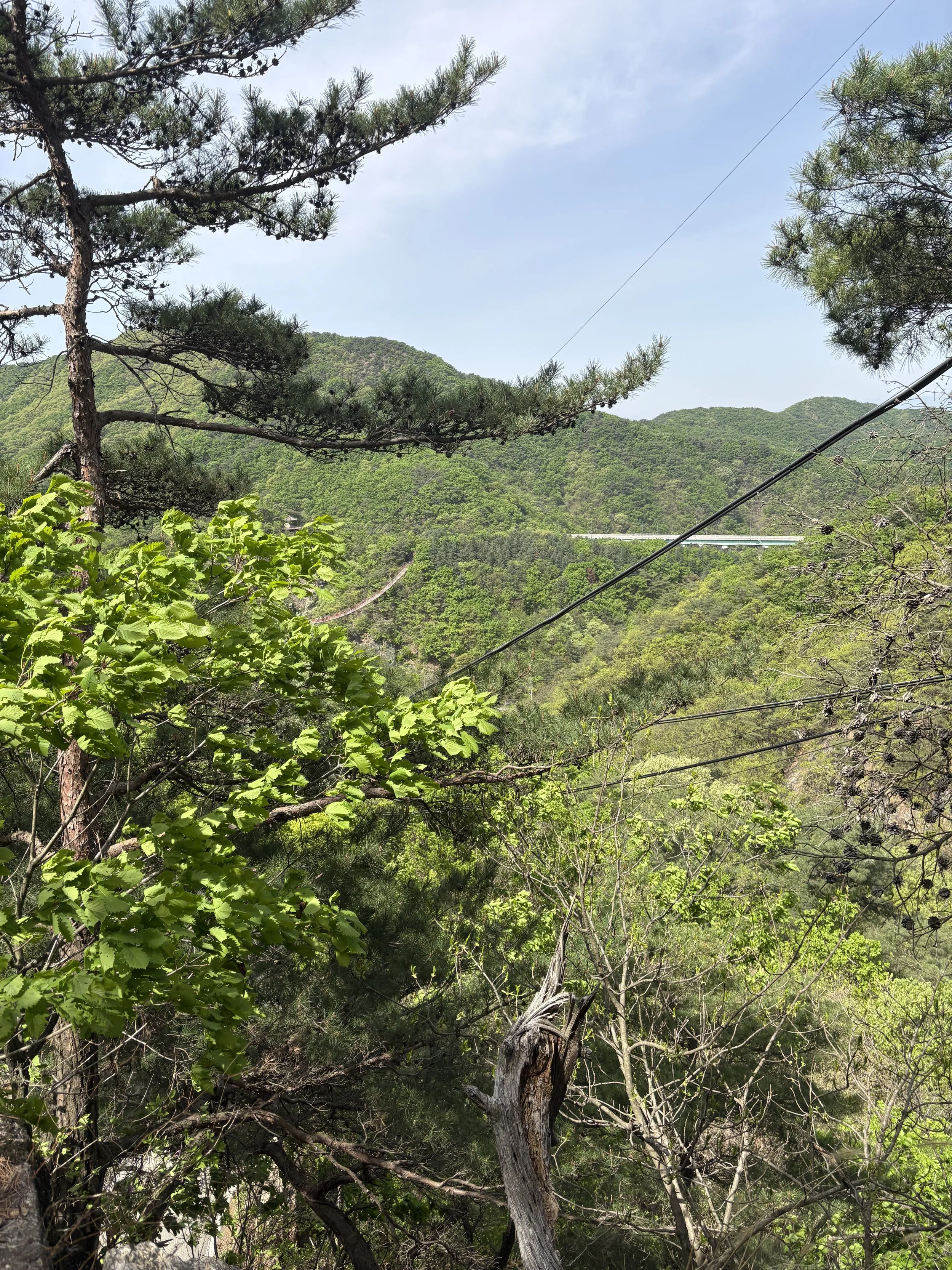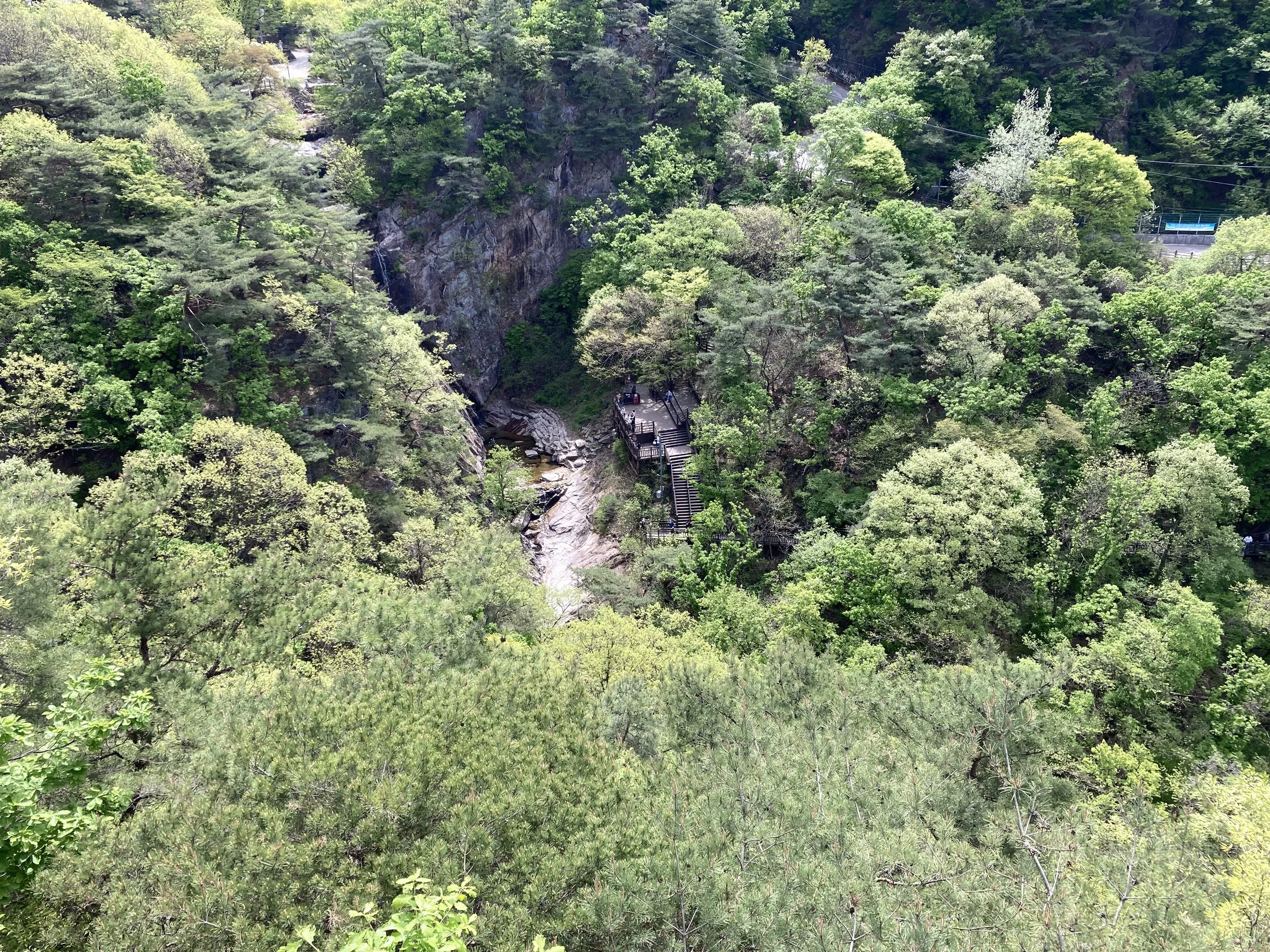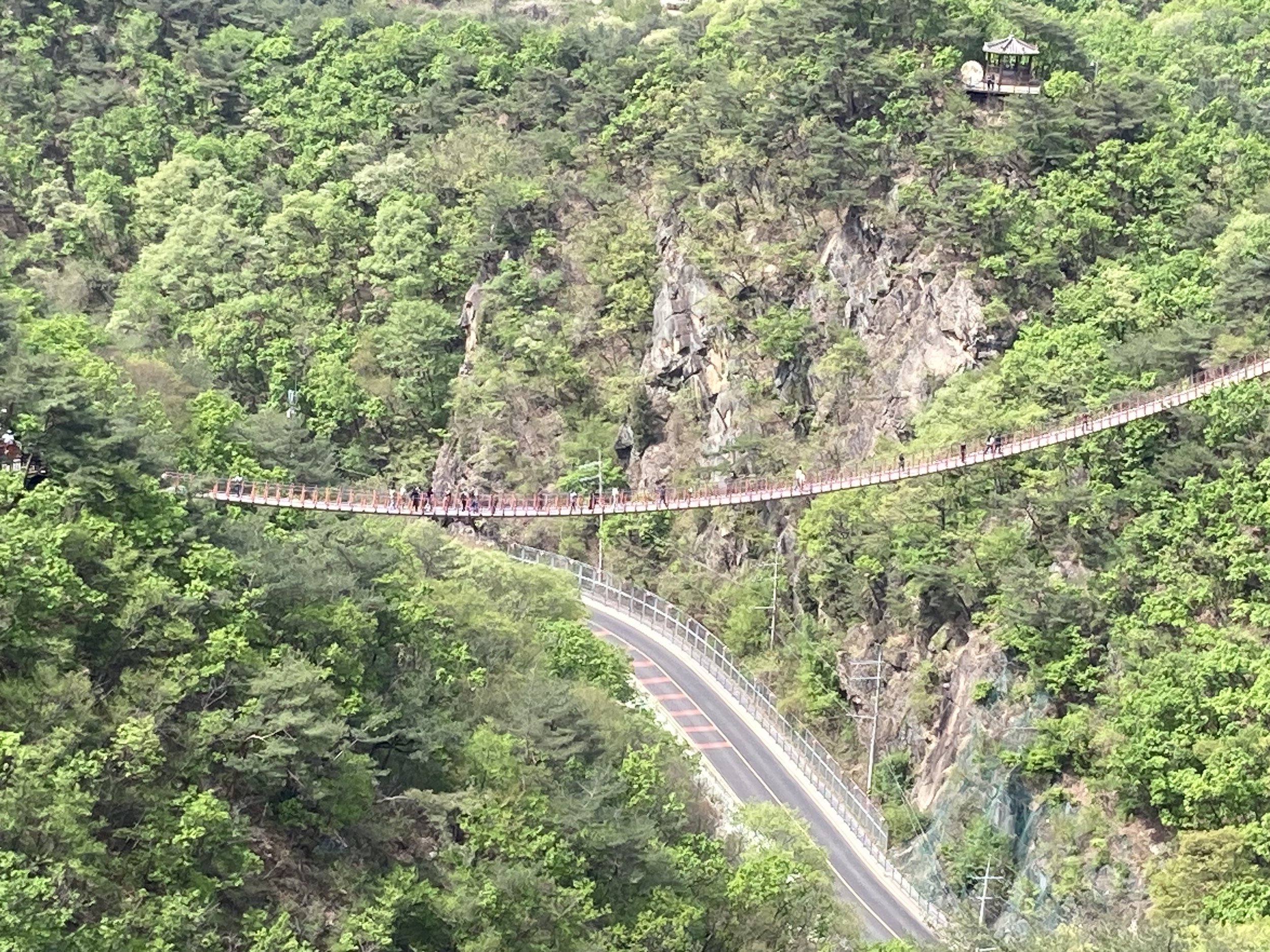 At the top of the mountain is a gazebo overlooking the suspension bridge. The bridge looks so tiny from the top. Meanwhile the mountains of South Korea are sweeping and the perfect color green. There may have been some forest bathing, but today it felt more like being charged up by the many mountains of South Korea.