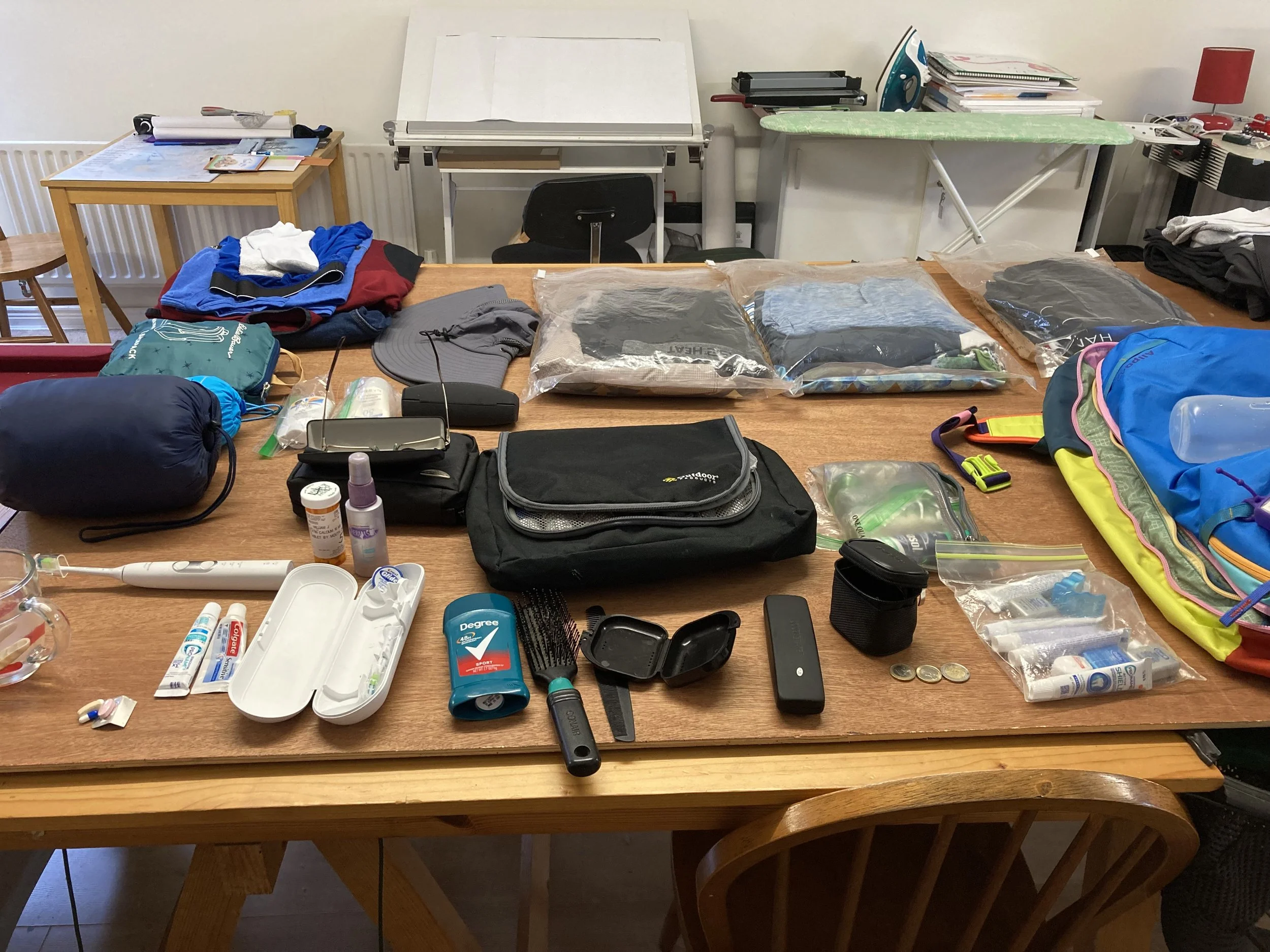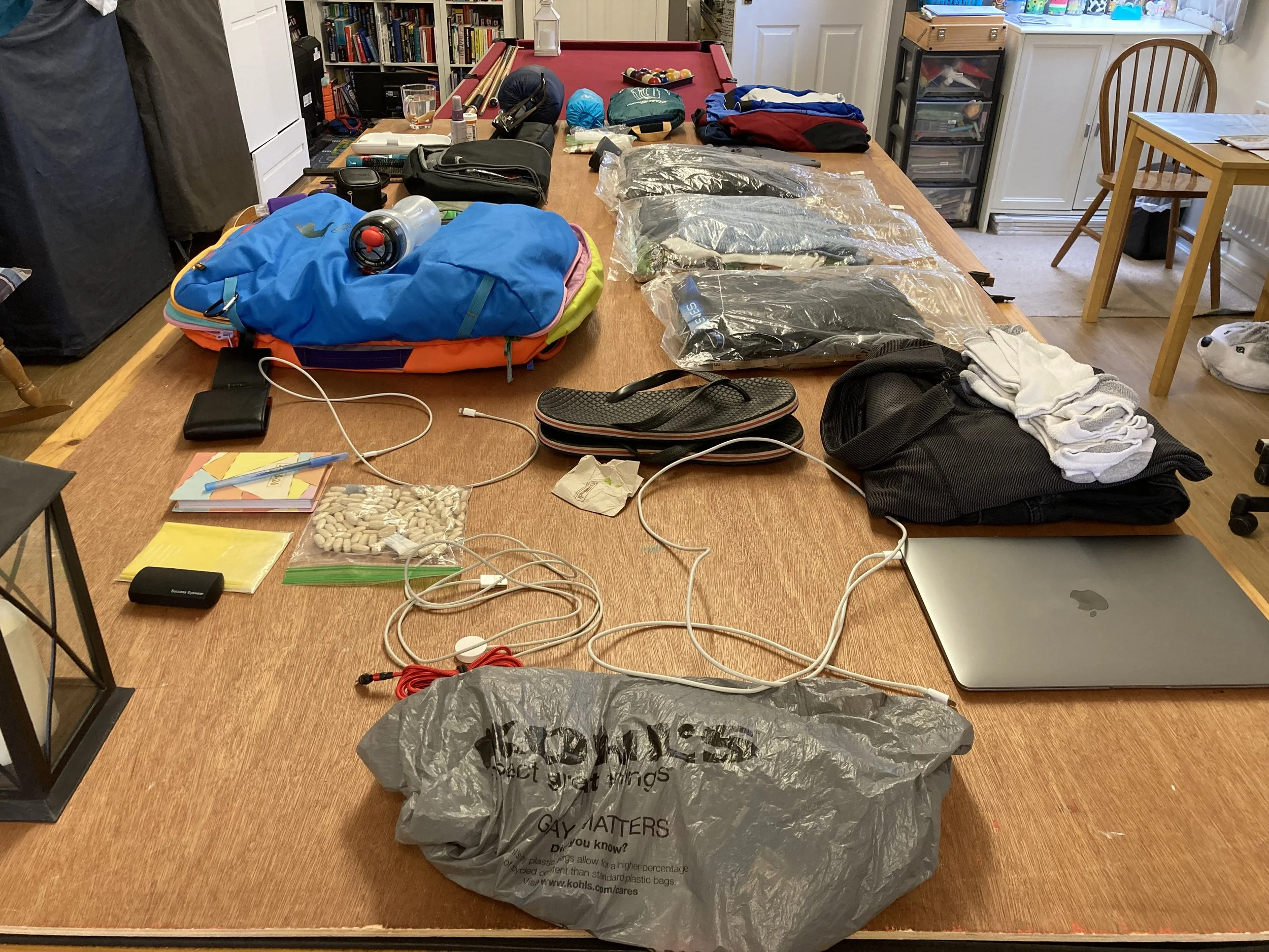 The other big item are all my contact lenses for a full year. When you combined all the “in case you need them” drugs and the prescription contacts, it’s surprising how much space that takes up. The single puffy jacket, rain coat, and the rest of the clothes seem about right. Balancing the frequency of laundry with the convenience of having multiple changes of clothes.