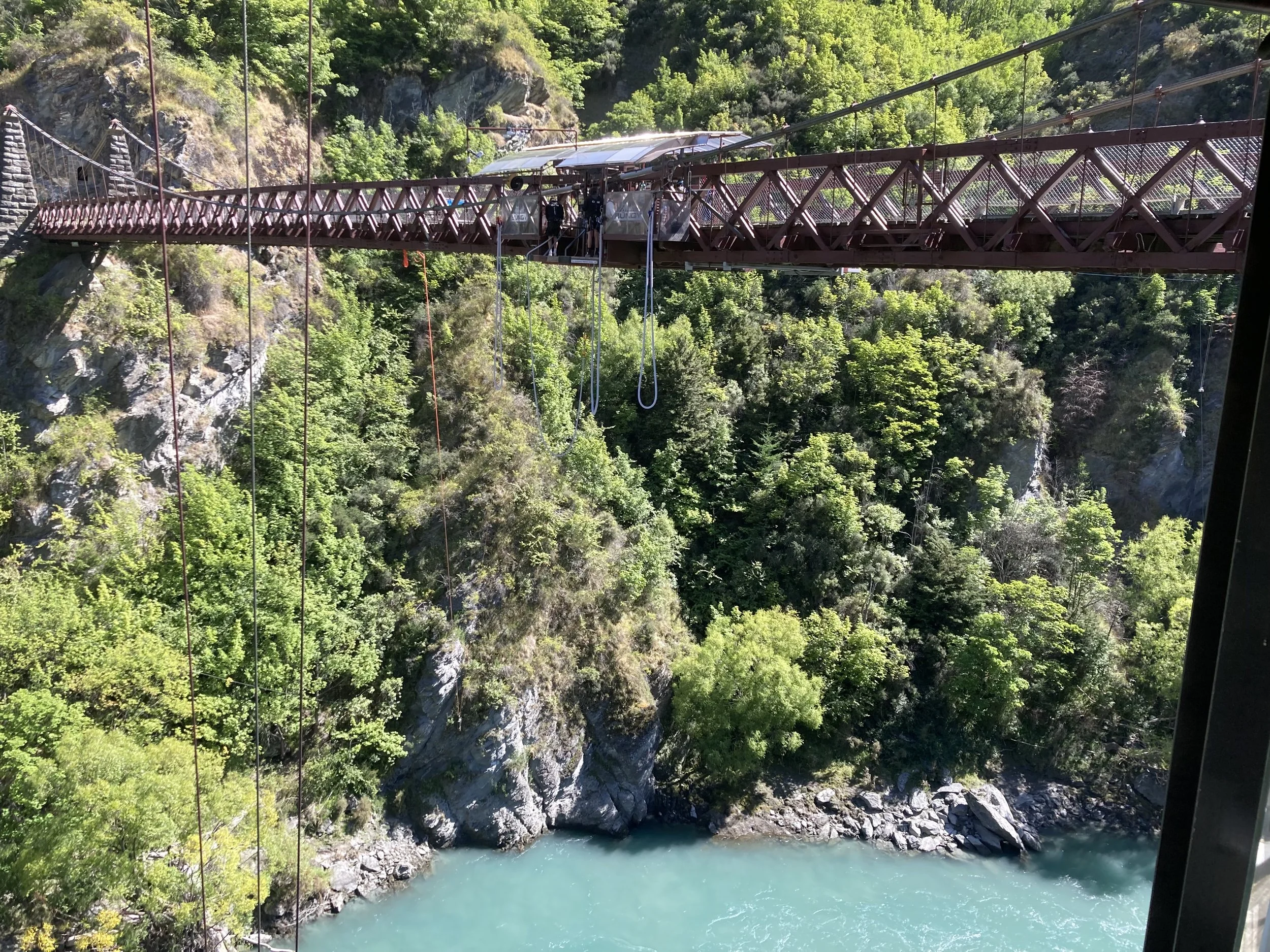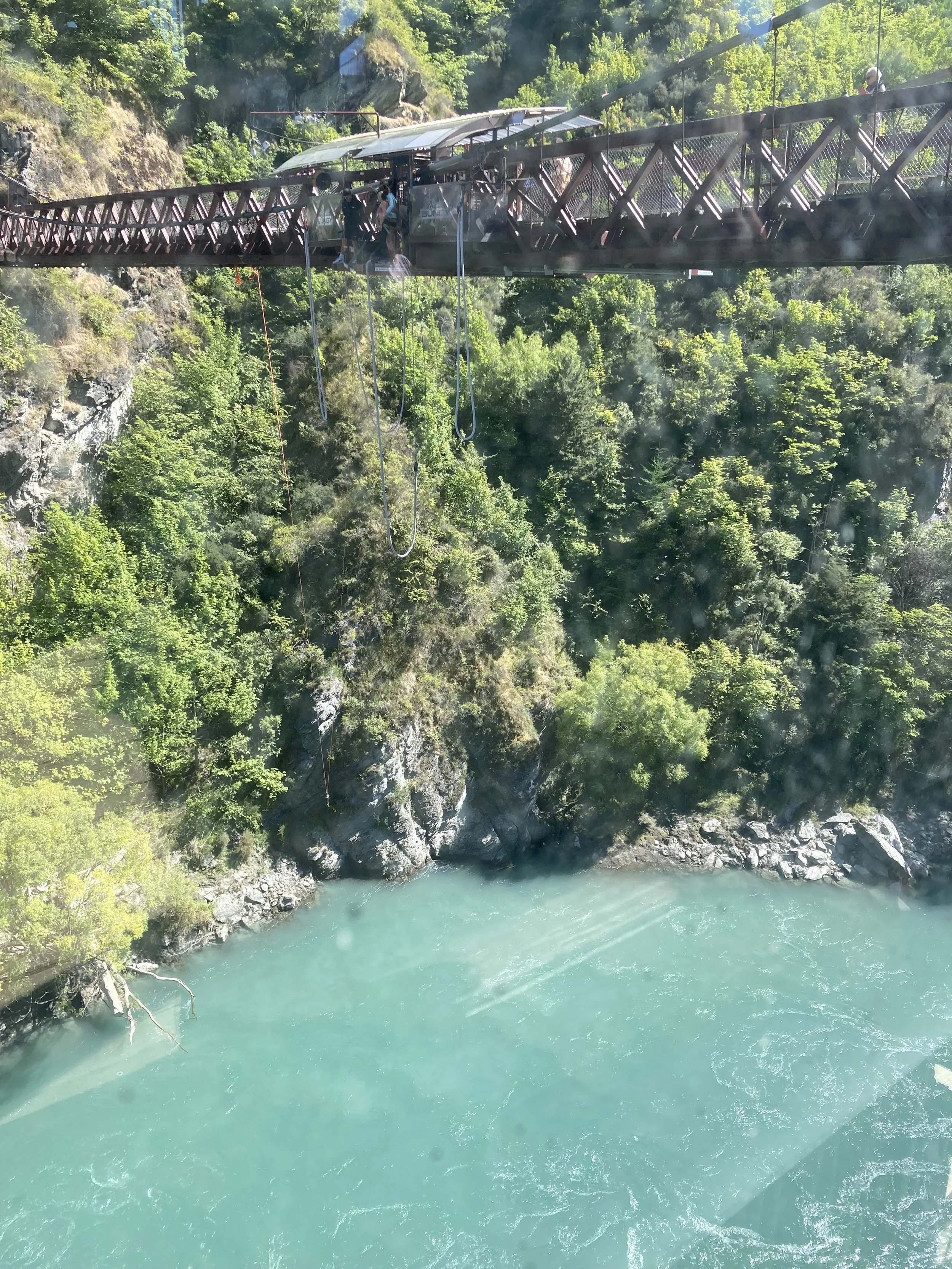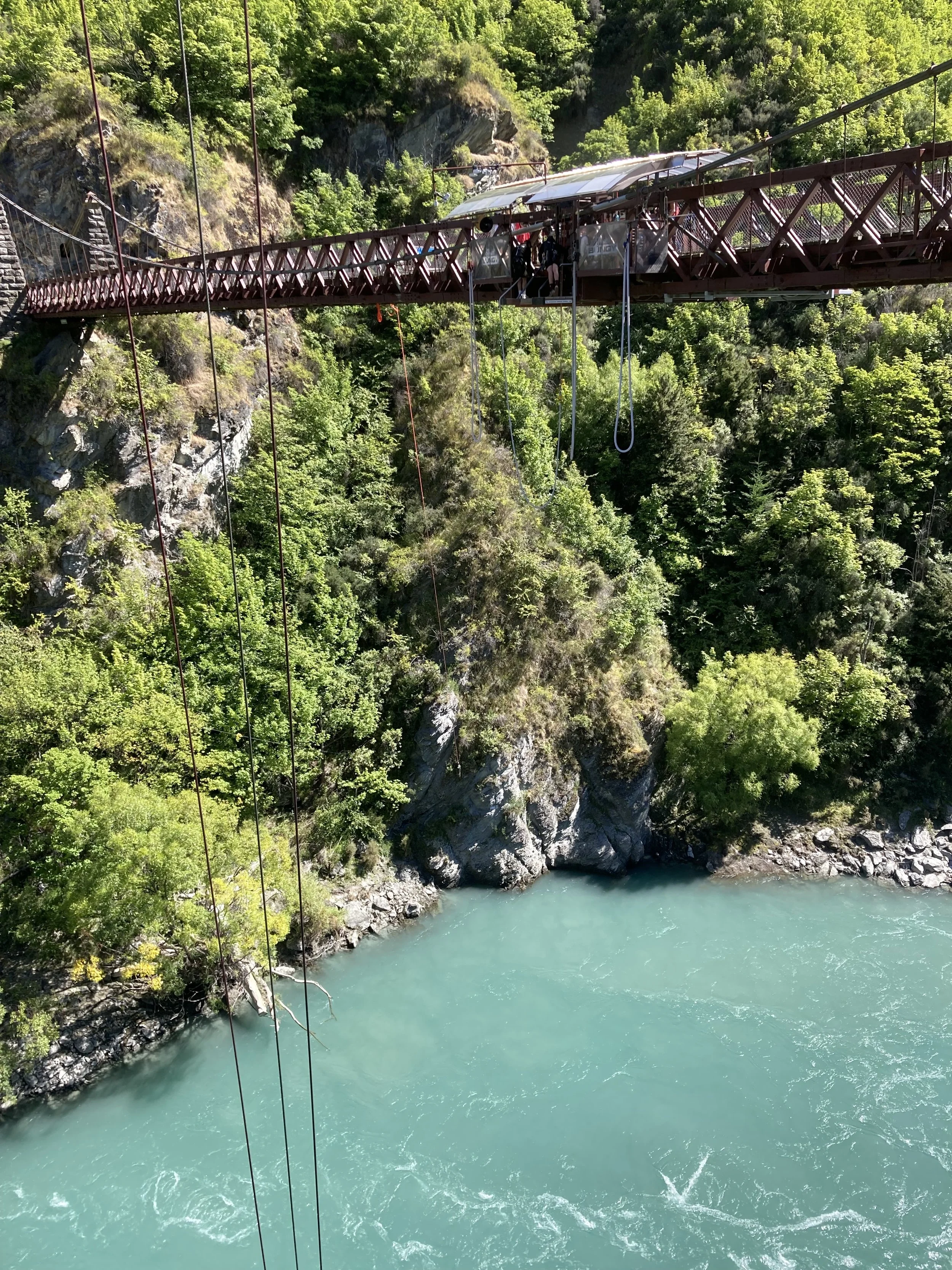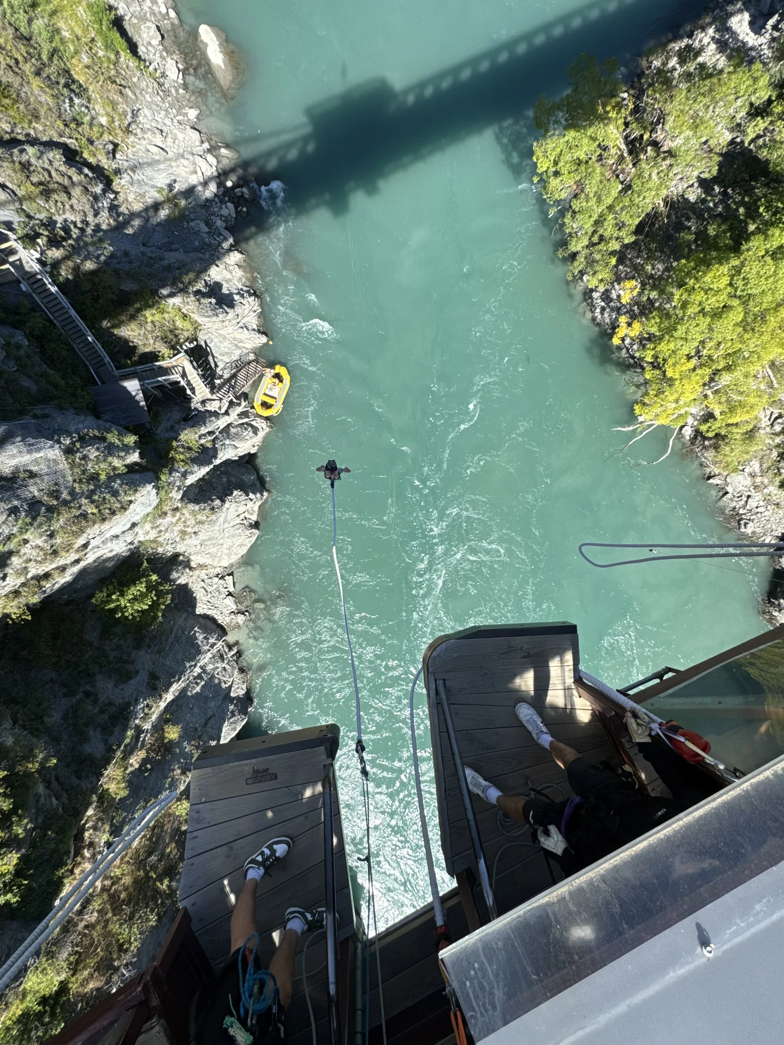 In 1988 (I was just 16 years old at the time), Hackett and Henry van Asch opened the world's first commercial bungy operation at the Kawarau Bridge in New Zealand, forever popularizing the sport of bungy jumping globally. Today, Violet and I dove from a platform hanging off the exact same bridge. Talk about doing some epic shit!