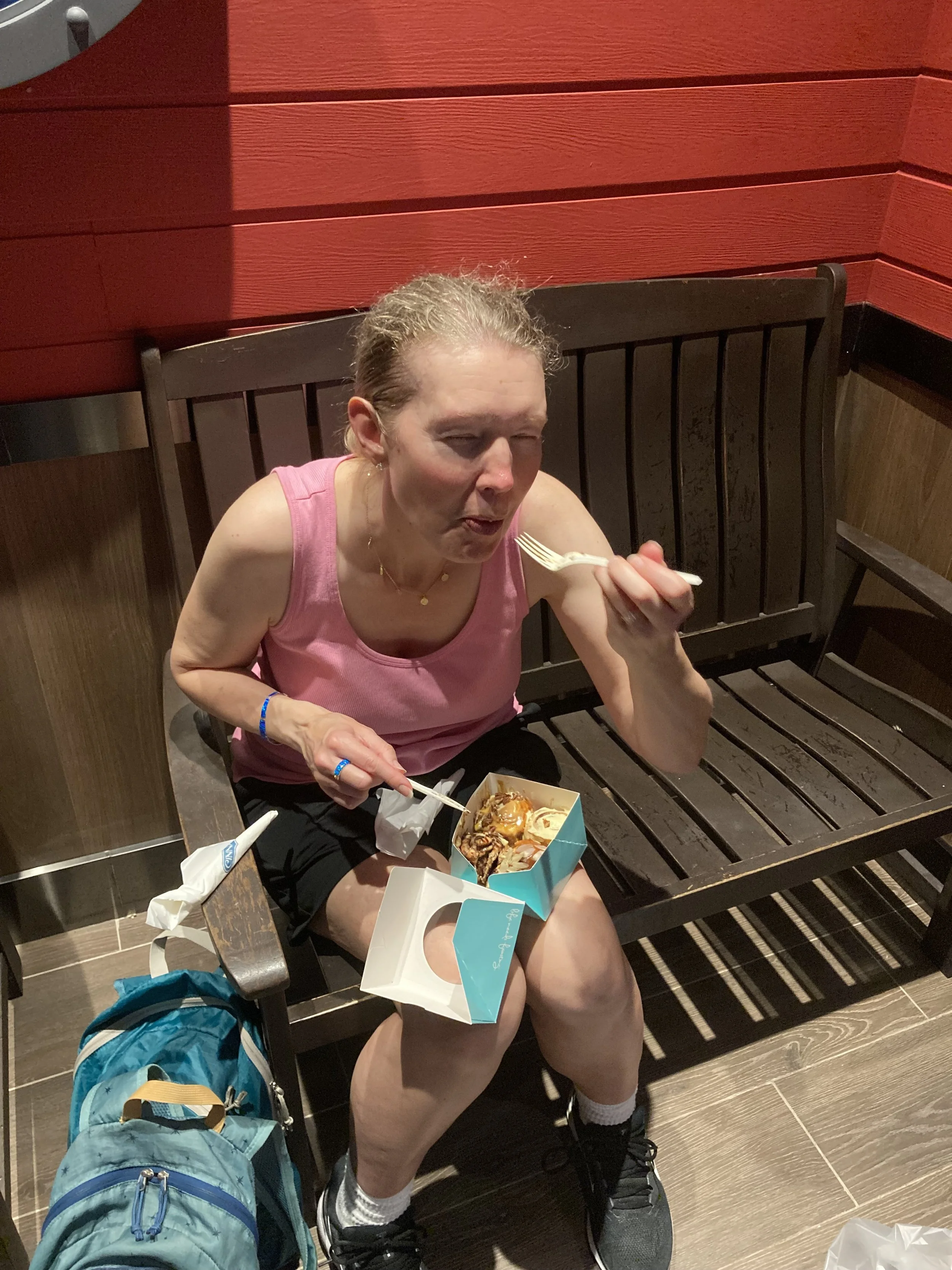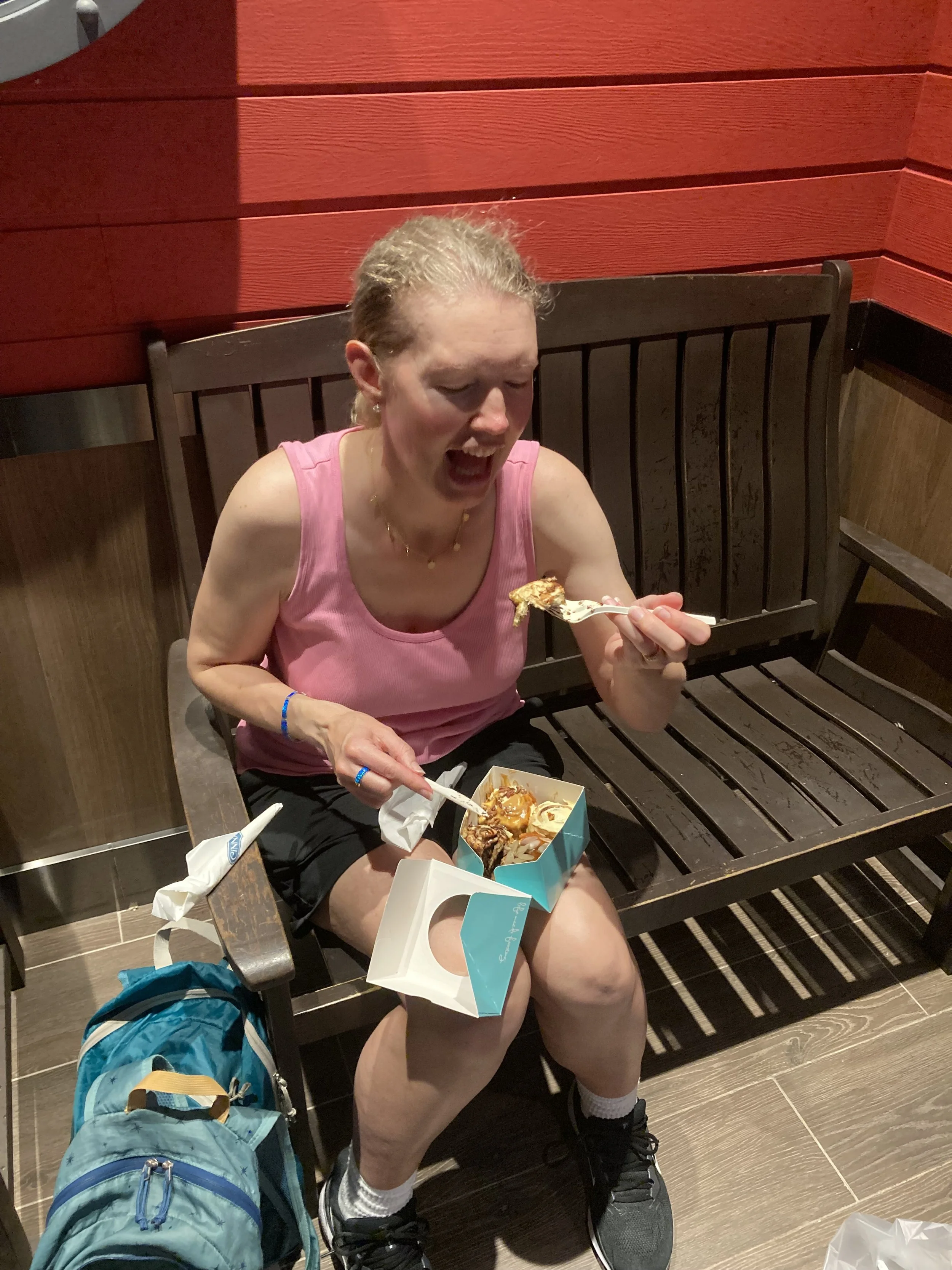 But here’s the thing. We wanted some plane snacks for tomorrow, so we went to the local mall and Elena picked up some of her favorite snack (cashews) and I grabbed some Brazil Nuts and Macadamia nuts. On the way out, we found our first Cinnabon that I’ve seen in more than 4 months. When Elena texted Violet, well, see for yourself: