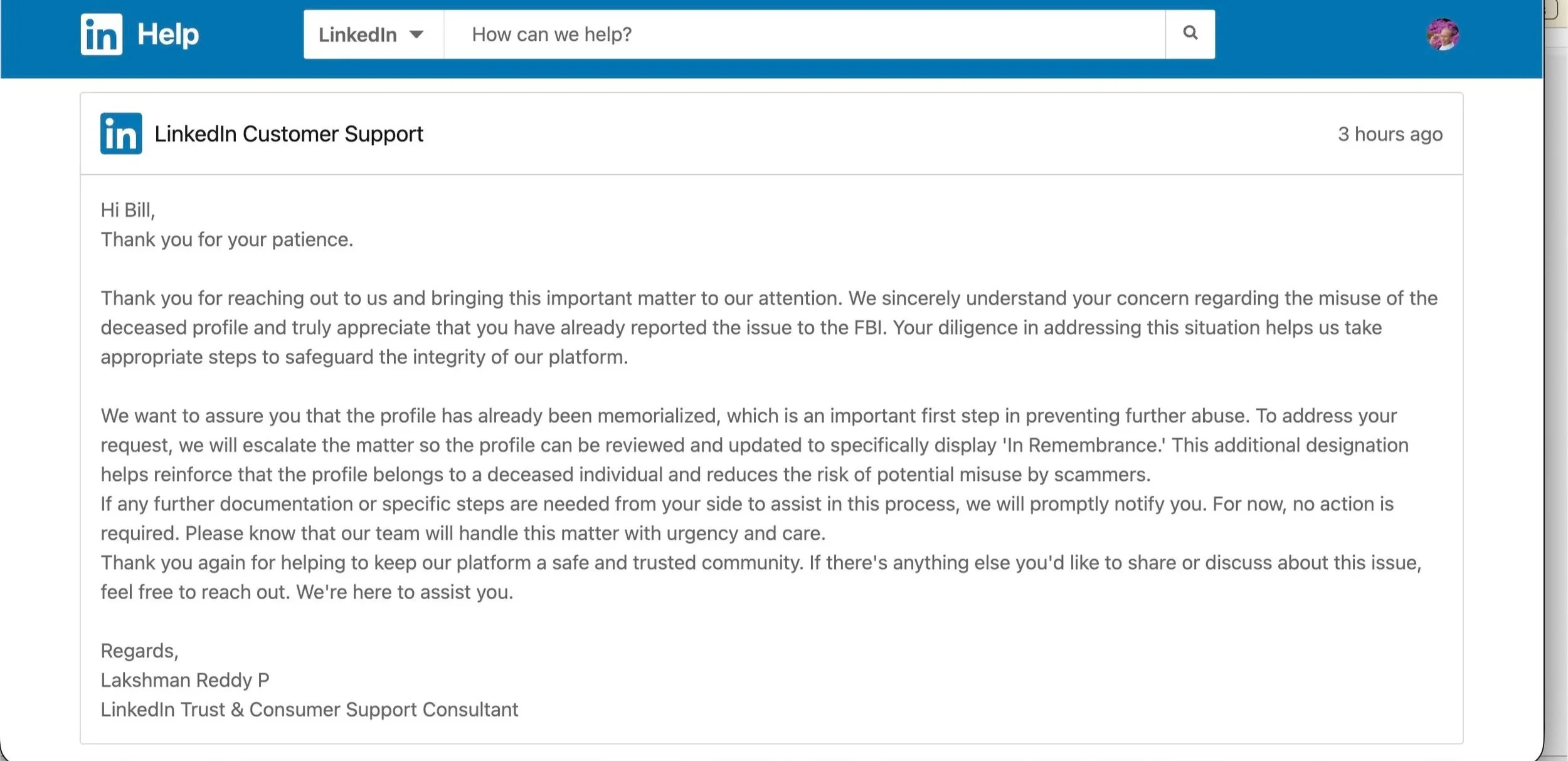 I’m also pleased with LinkedIn taking the time to respond directly to my outreach (and not just auto-responding, but a real human following up). This meant a great deal to me as it means our reports made it to the right decision makers who took immediate action (in less than 48 hours) which, again, I sincerely appreciate and honors the memory of the real Anna Perez.