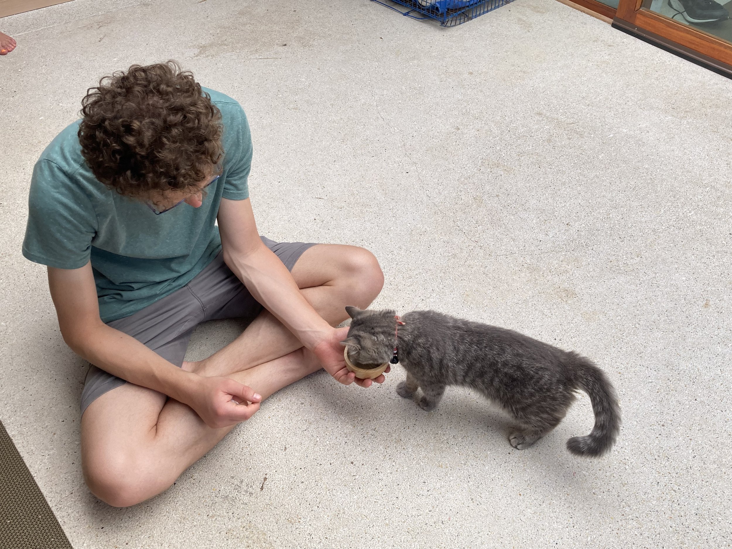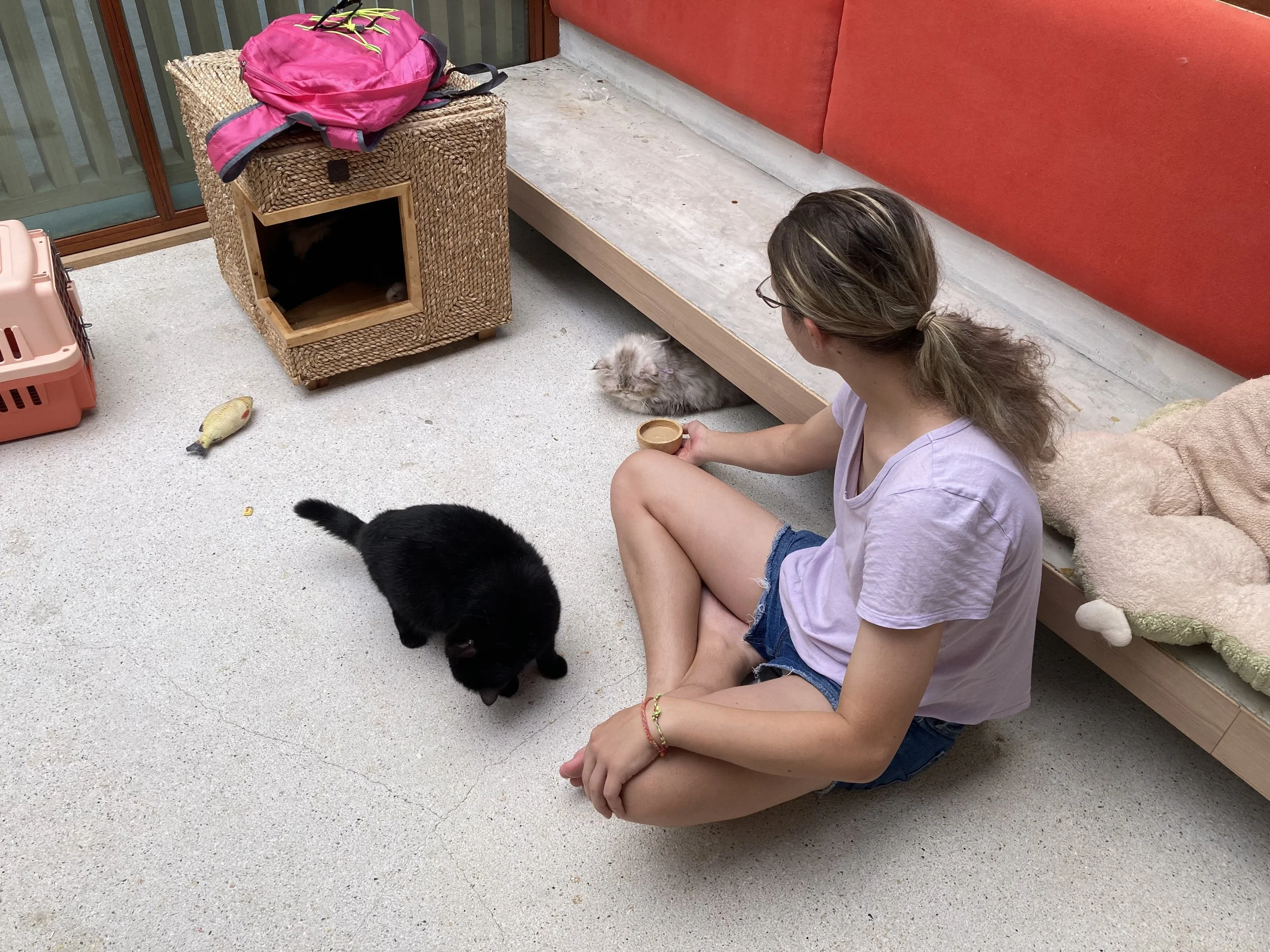 This particular cat cafe is called Love Rawai Cat Cafe. It’s walking distance from our AirBnb and is the best deal going when it comes to cat cafes we’ve visited so far on this trip around the world. The 120 THB (about $4) included at least 15 minutes with cats just the four of us and included cat treats to feed our new friends.
