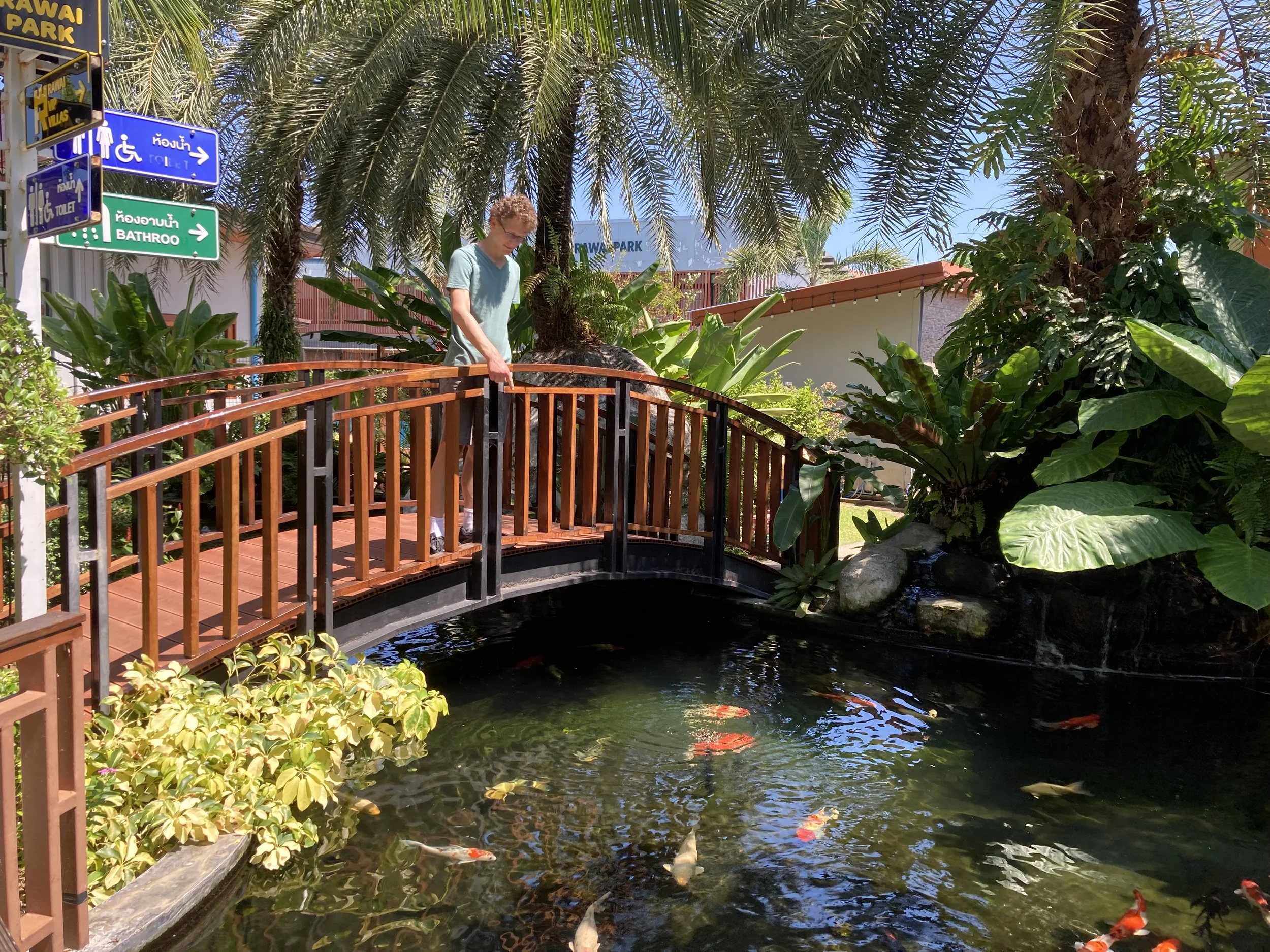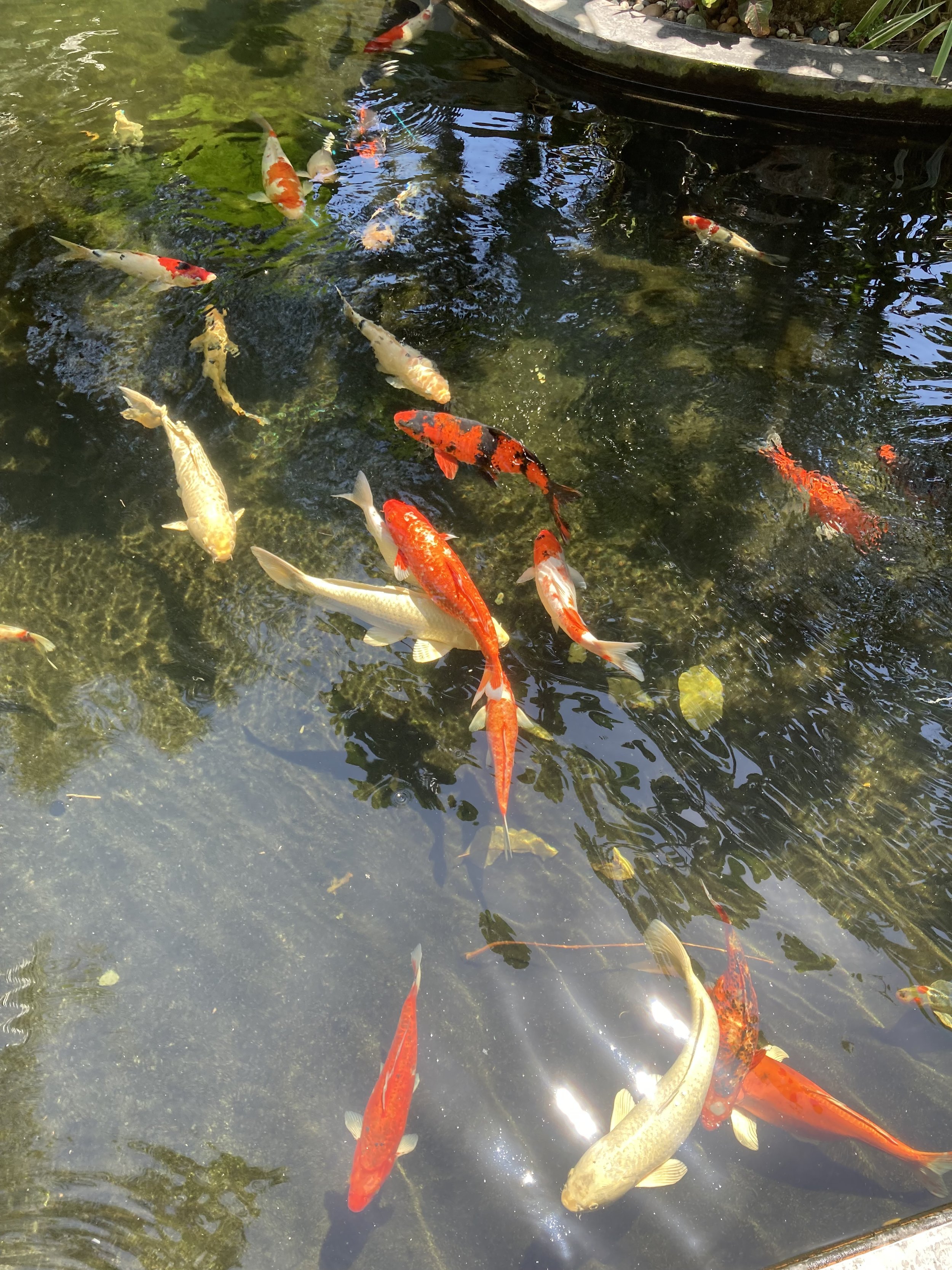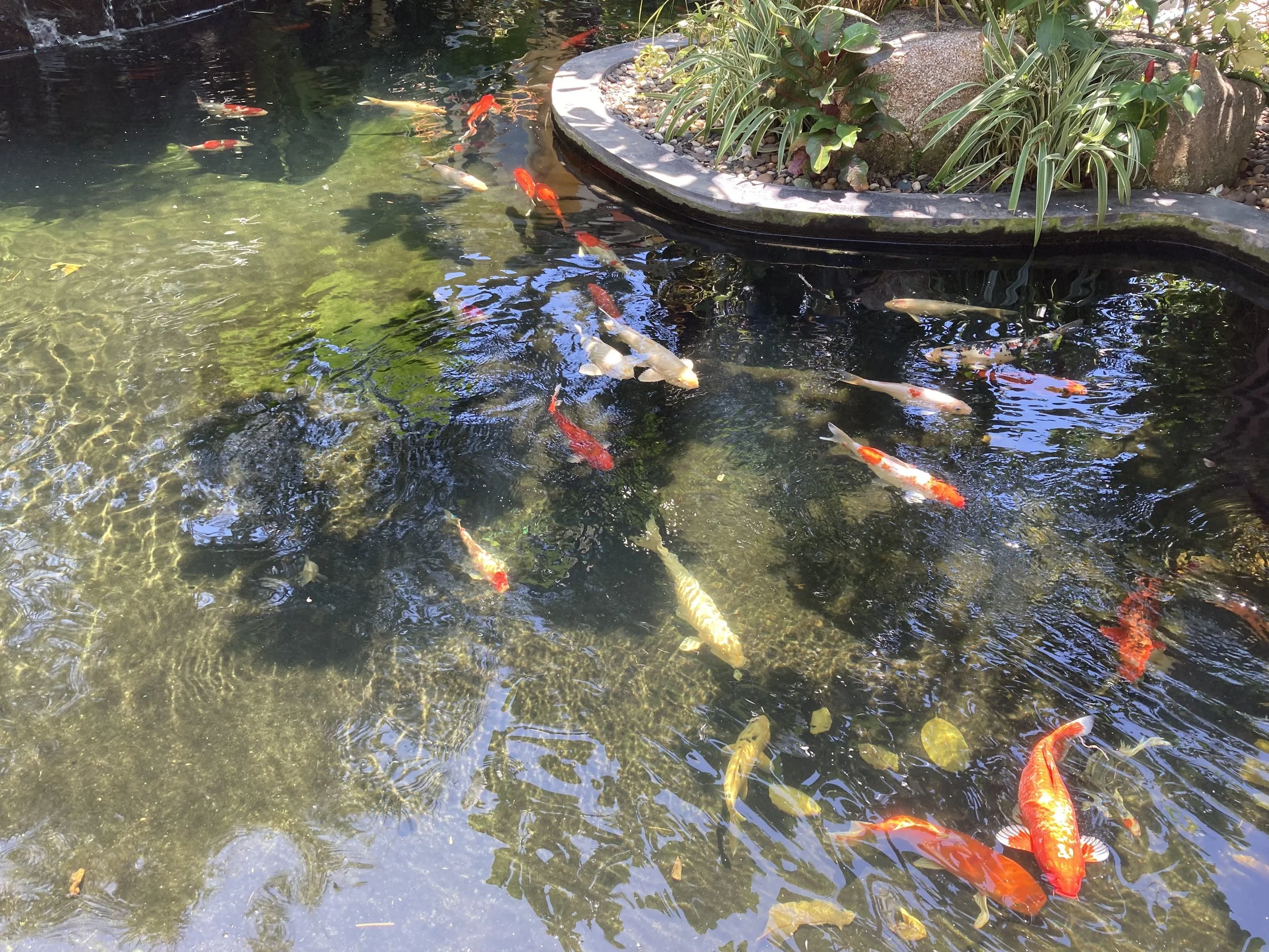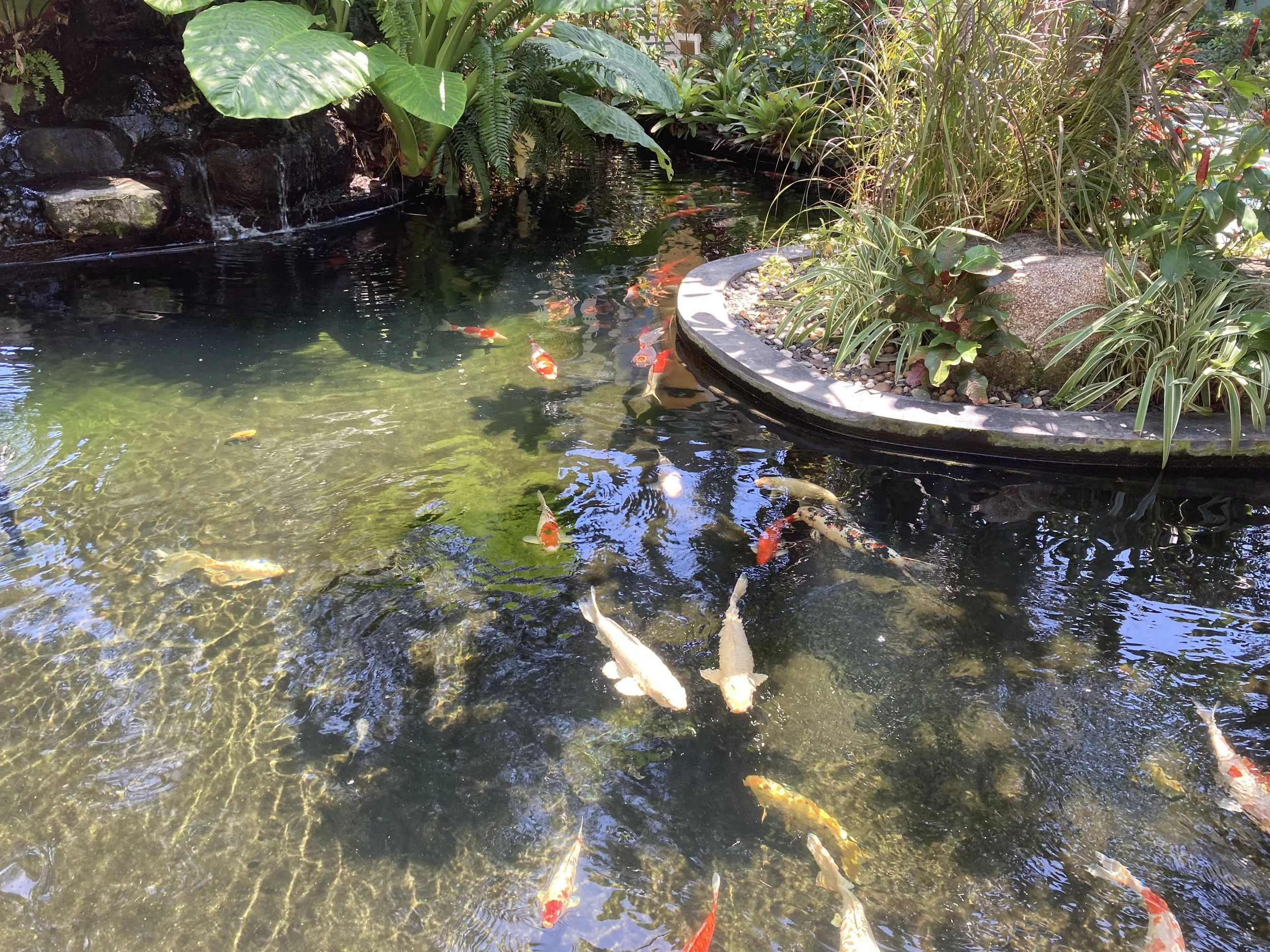 Lastly, there’s a beautiful koi pond right in front of the cat café. It’s not that we needed more animals to admire, but since it’s right there, we stopped and took in the many beautiful looking koi fish. Will spotted a black one with an unusually long tail. Of course, it’s hard to capture this with an iPhone given the dark color of the pond and a black fish, but it was cool to watch swimming around the other fish.