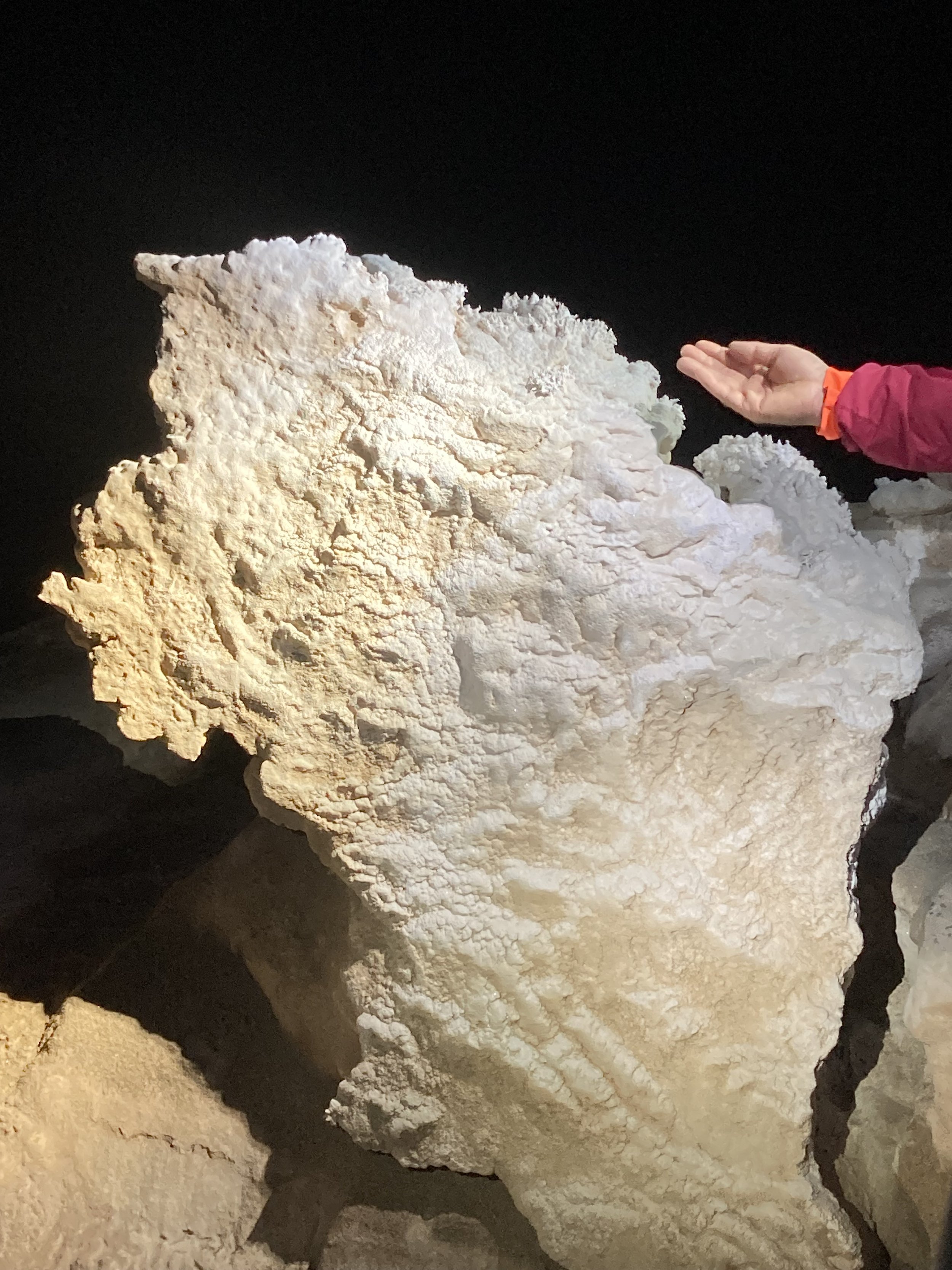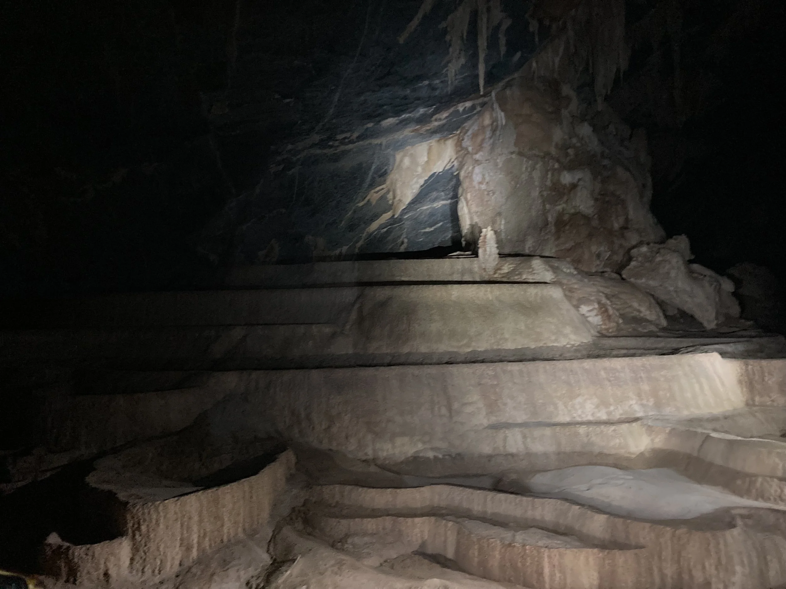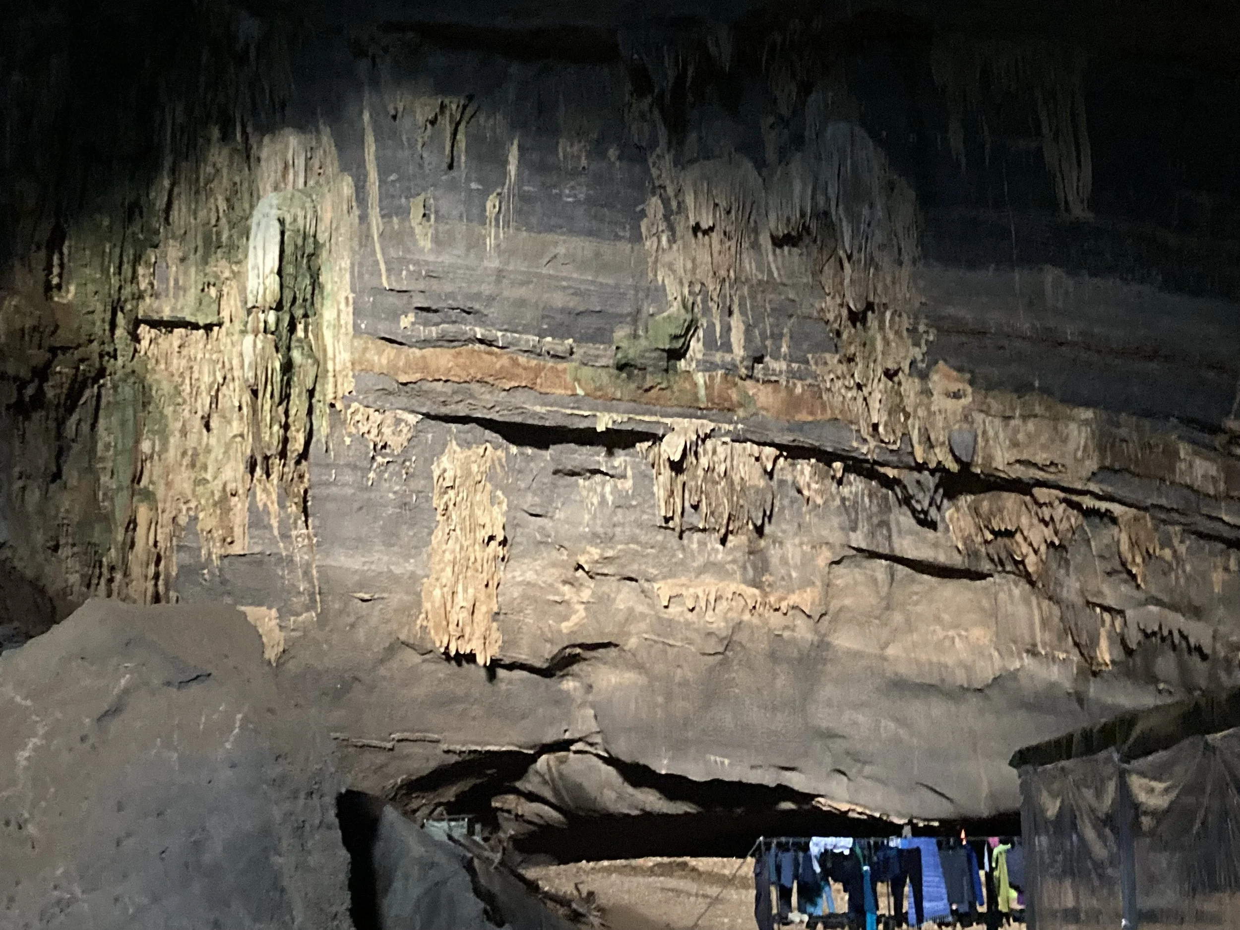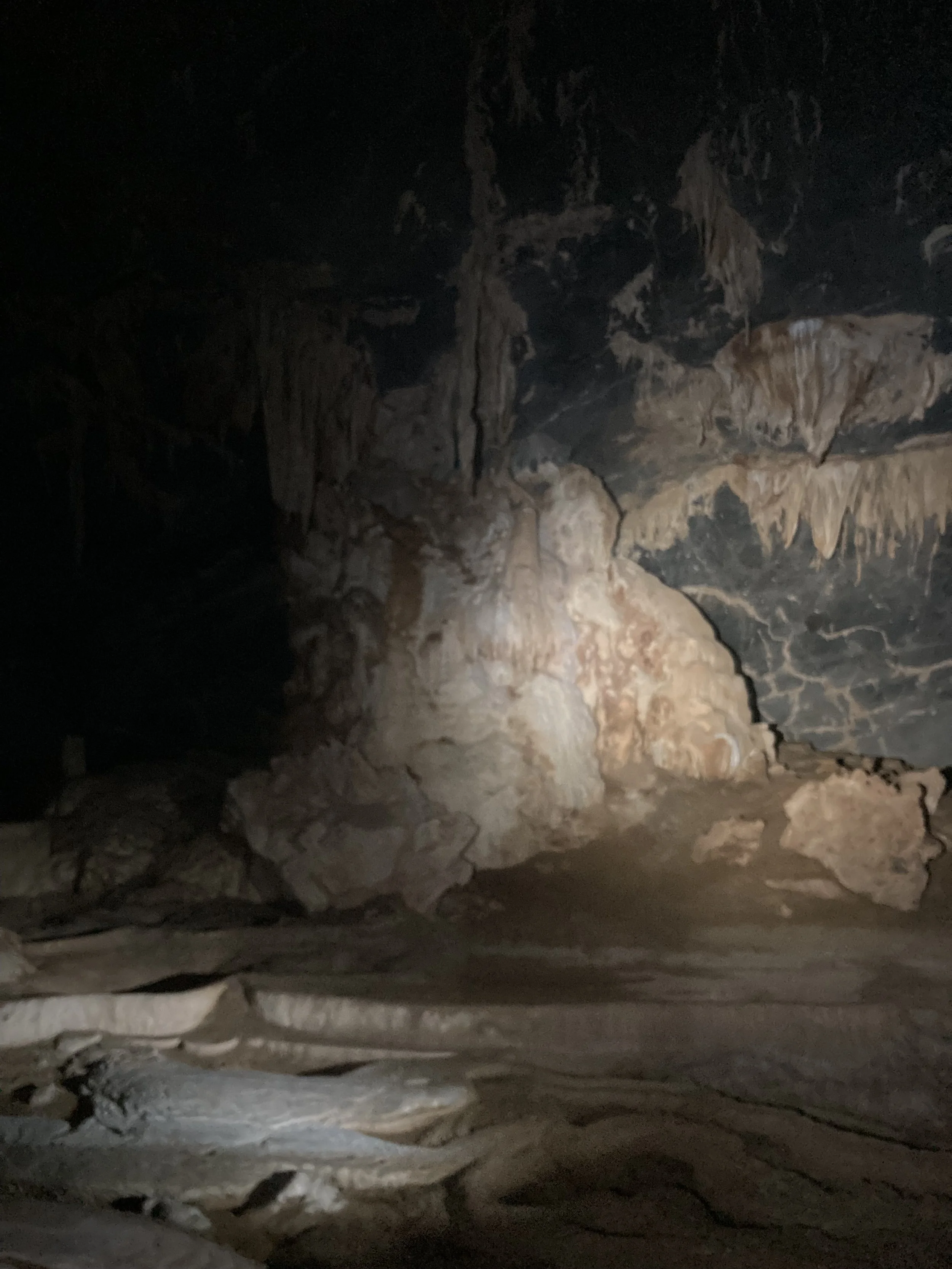 (FYI, Parts 1-3 were covered in yesterday’s blog if you missed it.) After a breakfast of crepes with bananas and Hershey’s Chocolate Syrup, as well as noodles with meat and vegetables, we put on our gear and hiked further into the cave. There was a rocky path behind where we were camped and it led us deeper into the cave itself. This is where we would view the fossils trapped in the rock of the cave and explore the different shapes made by the stalactites, stalagmites and columns (which is what you call it when stalactites and stalagmites connect).