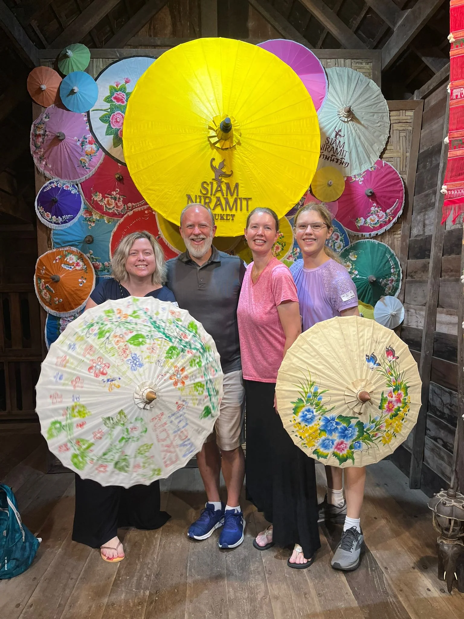 Claire, Bill, Elena and Violet playing with parasols in Phuket
