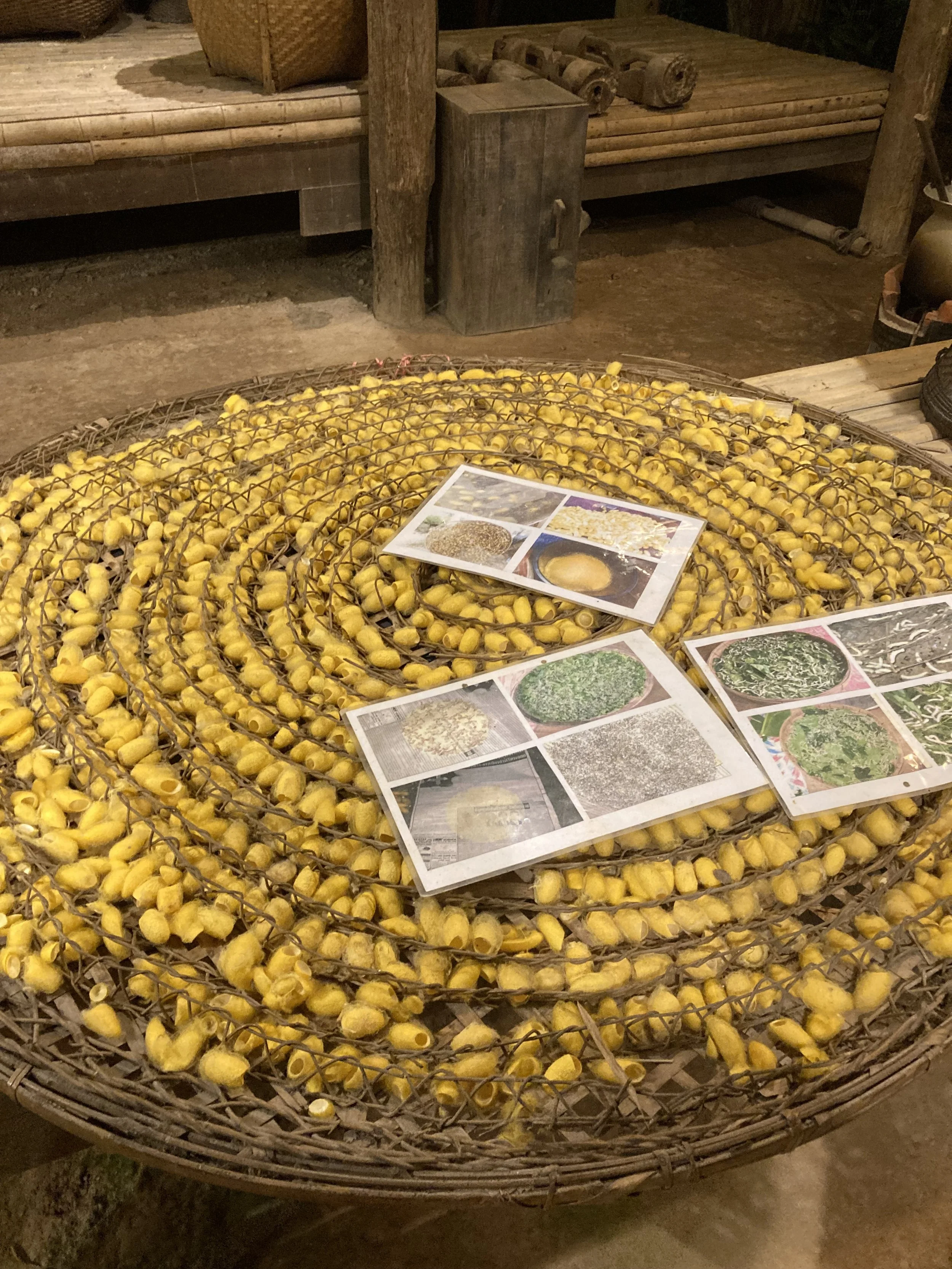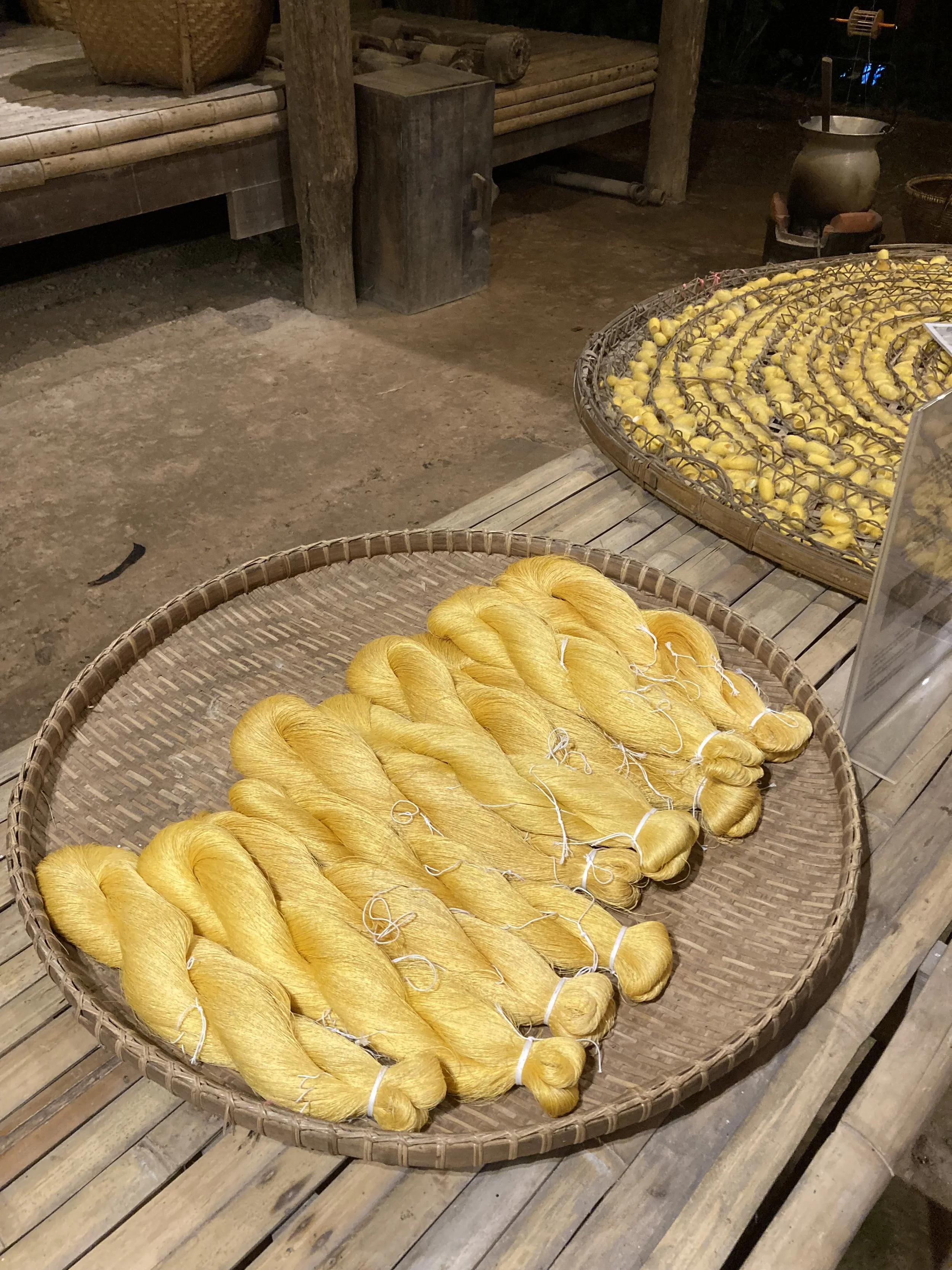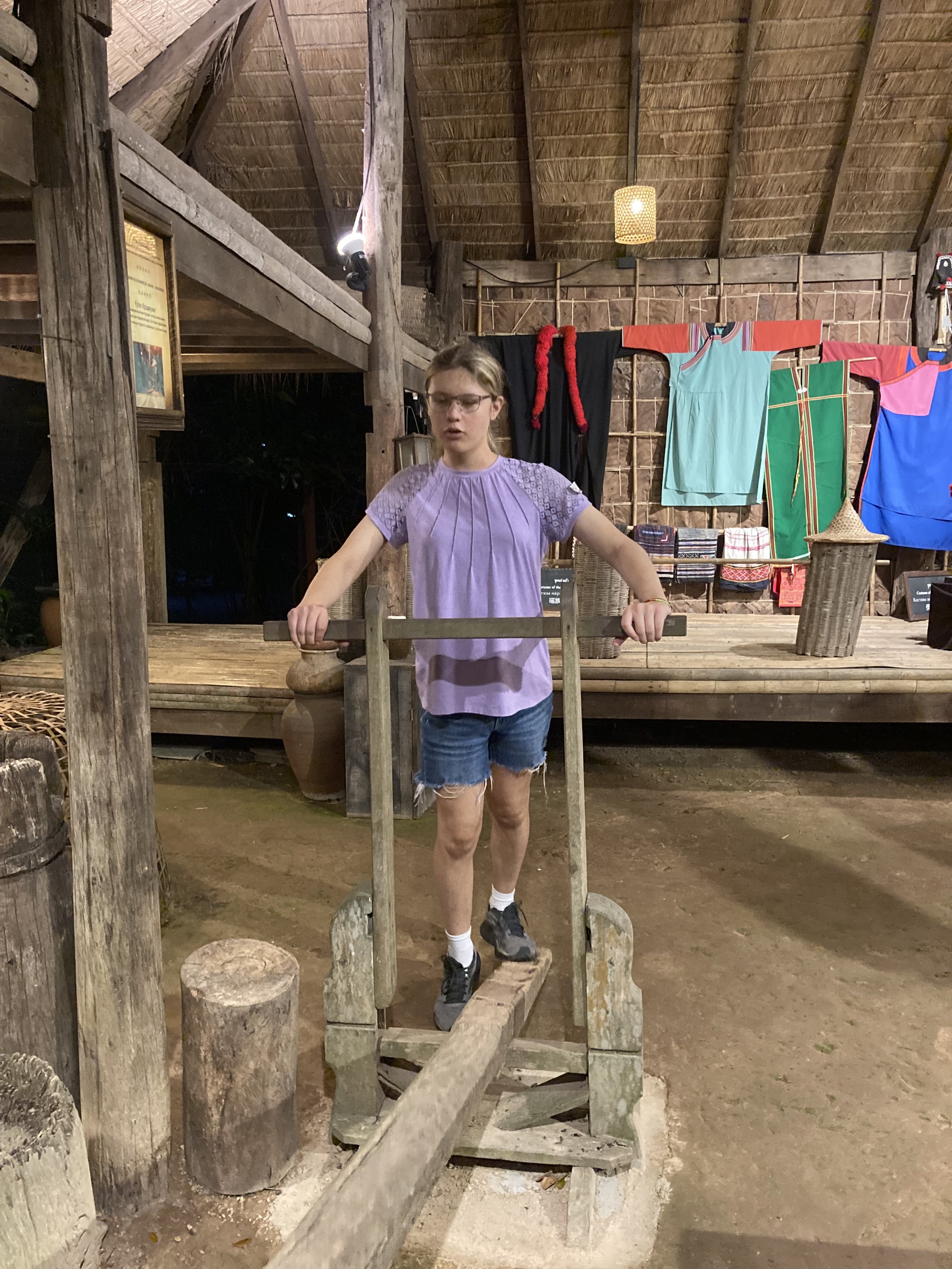 After the boat ride, we poked around the rest of the shops including some of the exhibits that showed how the silk was made and then woven into various materials. Violet was fascinated by the use of an early seahorse to break up and even grind up various grains.