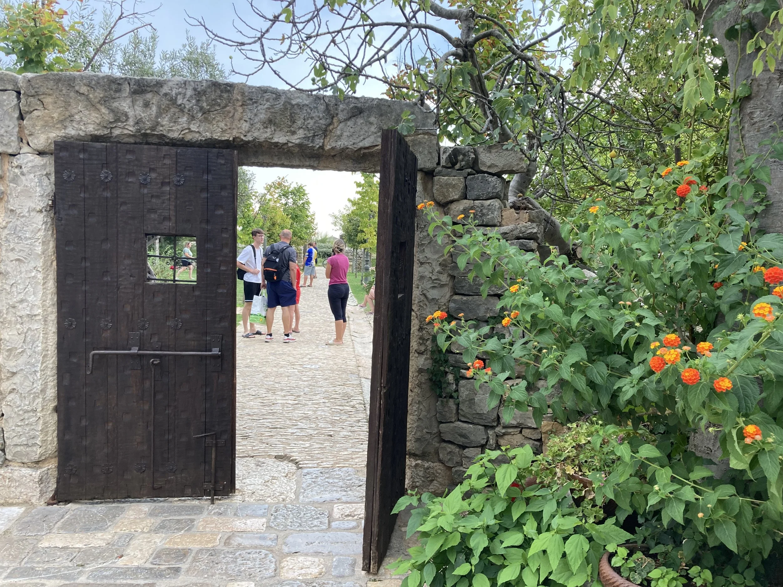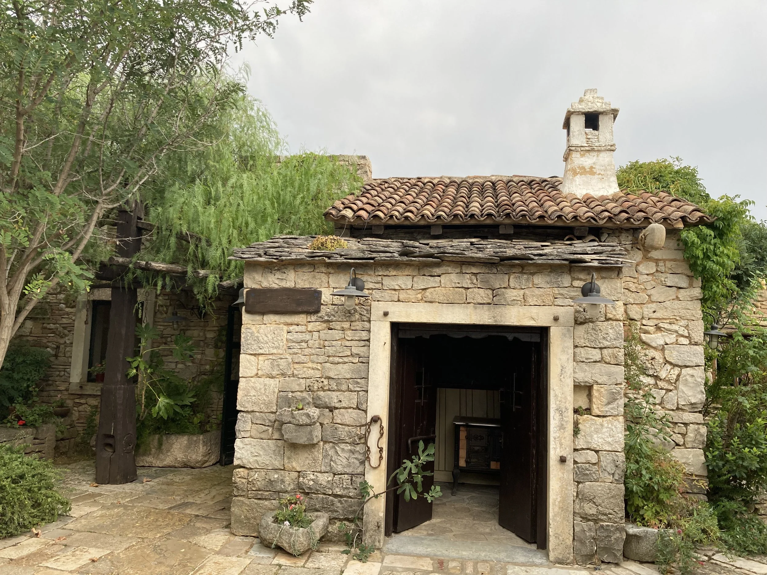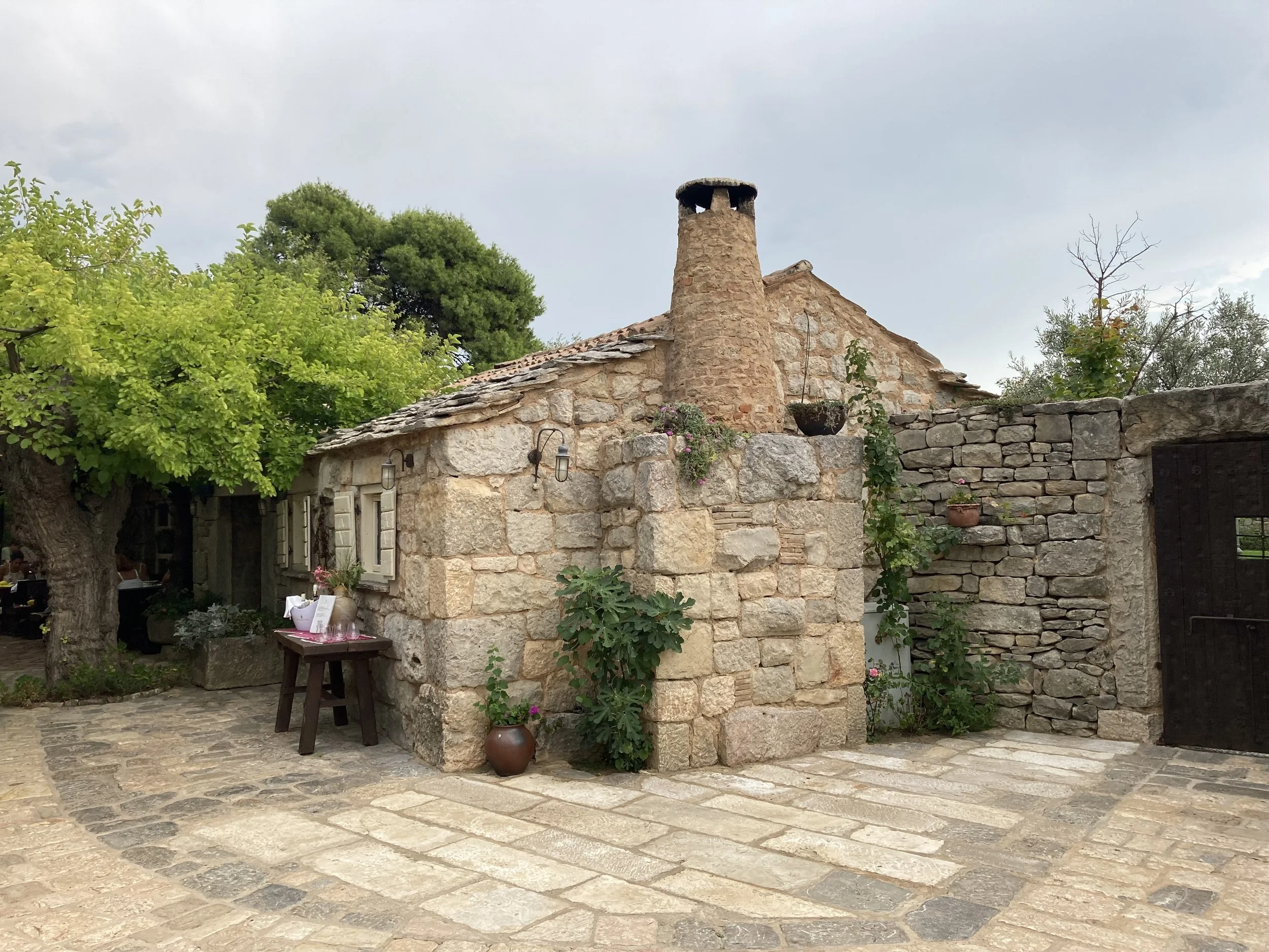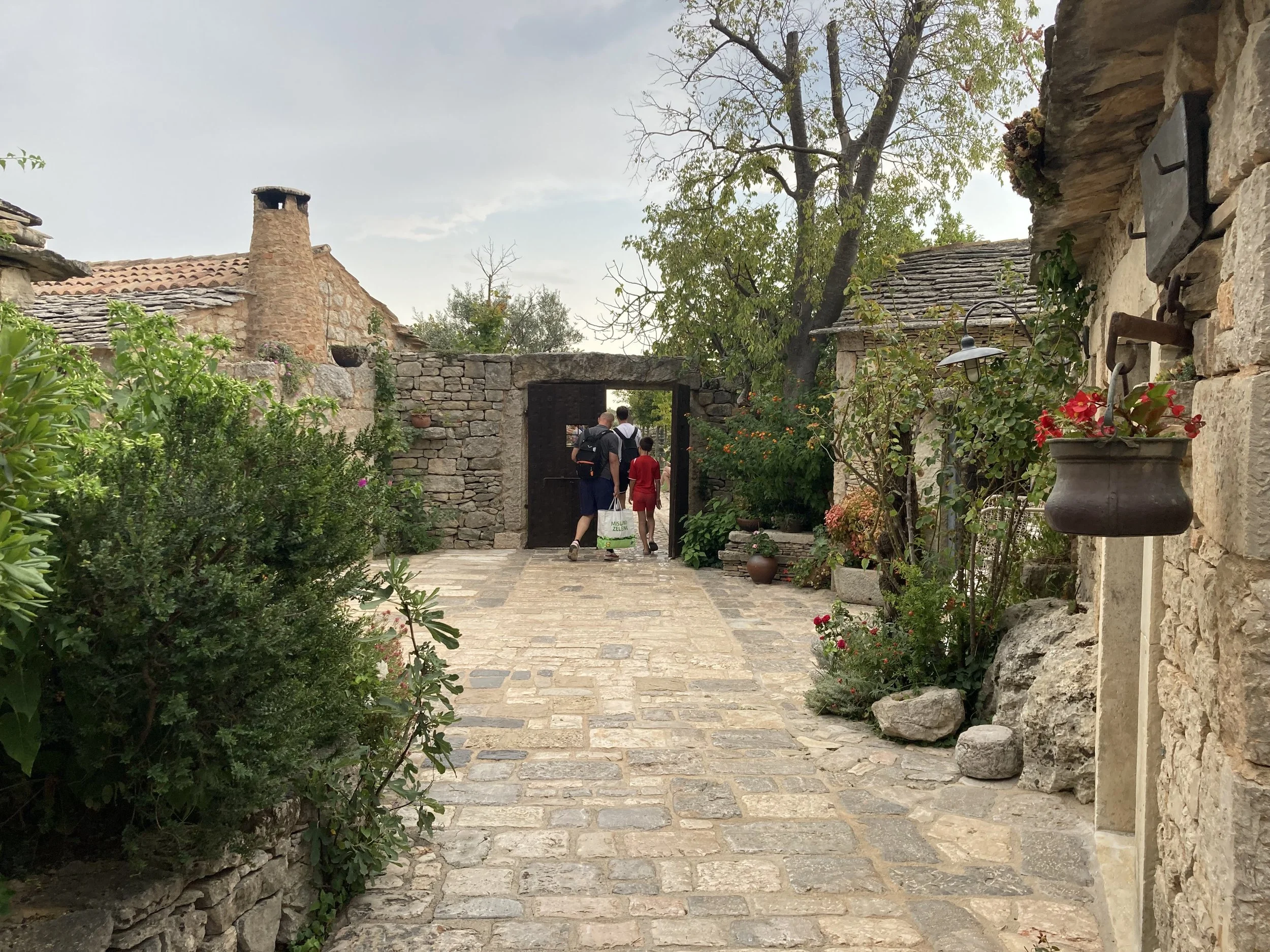 Walking so close to water made all of us want to get in. Knowing that we couldn’t do it here, we left the park and headed to a the sea to cool off. Along the way, we came across a unique restaurant that had integrated itself into an old town heritage site. That is, a rebuilt Croatian micro-community with smaller buildings where the tables were integrated into the “town” in a unique way: