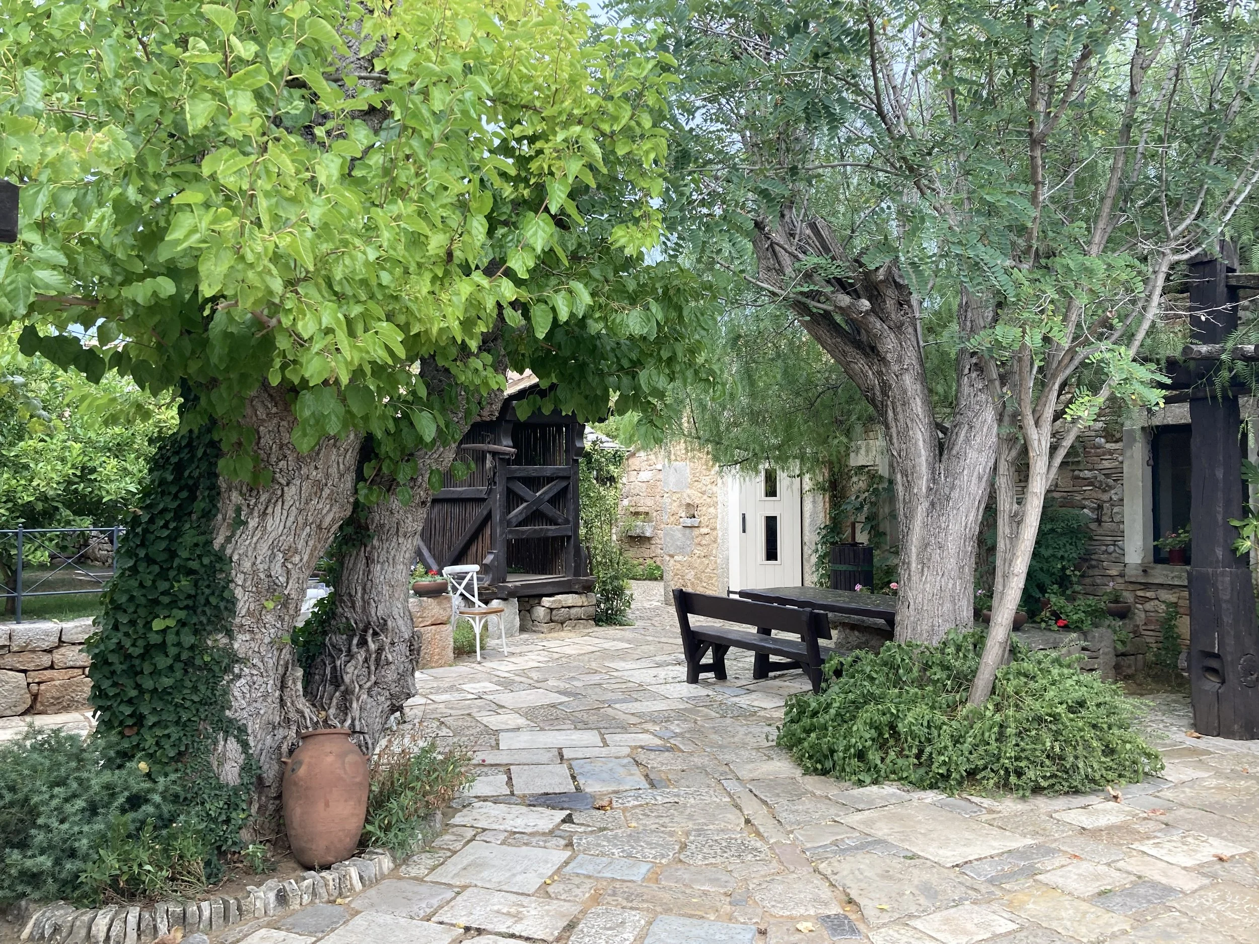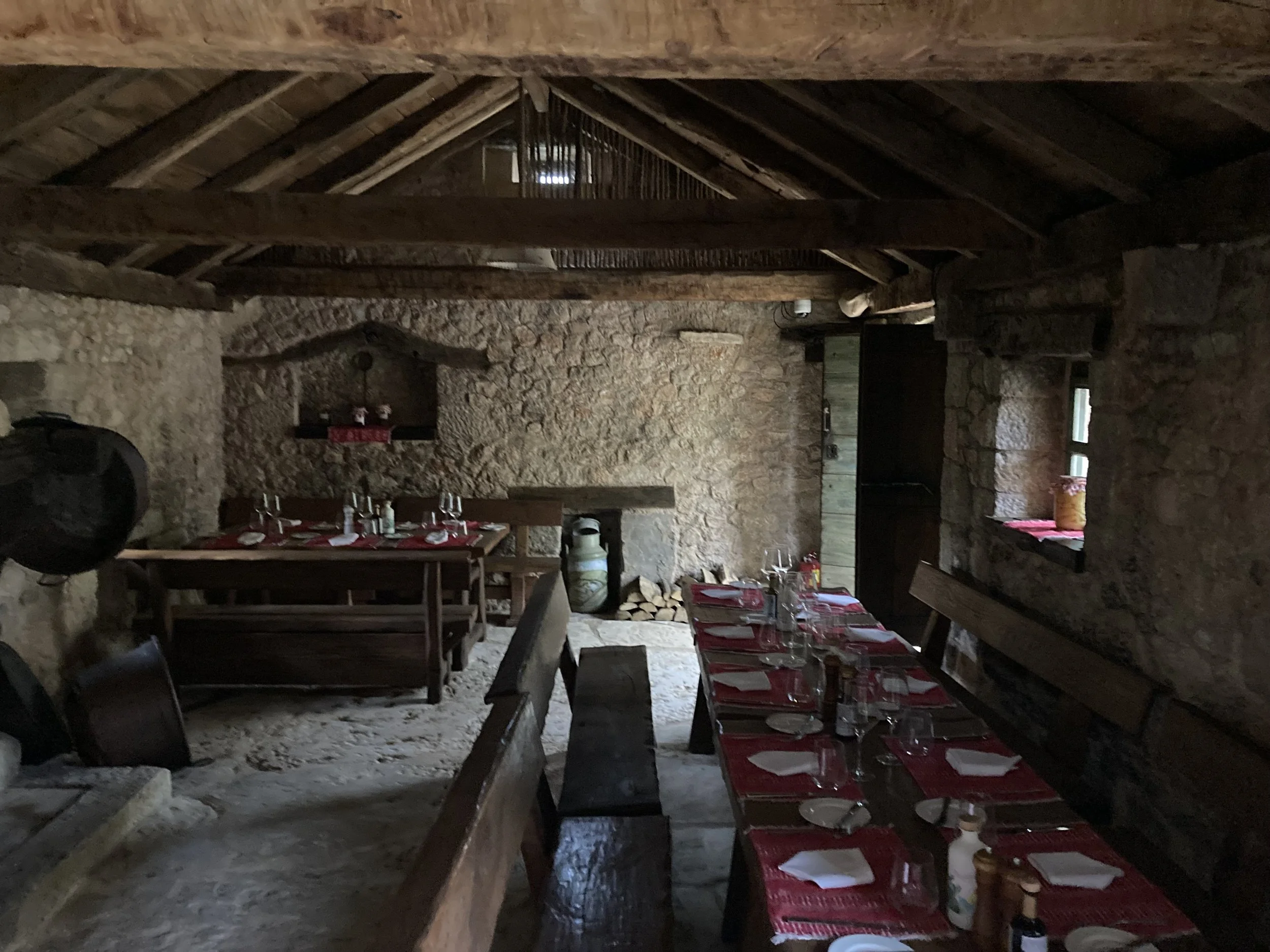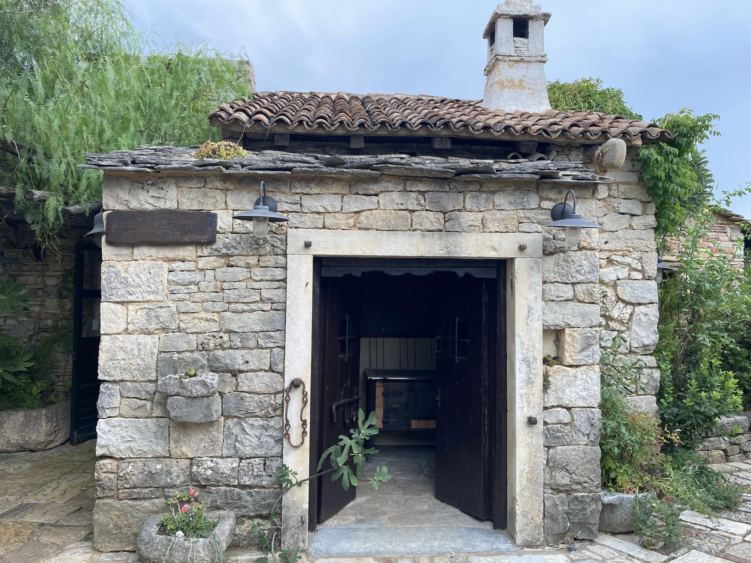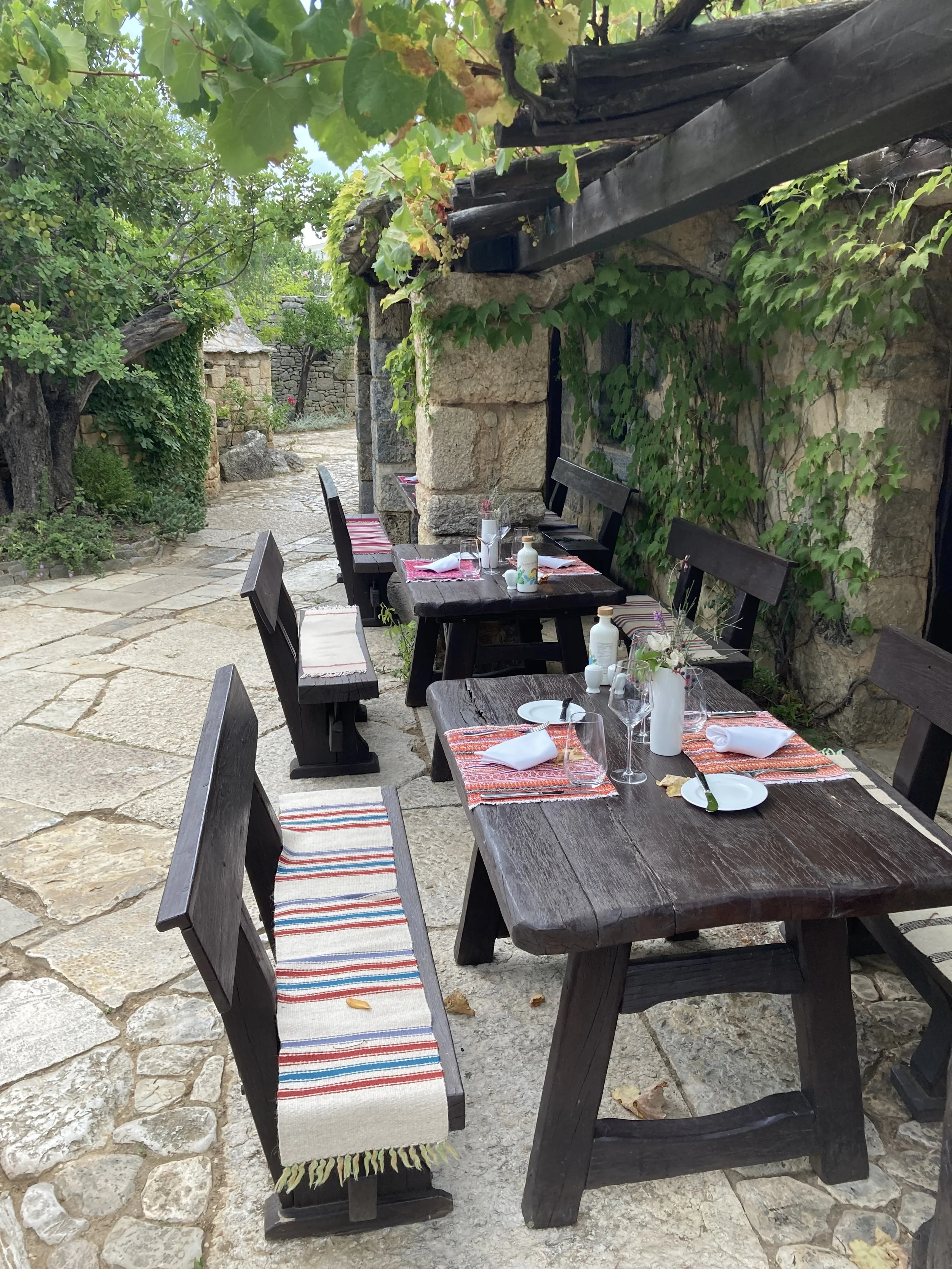 Walking so close to water made all of us want to get in. Knowing that we couldn’t do it here, we left the park and headed to a the sea to cool off. Along the way, we came across a unique restaurant that had integrated itself into an old town heritage site. That is, a rebuilt Croatian micro-community with smaller buildings where the tables were integrated into the “town” in a unique way: