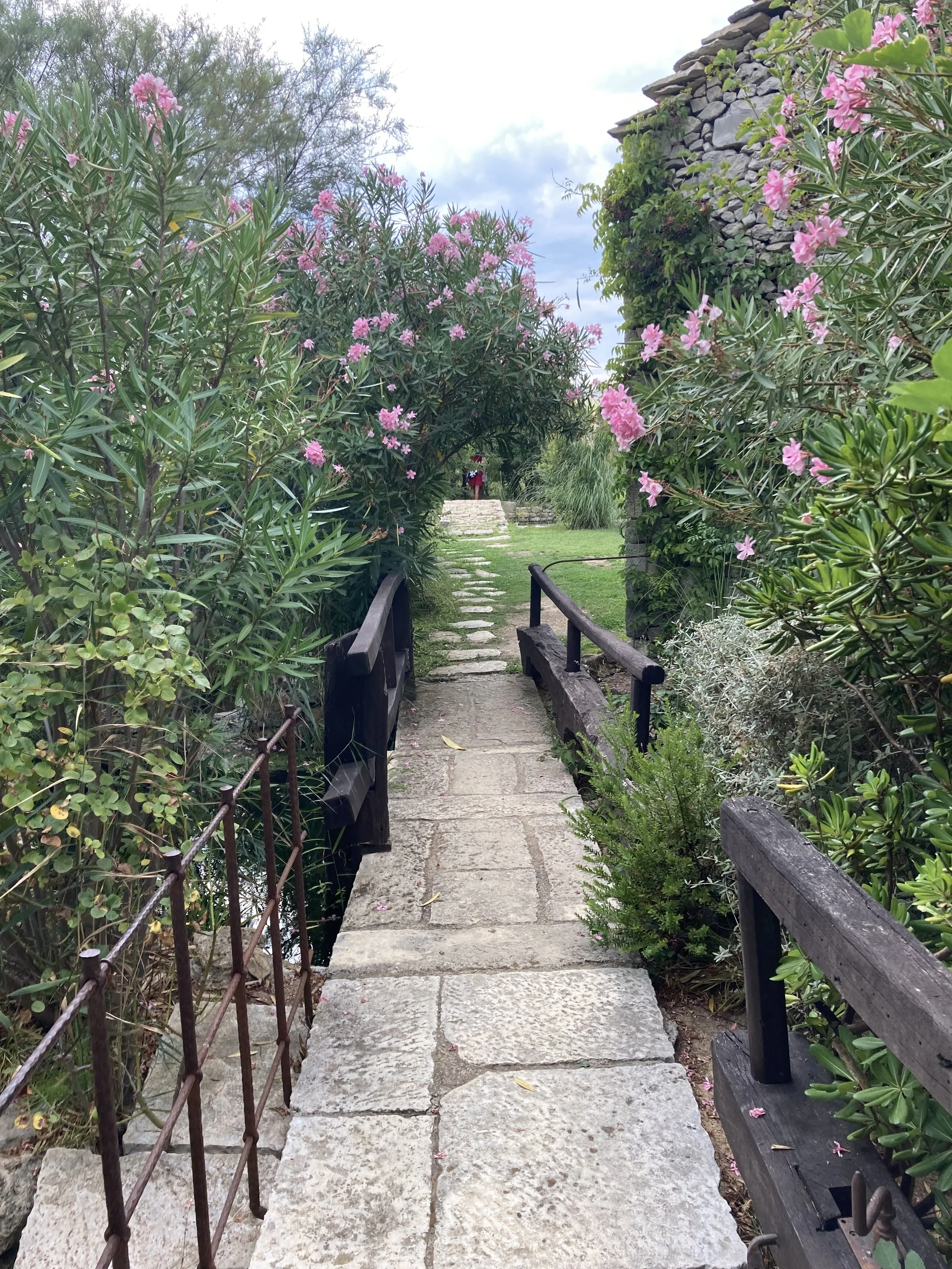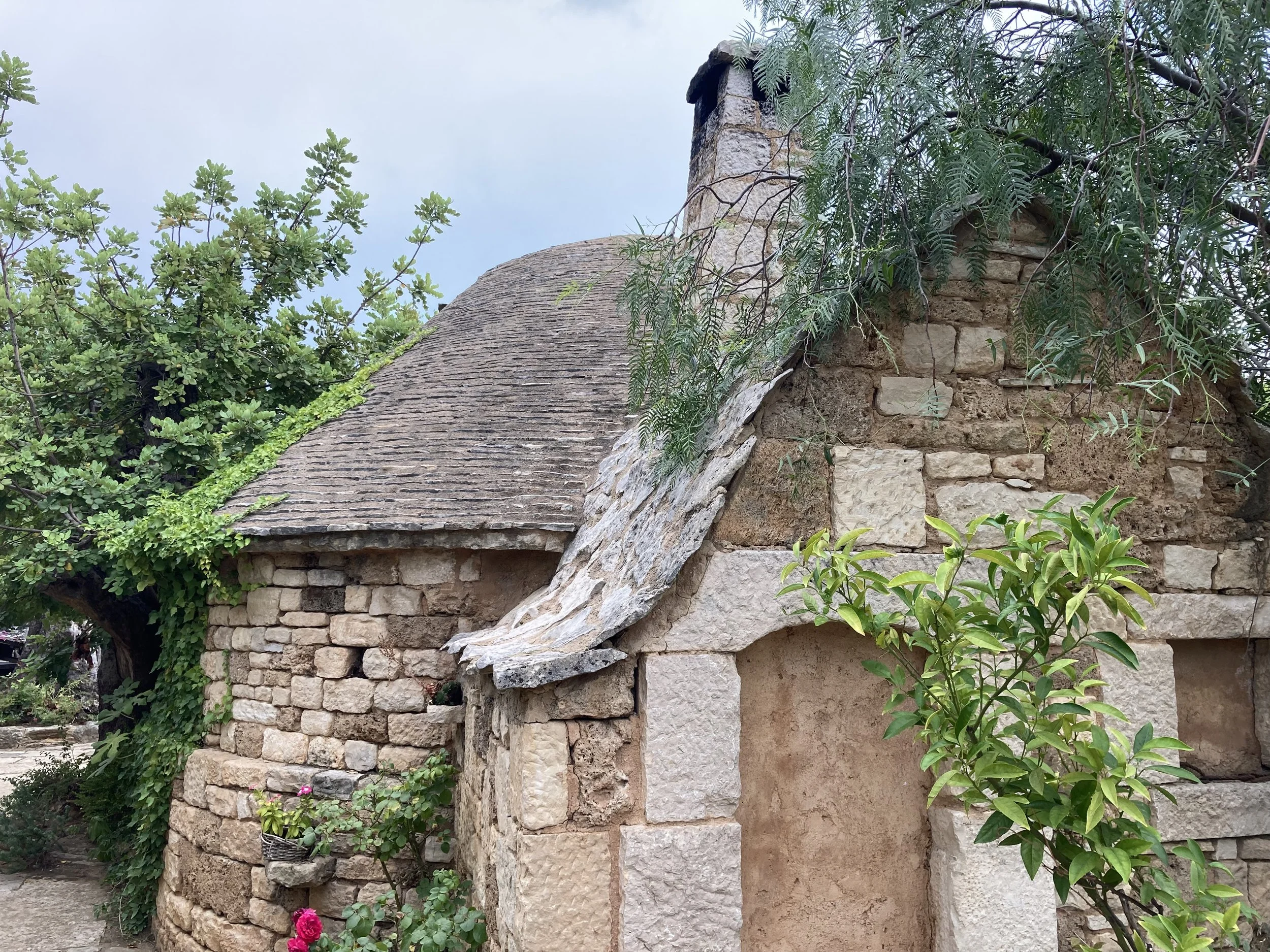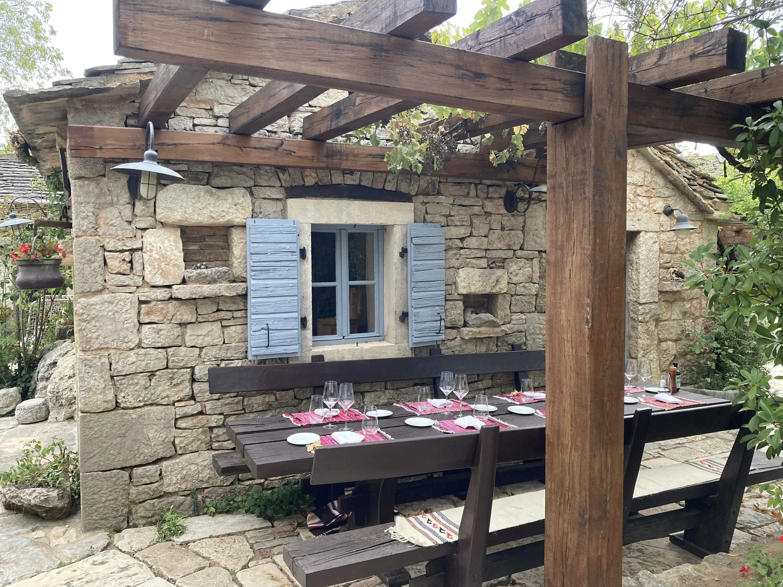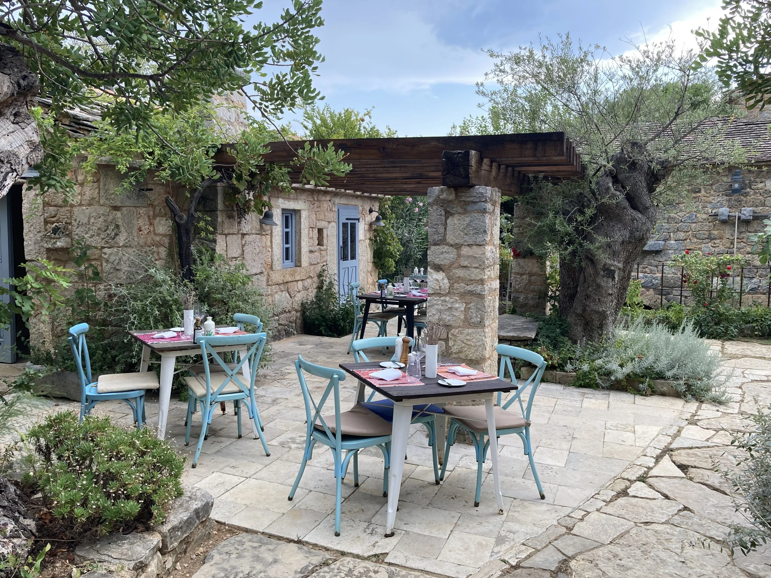 Walking so close to water made all of us want to get in. Knowing that we couldn’t do it here, we left the park and headed to a the sea to cool off. Along the way, we came across a unique restaurant that had integrated itself into an old town heritage site. That is, a rebuilt Croatian micro-community with smaller buildings where the tables were integrated into the “town” in a unique way: