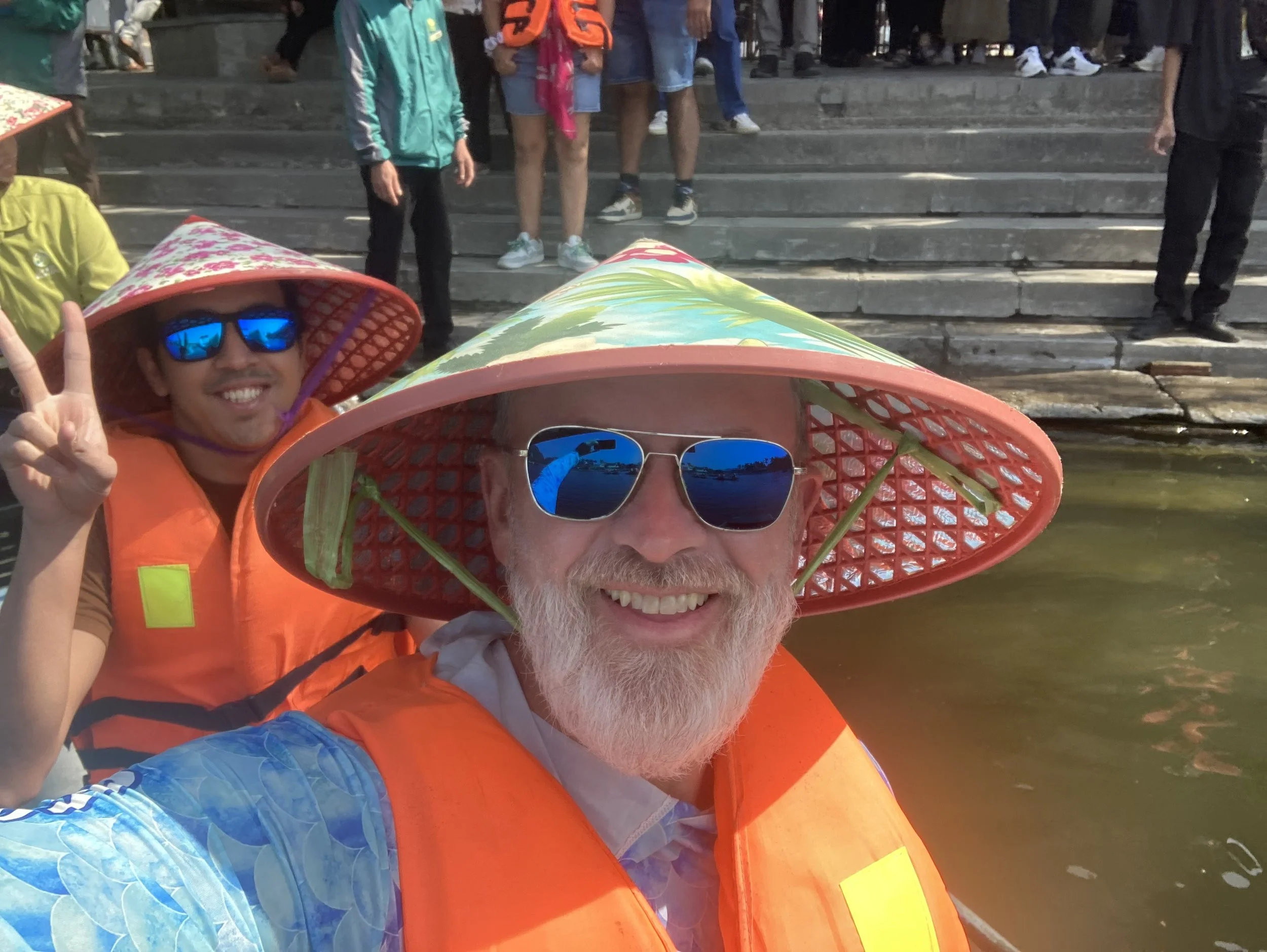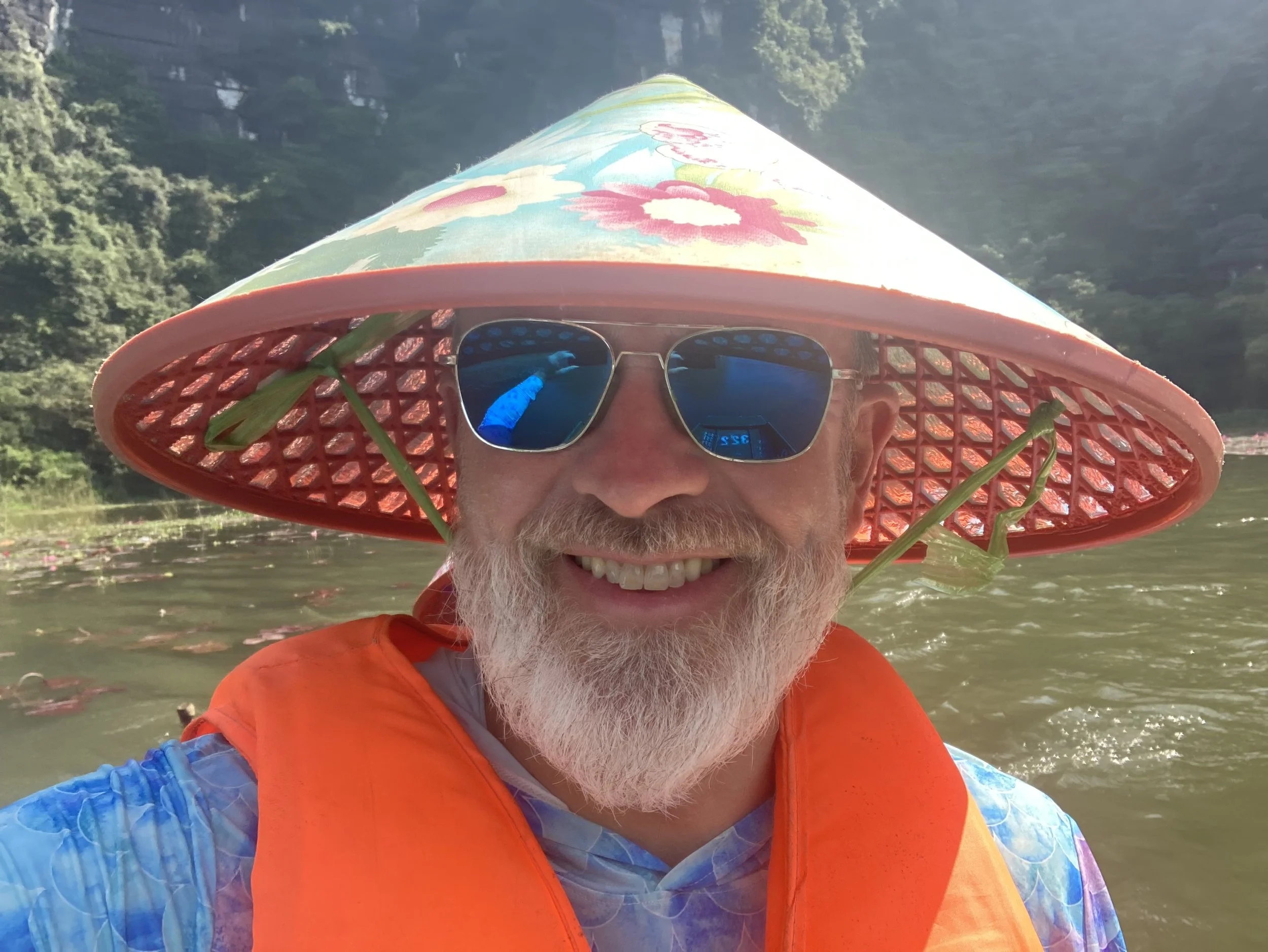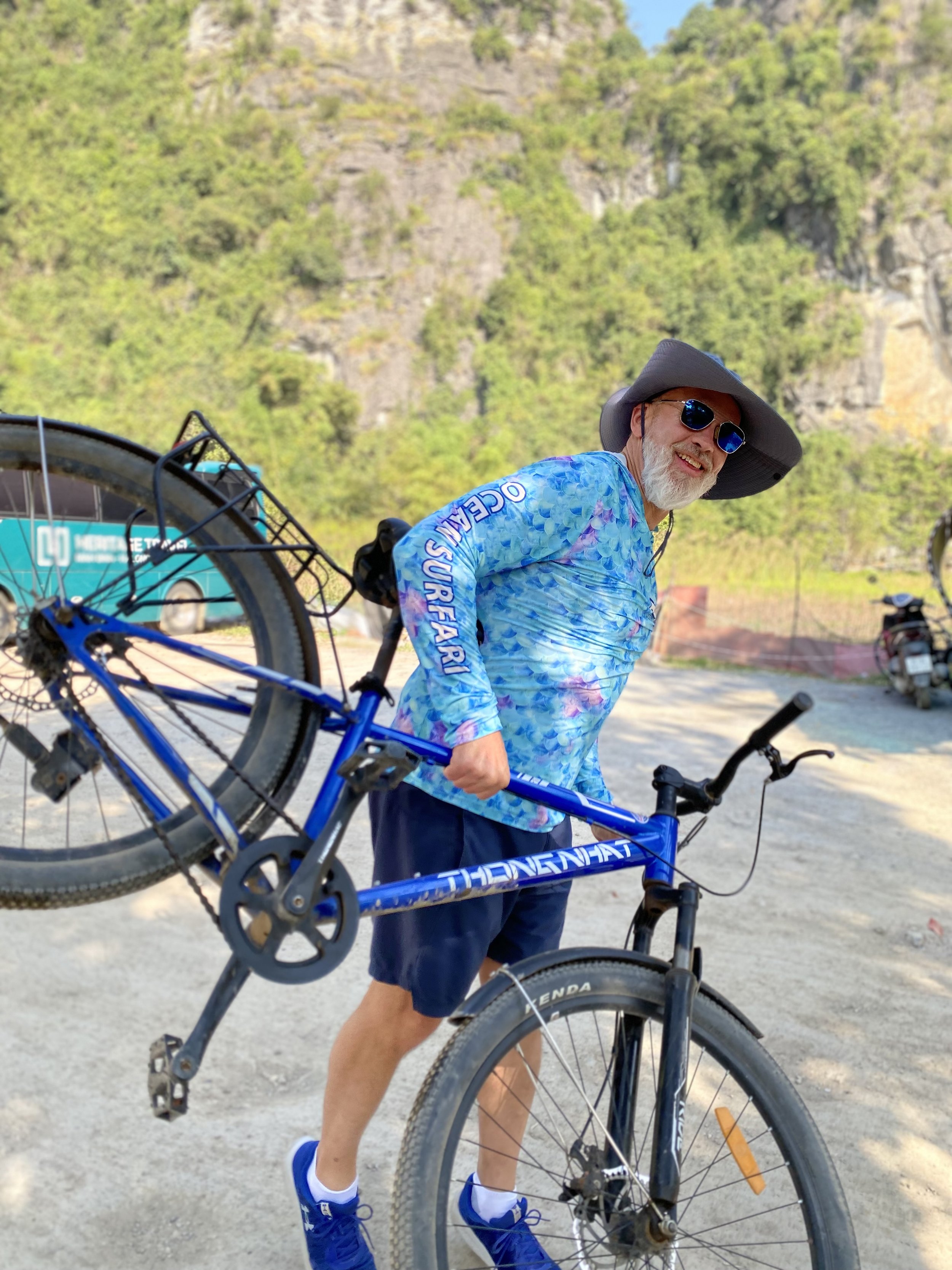 Yes, I love the hat they gave me to protect my face from the sun. Sure, I could have worn my own large brim hat, but when in Vietnam … Besides, it added to the whole day and certainly to all the pictures. Our guide flawlessly drove us with her FEET and legs the whole way — several miles. It was about a 2 hour journey from start to finish.