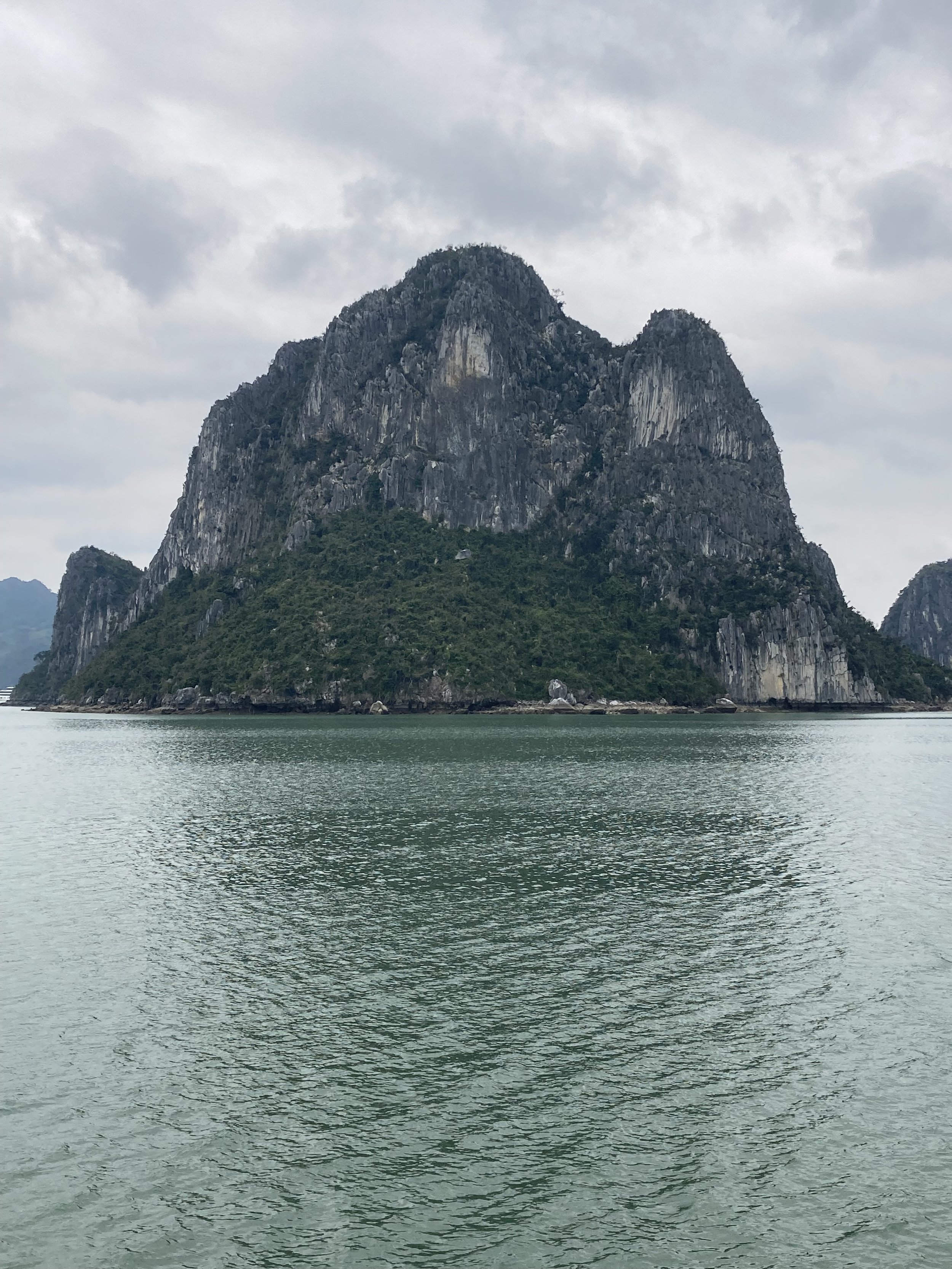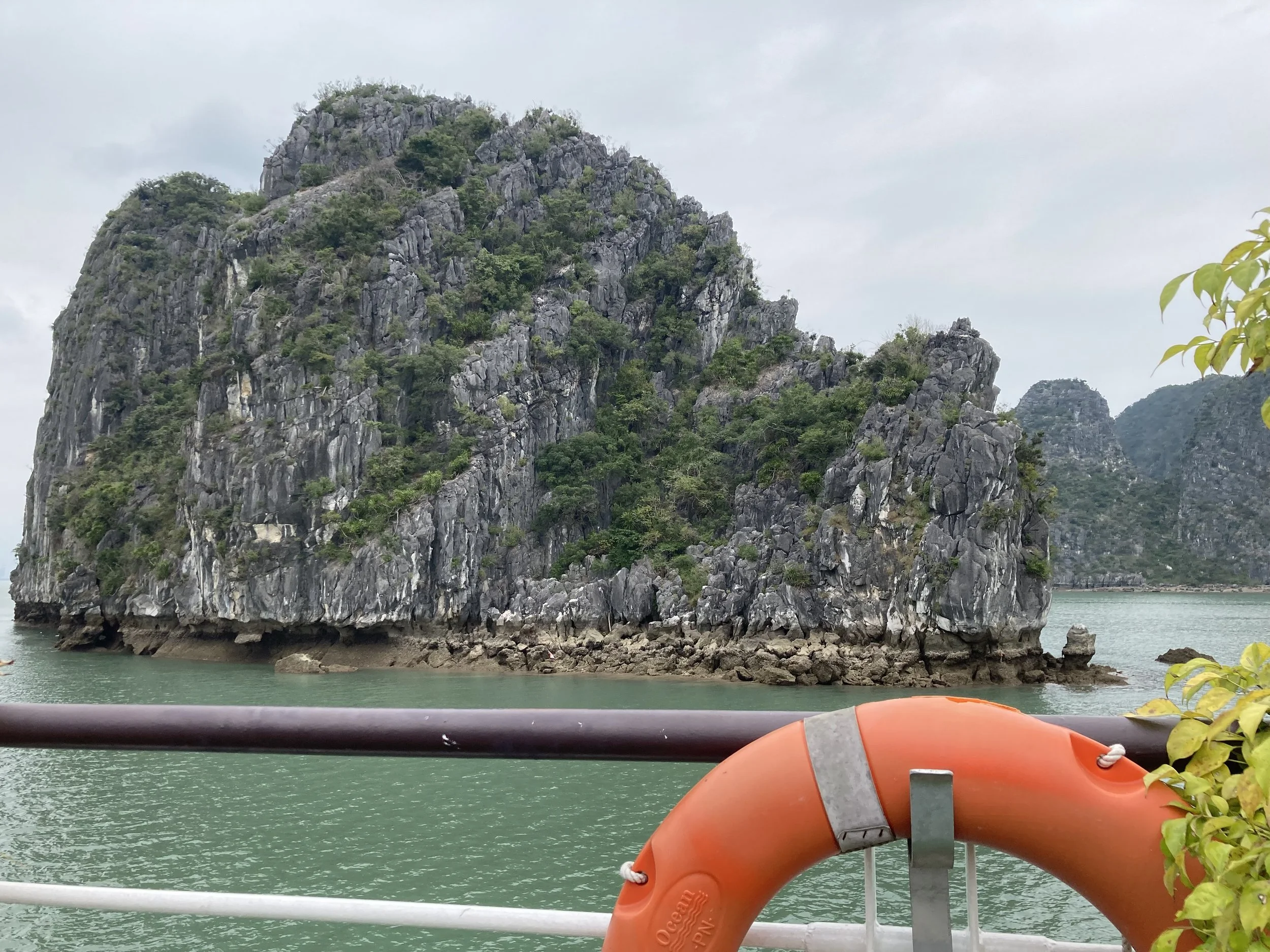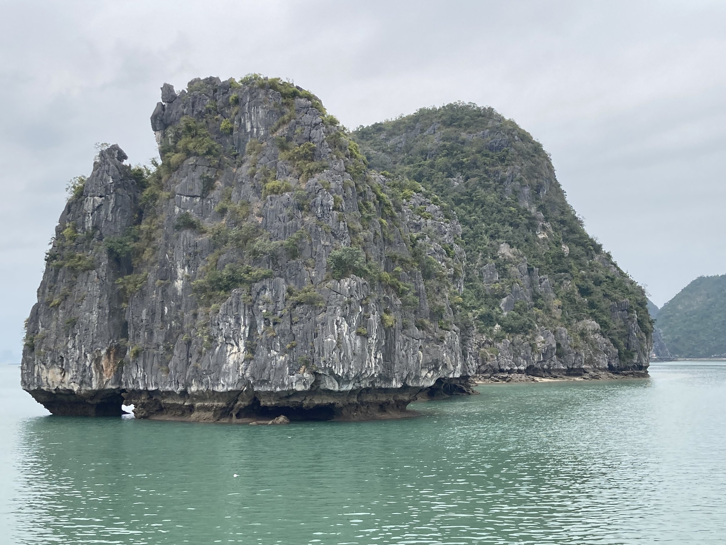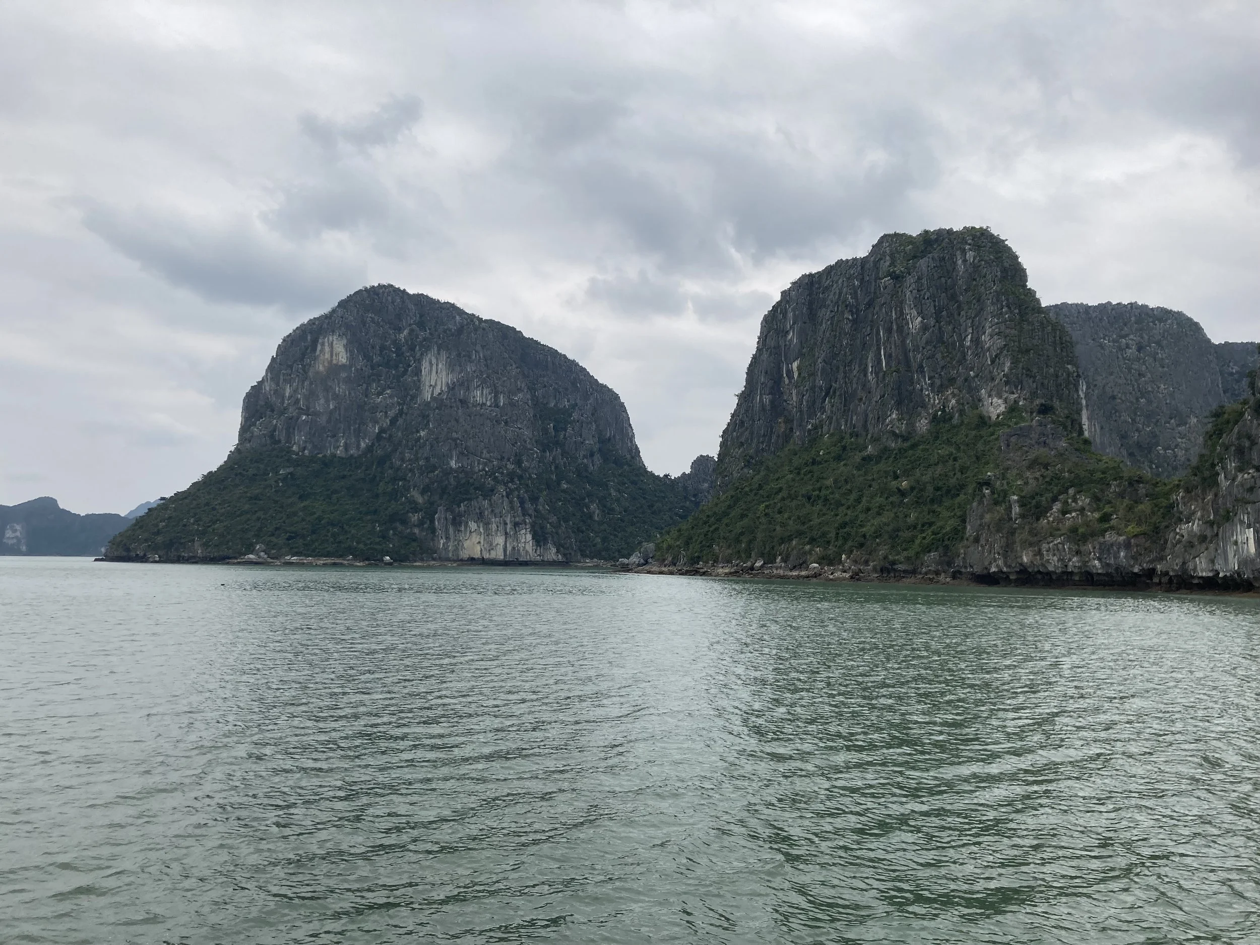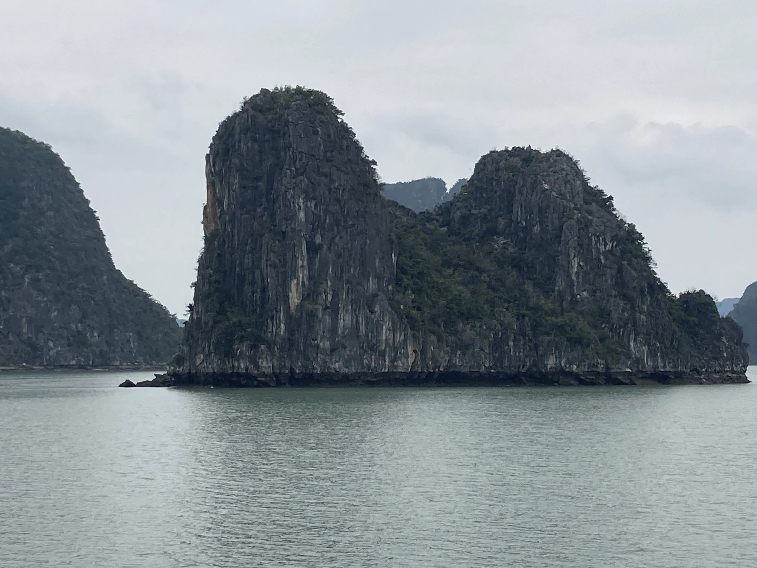 The only bummer about the day was the weather (which no one can control). It was overcast all day, so good for not having to slather ourselves in sun screen, but missing the aqua blue reflection of the water that Ha Long Bay is famous for. For example, this is our sweeping view of Ha Long Bay today: