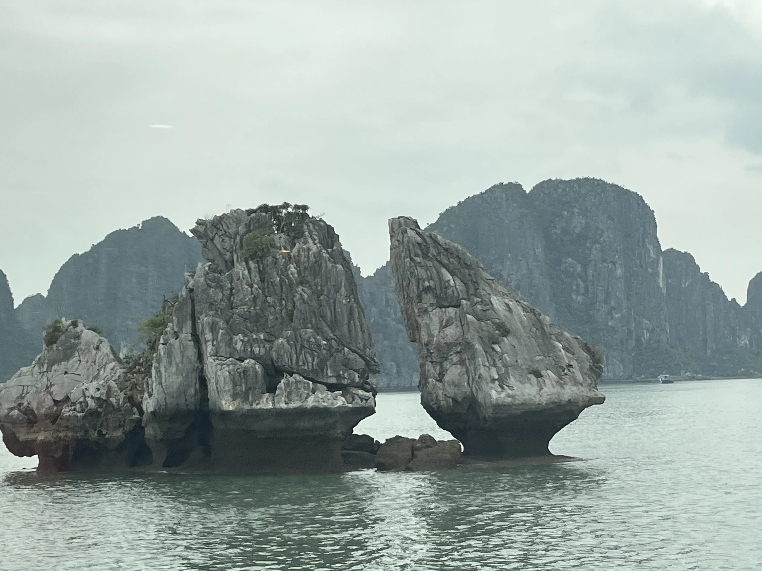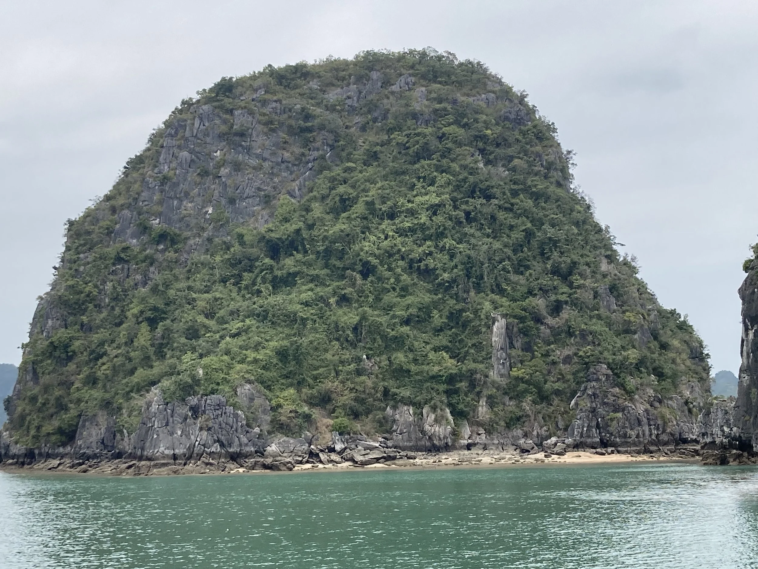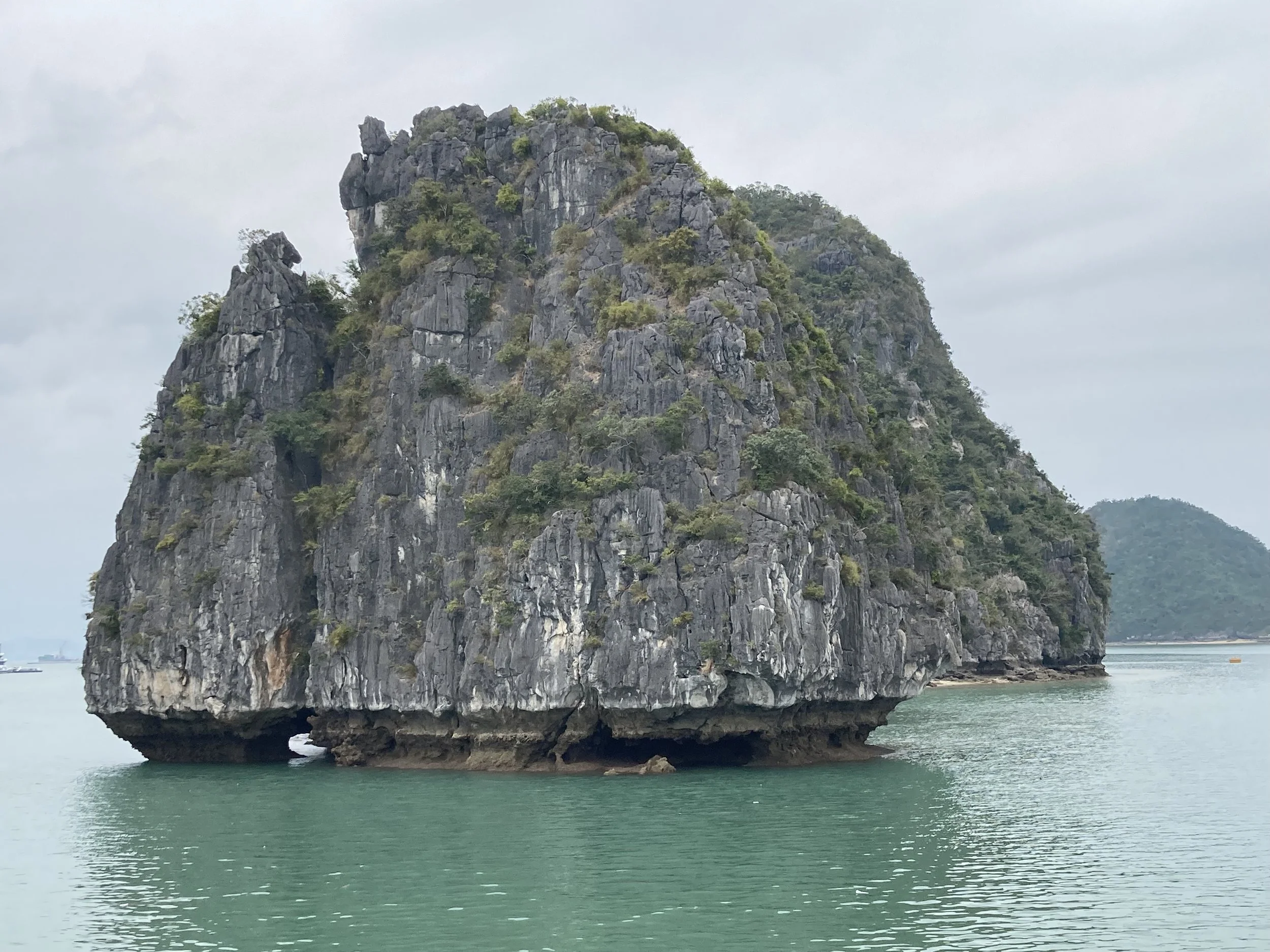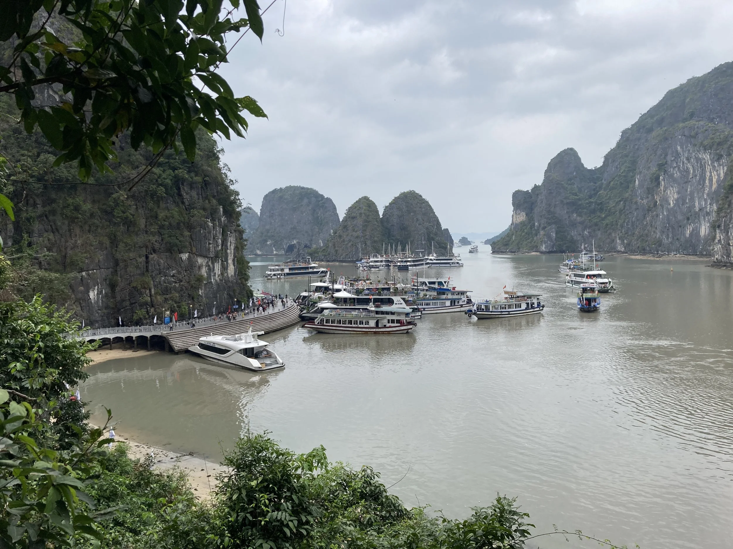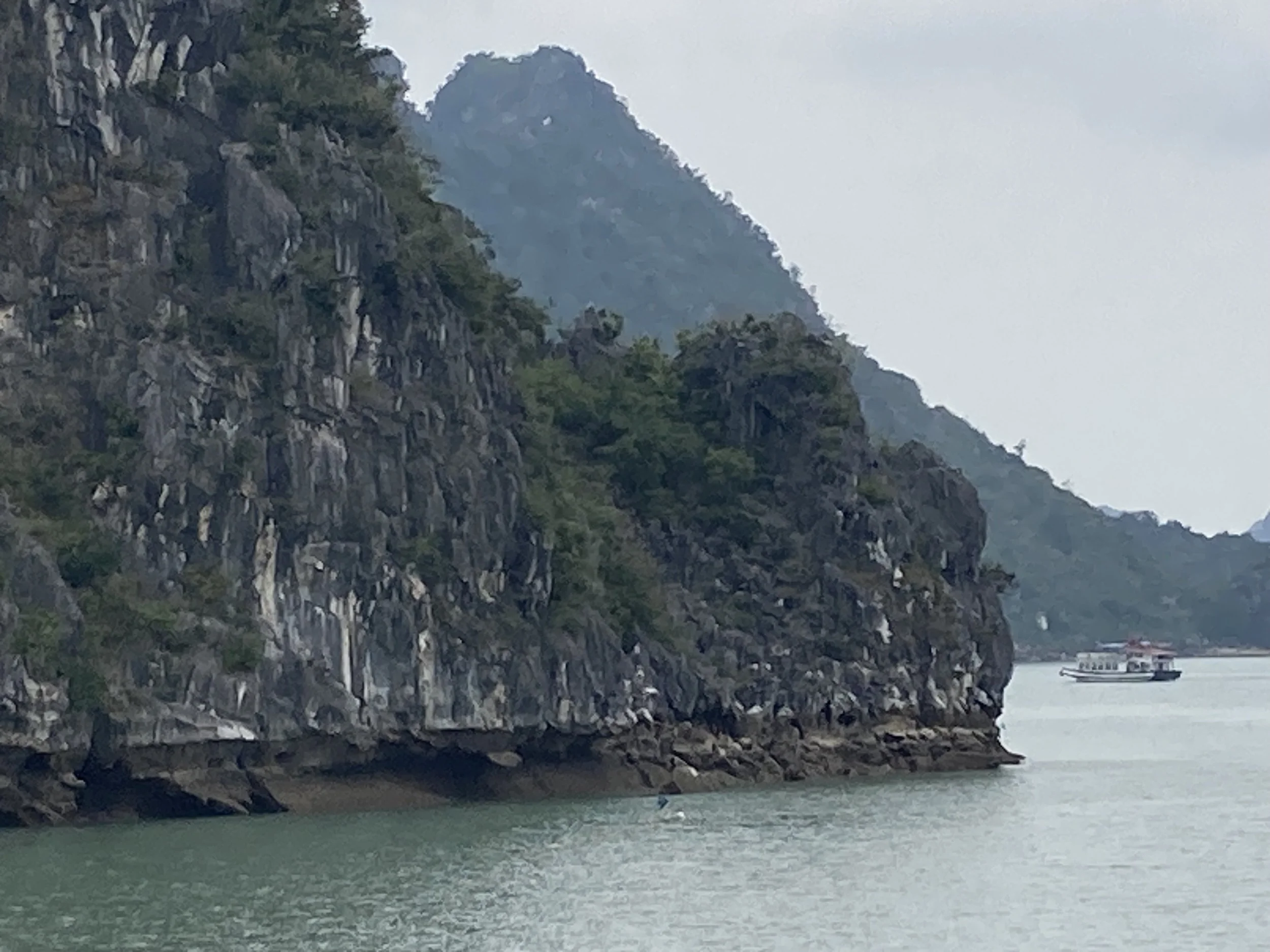 The only bummer about the day was the weather (which no one can control). It was overcast all day, so good for not having to slather ourselves in sun screen, but missing the aqua blue reflection of the water that Ha Long Bay is famous for. For example, this is our sweeping view of Ha Long Bay today: