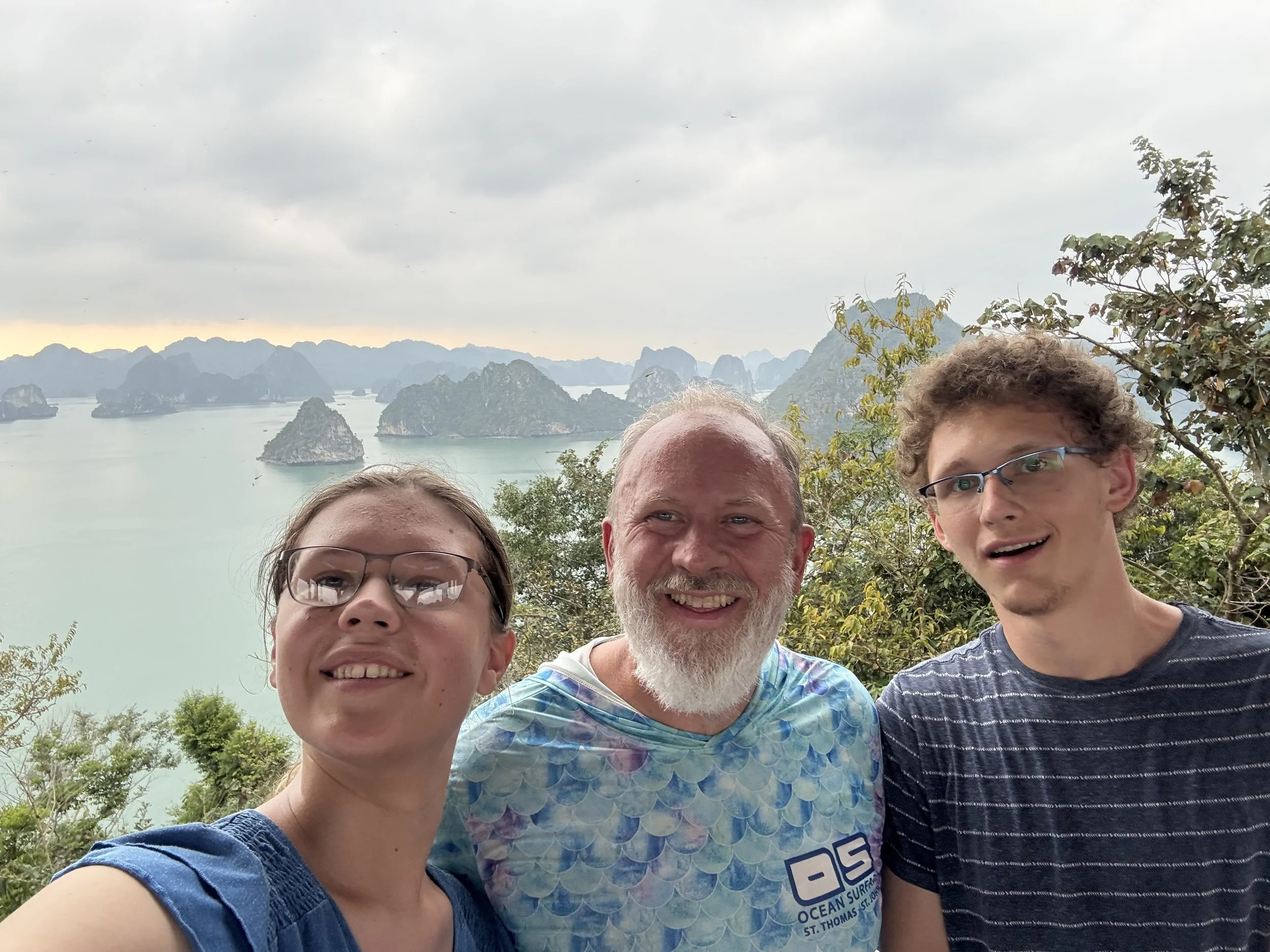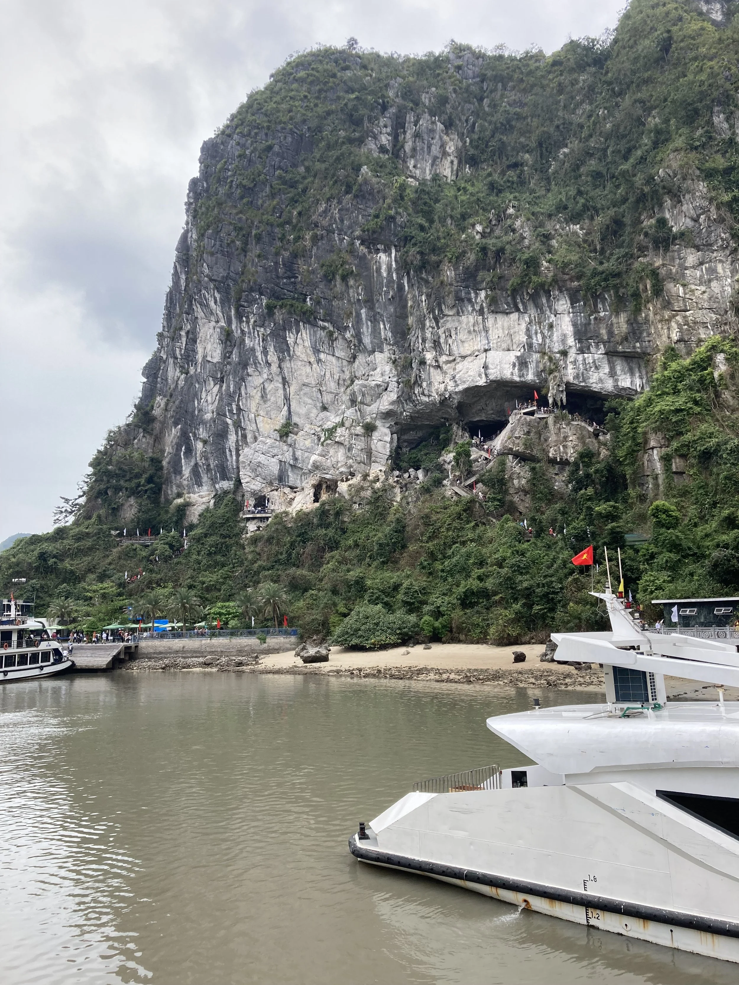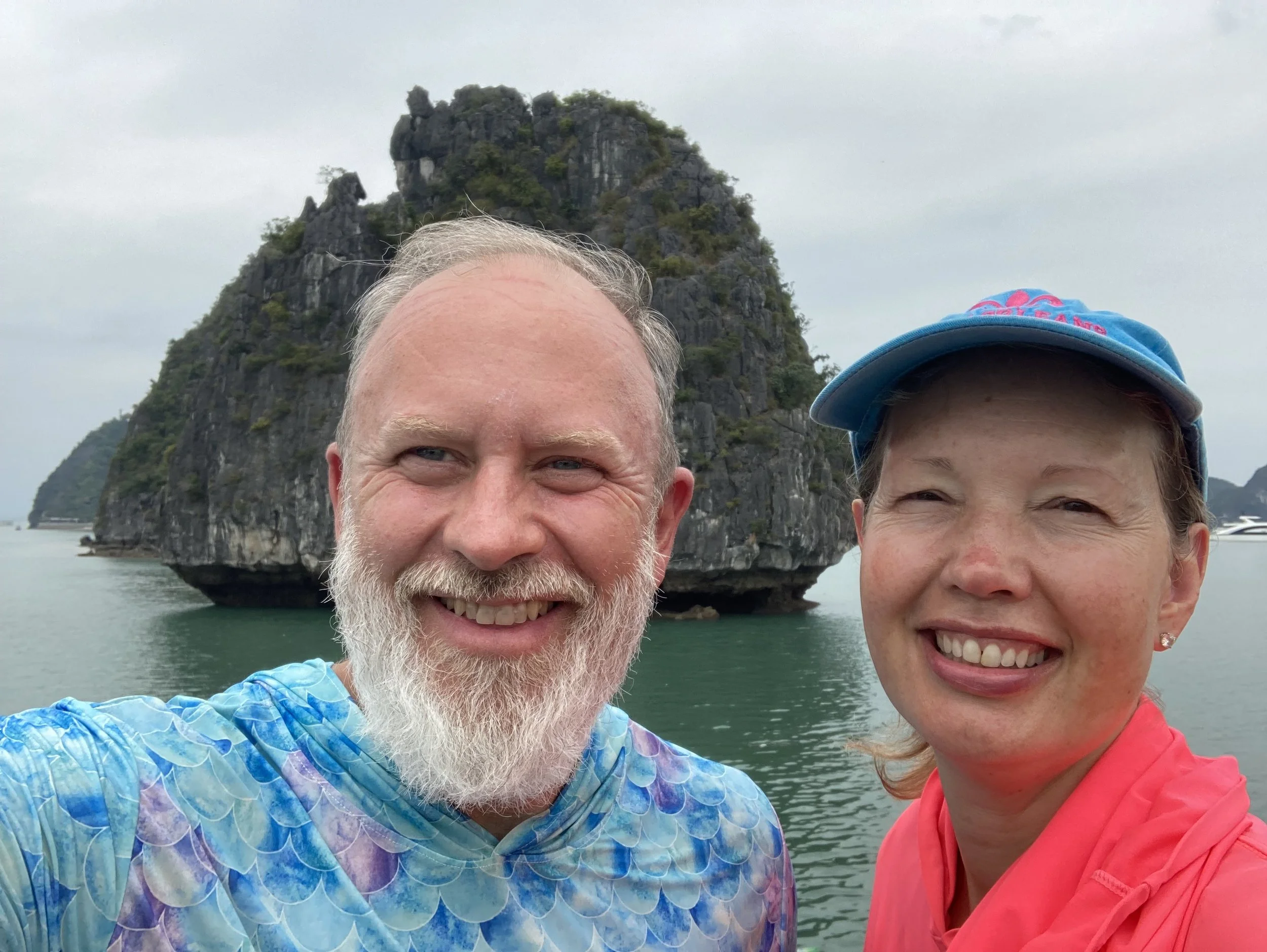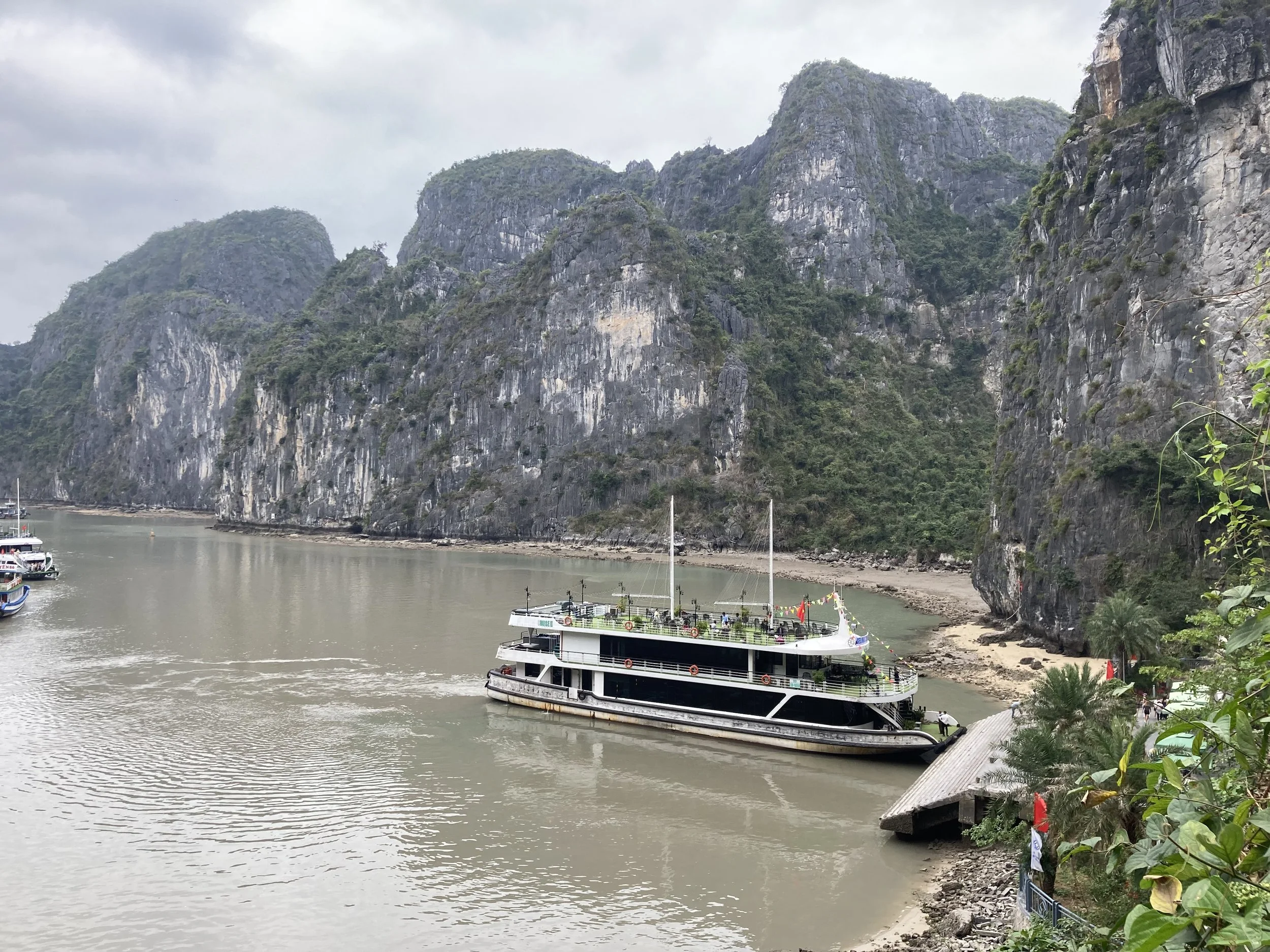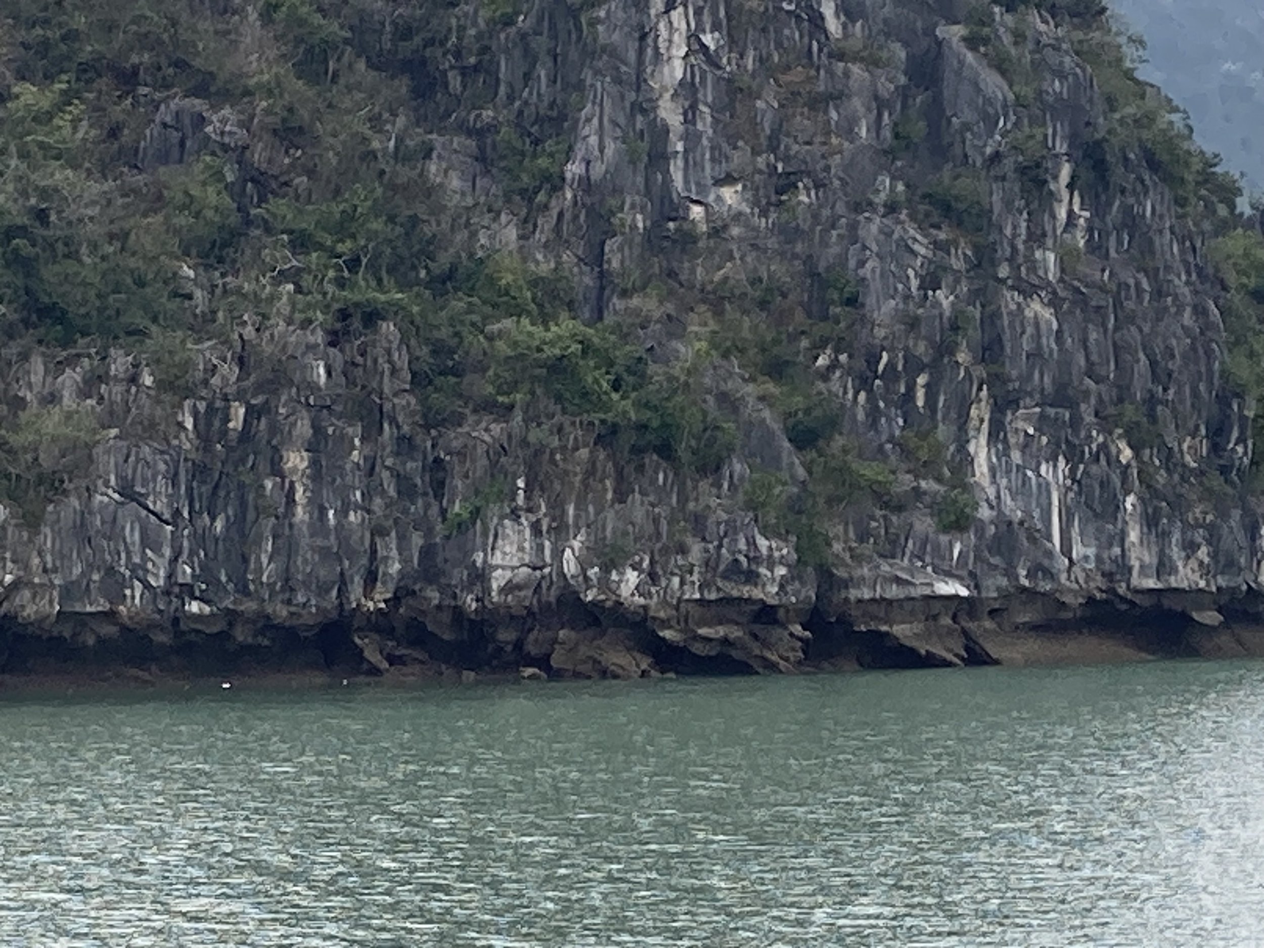 The only bummer about the day was the weather (which no one can control). It was overcast all day, so good for not having to slather ourselves in sun screen, but missing the aqua blue reflection of the water that Ha Long Bay is famous for. For example, this is our sweeping view of Ha Long Bay today: