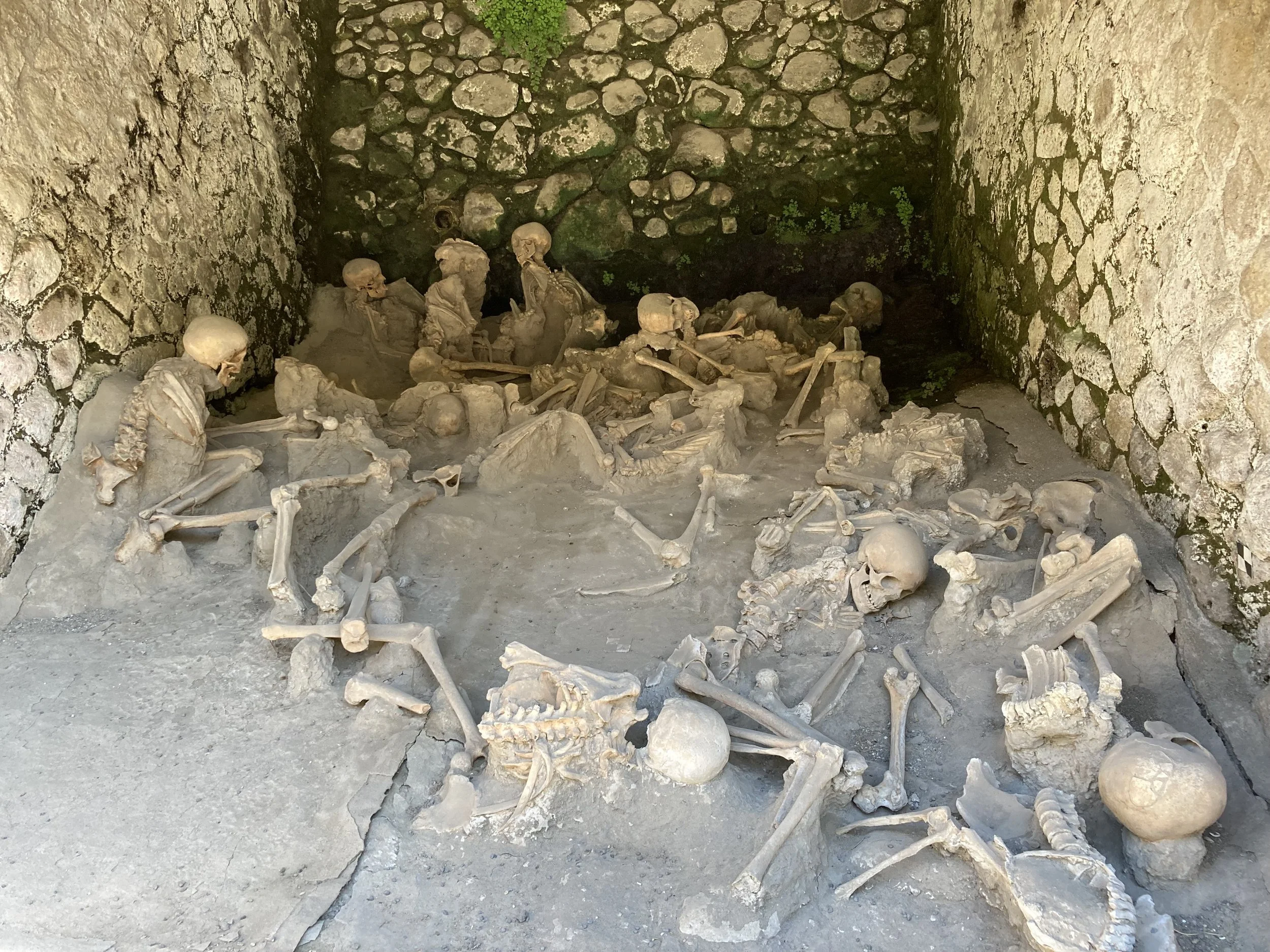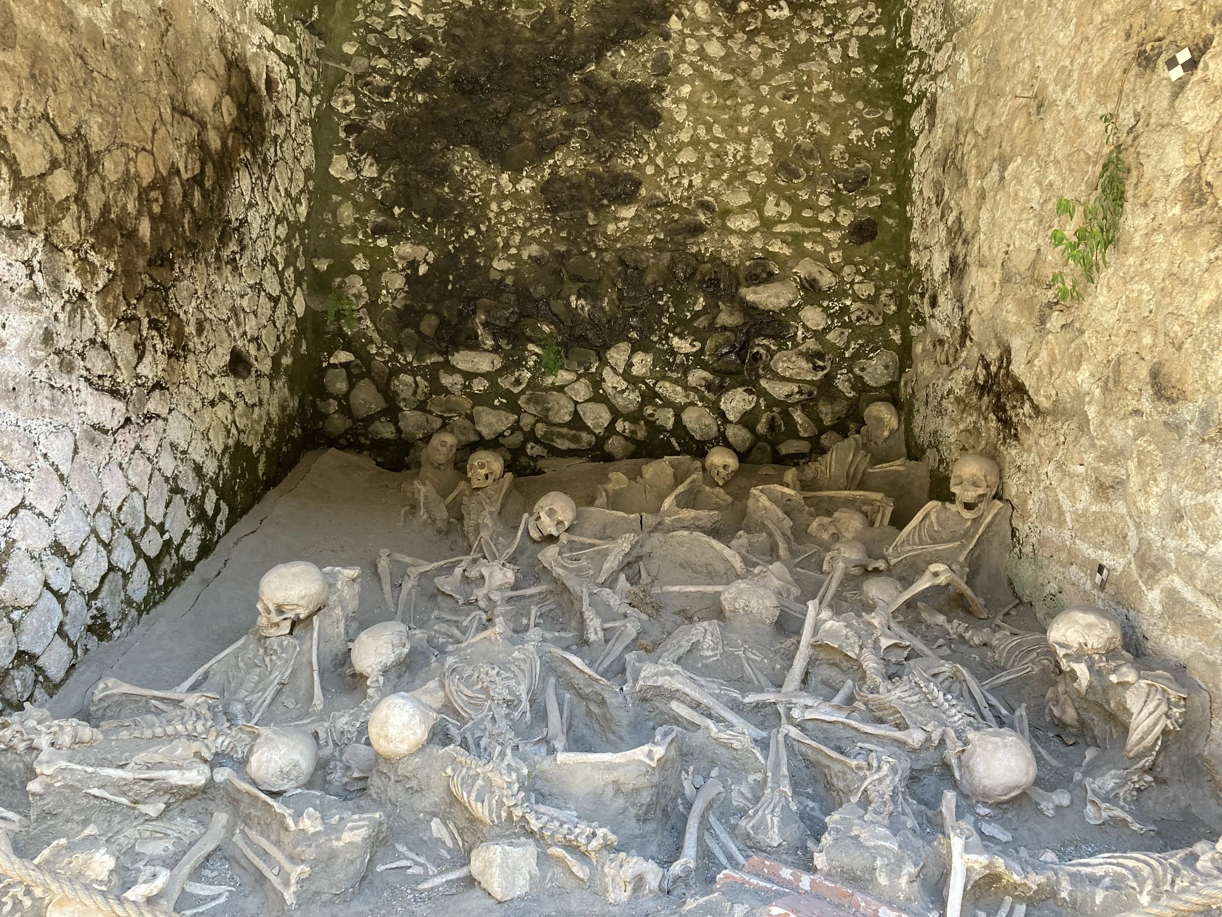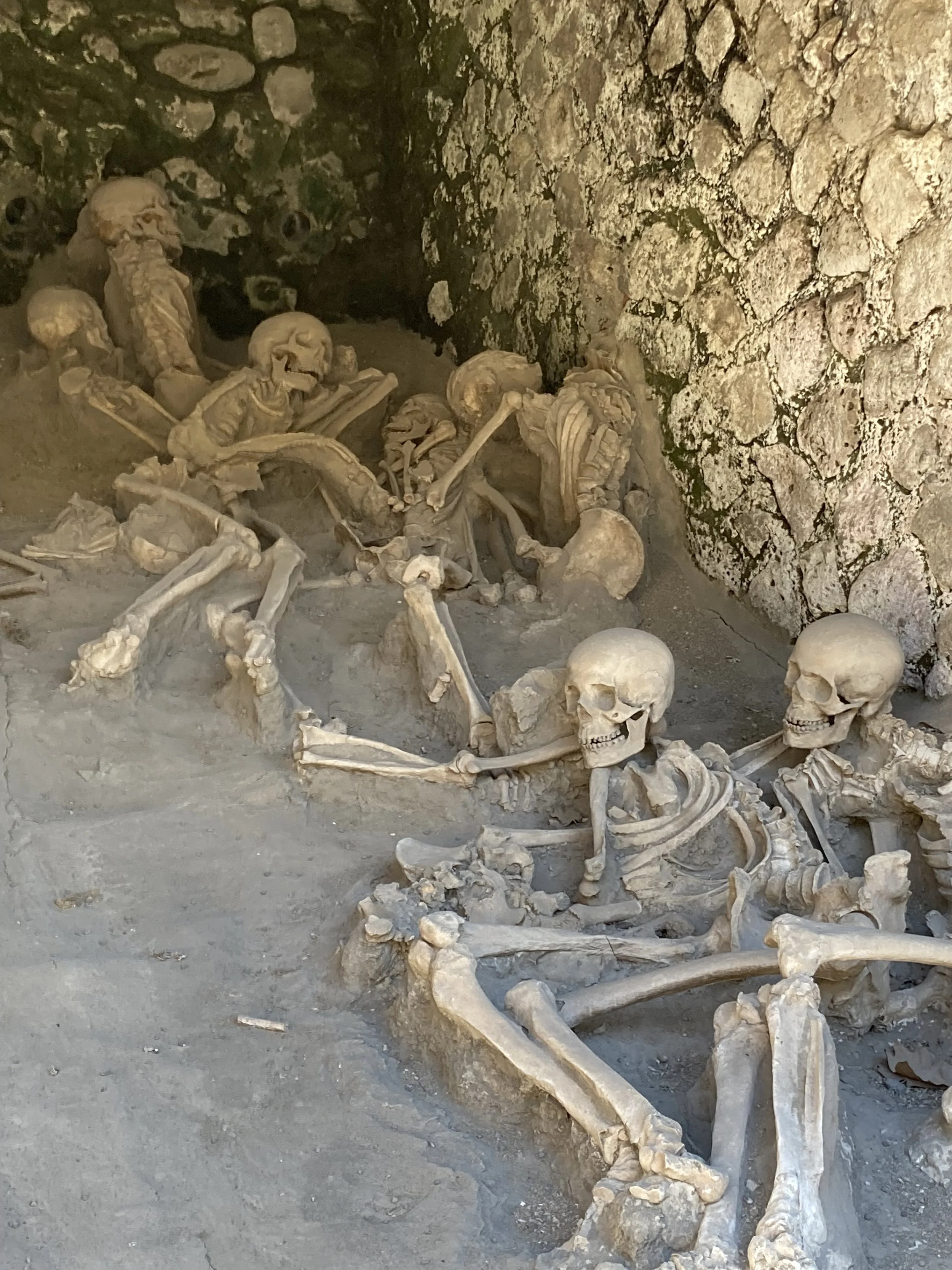 And here are the skeletal remains of those who died waiting to sail away from Herculaneum. They died instantly when the 800-degree vapor came rolling off the volcano and incinerated each of them waiting to get on a boat to sail away. They were in a cave area that appeared to be protected, but that didn’t matter with that level of heat rolling through the area.