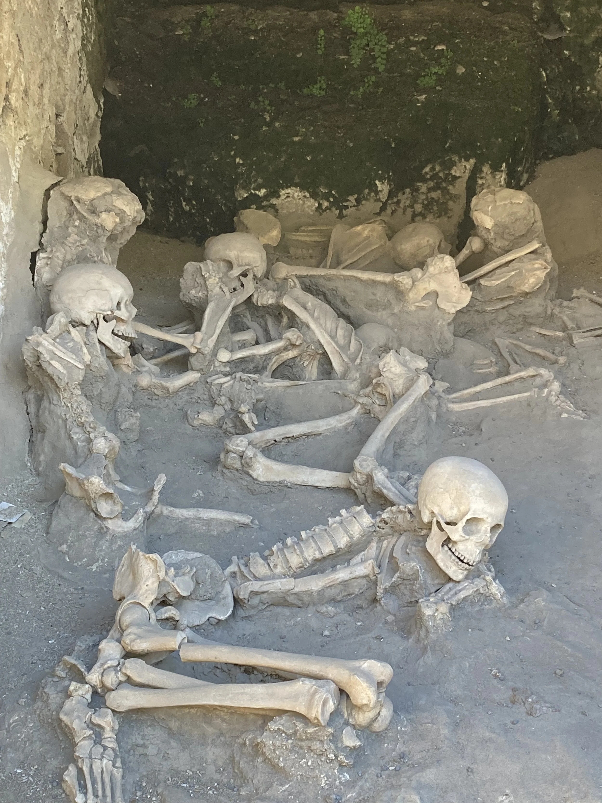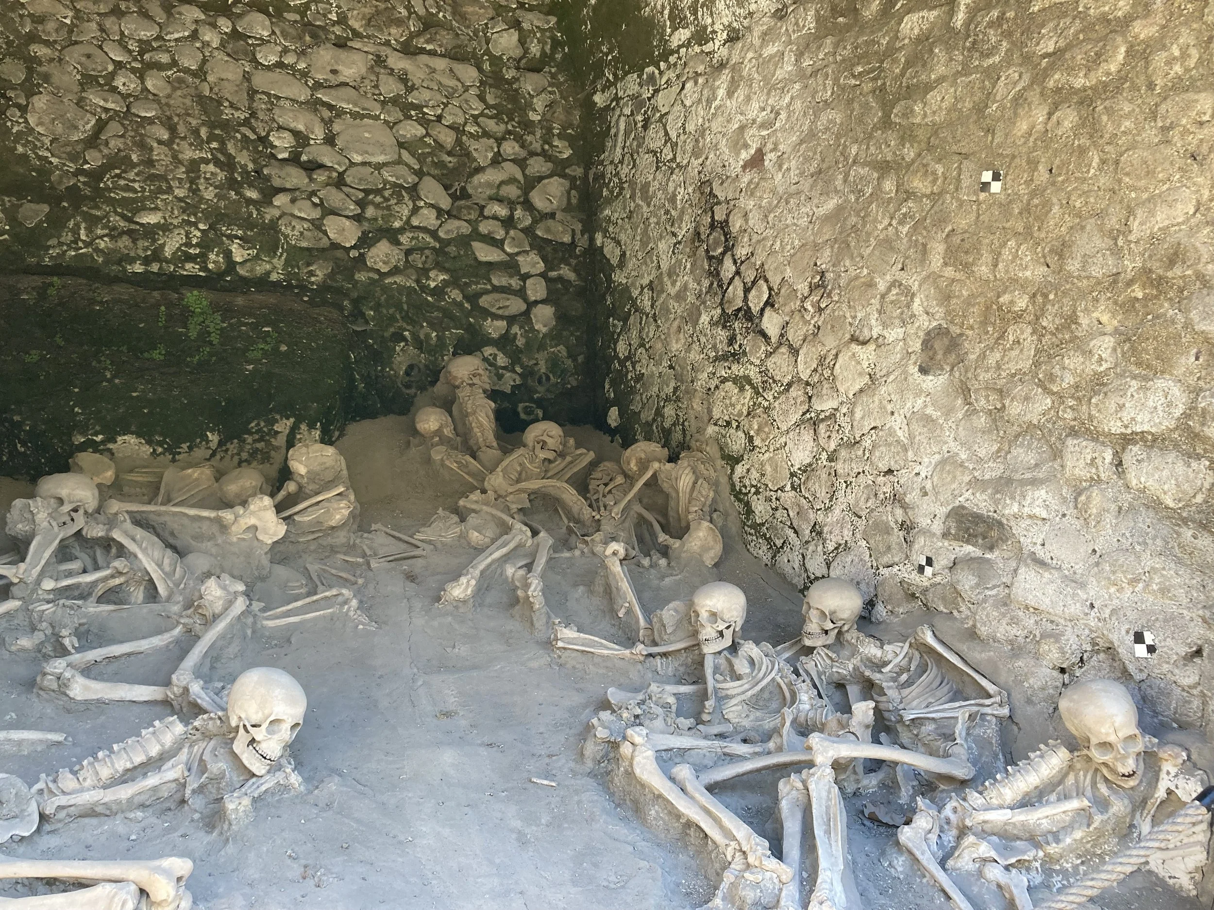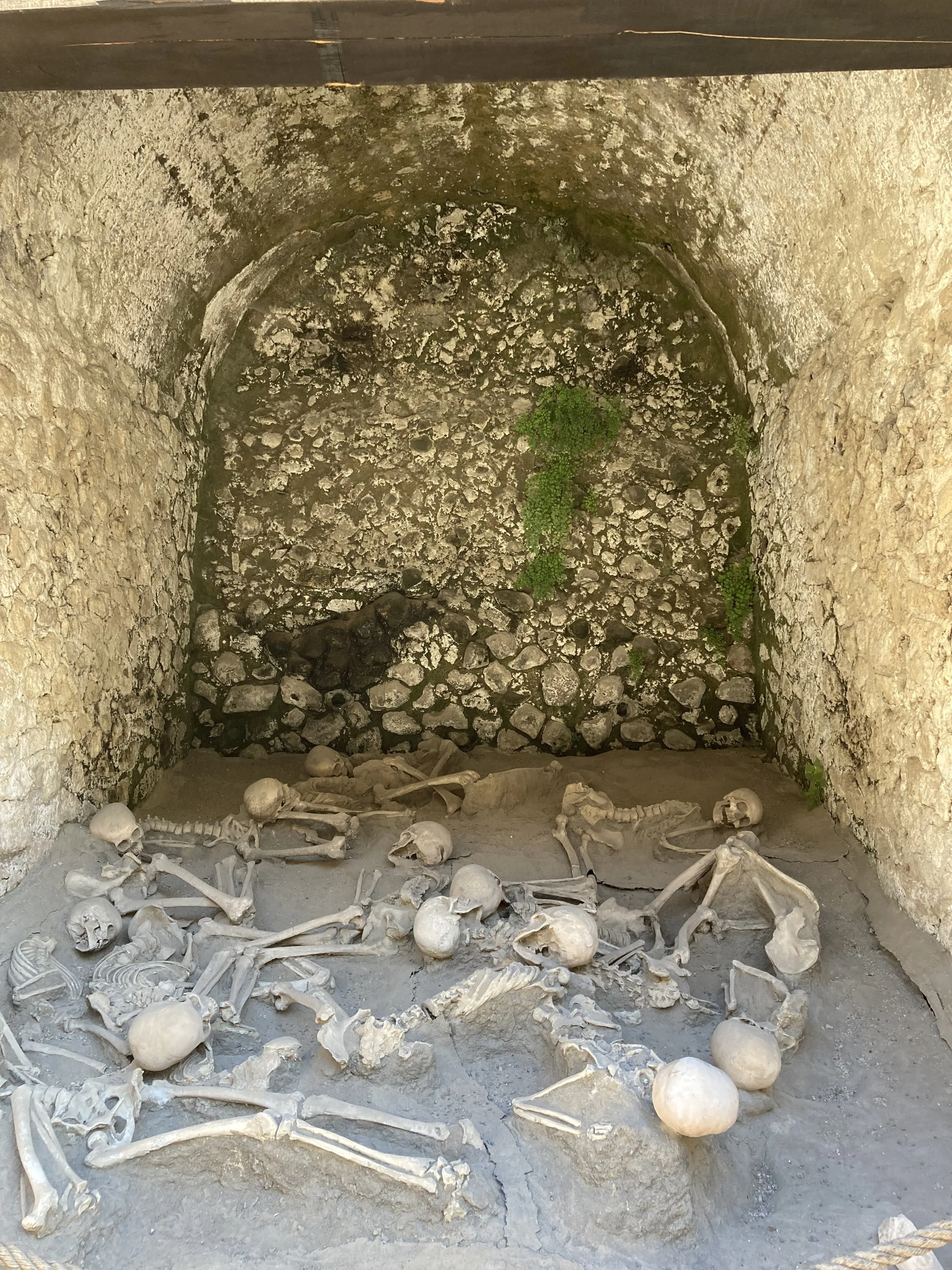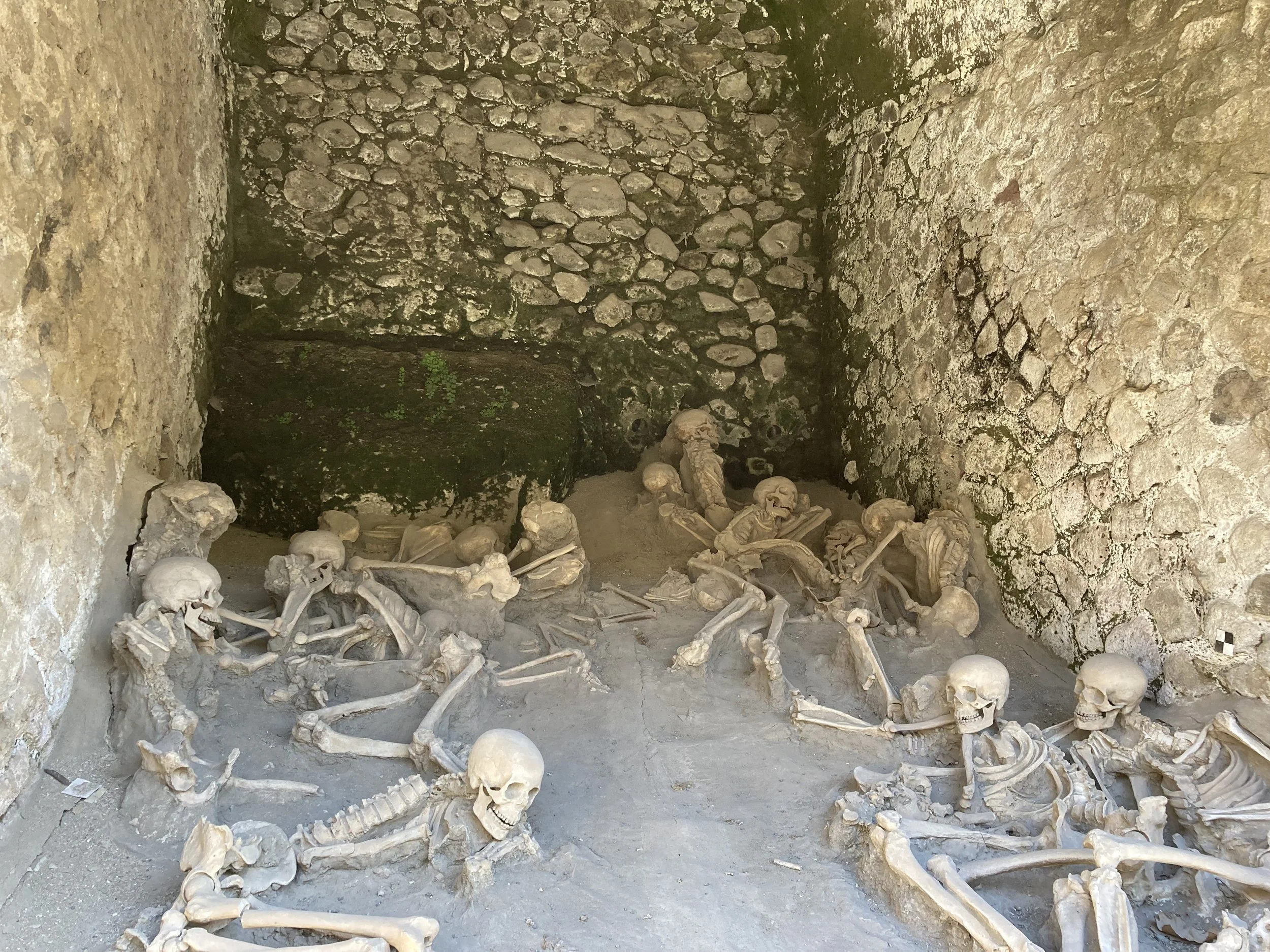And here are the skeletal remains of those who died waiting to sail away from Herculaneum. They died instantly when the 800-degree vapor came rolling off the volcano and incinerated each of them waiting to get on a boat to sail away. They were in a cave area that appeared to be protected, but that didn’t matter with that level of heat rolling through the area.