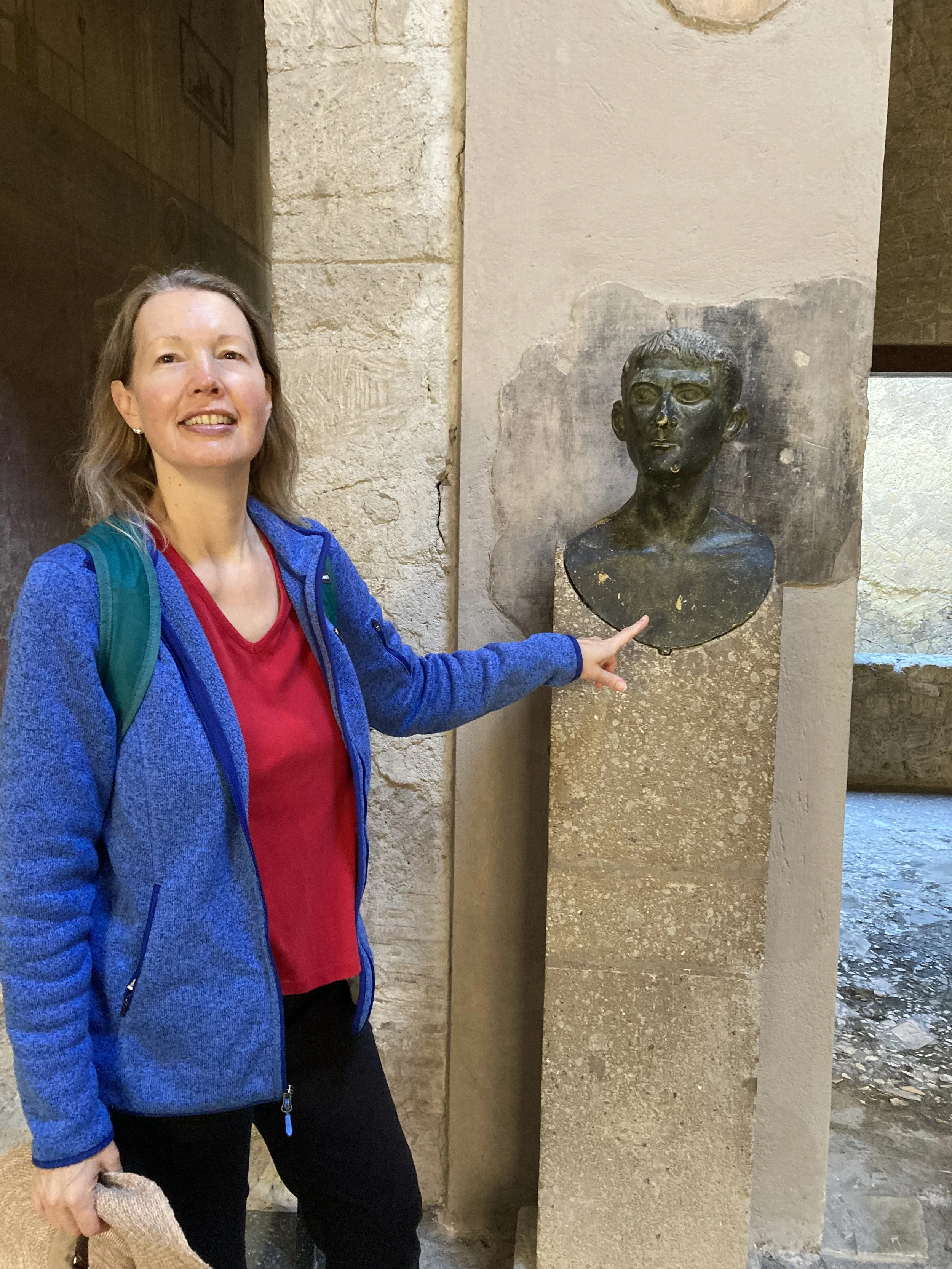 Elena Carmody pointing out that each owner of a house would have a bust like this signifying their importance and status as owner