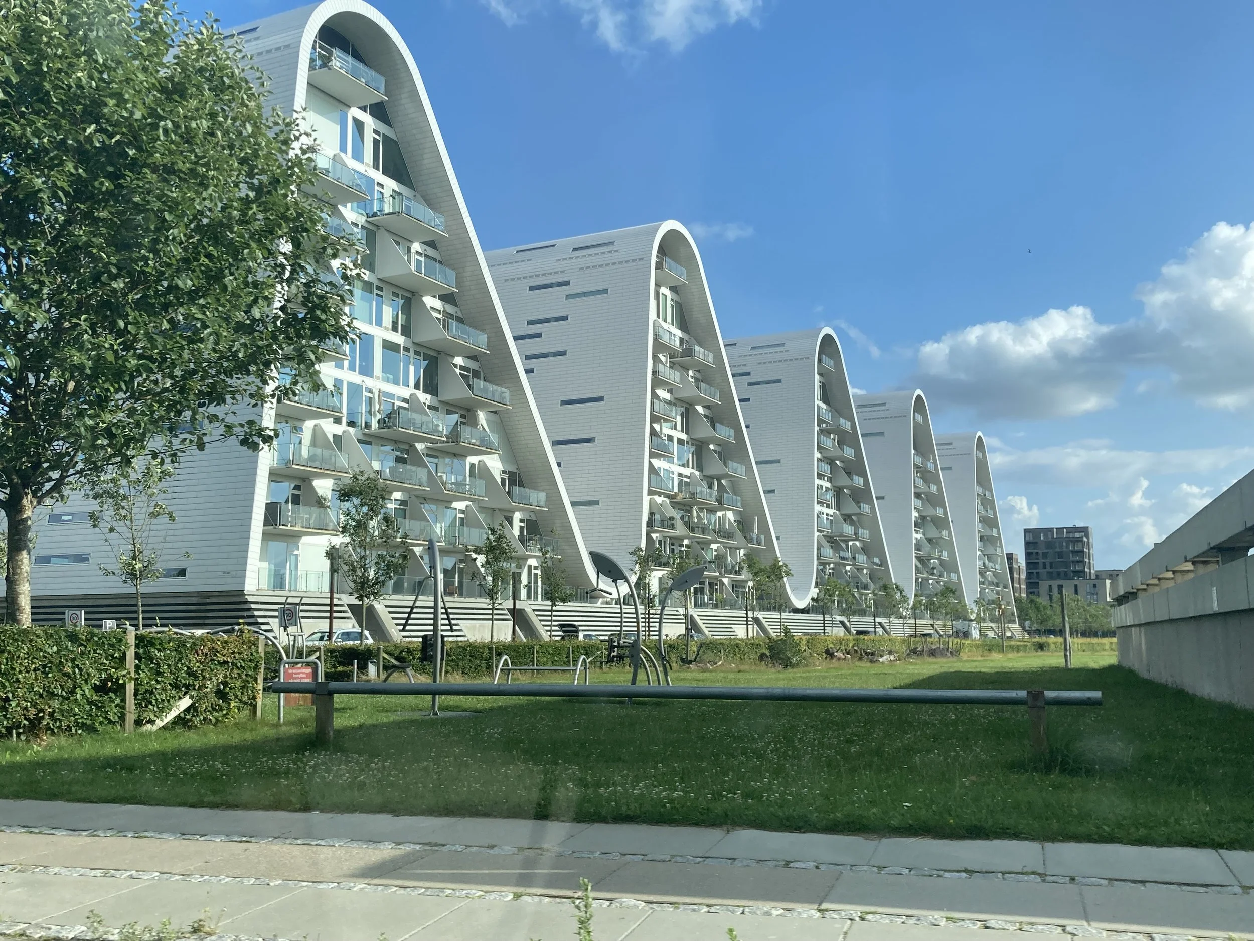 Apparently, this distinctive building was selected as winner of the prestigious Civic Trust Award. As part of the description of this award (and according to Michael Webb), “The Wave demonstrates how Danish architects are responding to global trends without sacrificing the practicality or well-crafted detailing that have long been a signature of the Danes.” So, in essence, it’s distinctly Danish and as such I wanted to share it as it certainly caught my attention on our drive.