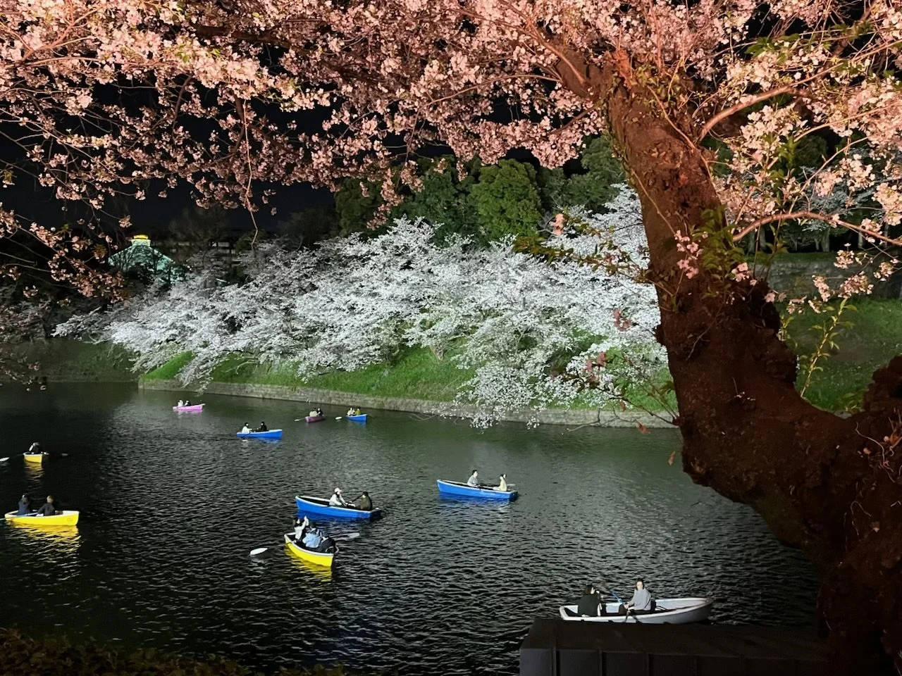 The subtile colors of the cherry blossoms are more vibrant at night