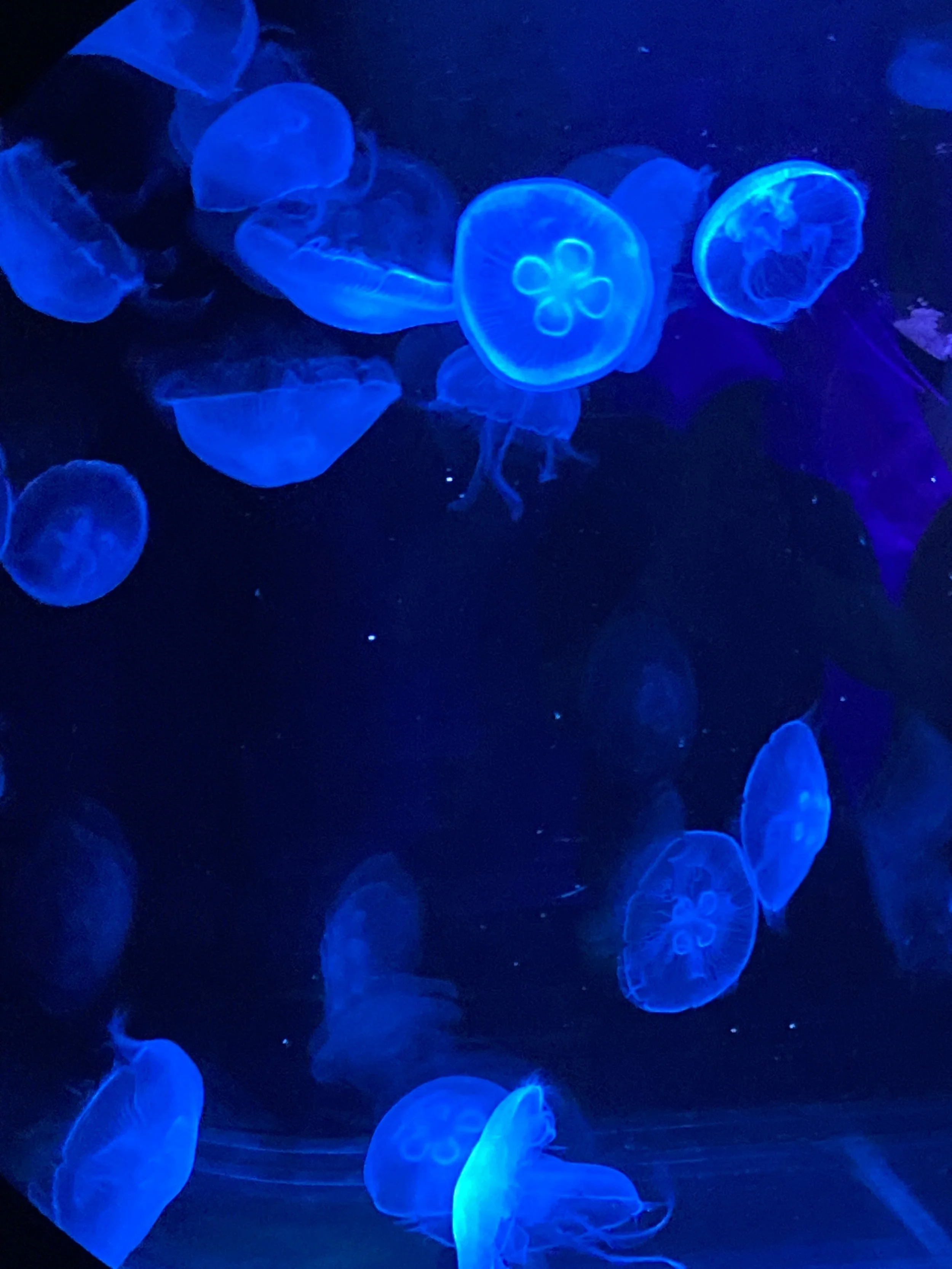 I’m always amazed at how calming watching jellyfish can be. Violet noticed it to. She asked, “How can this jellyfish be alive?” We can see every part of the jellyfish and yet it has a sense of floating around in the water and leaves a magical trace behind it wherever it goes.