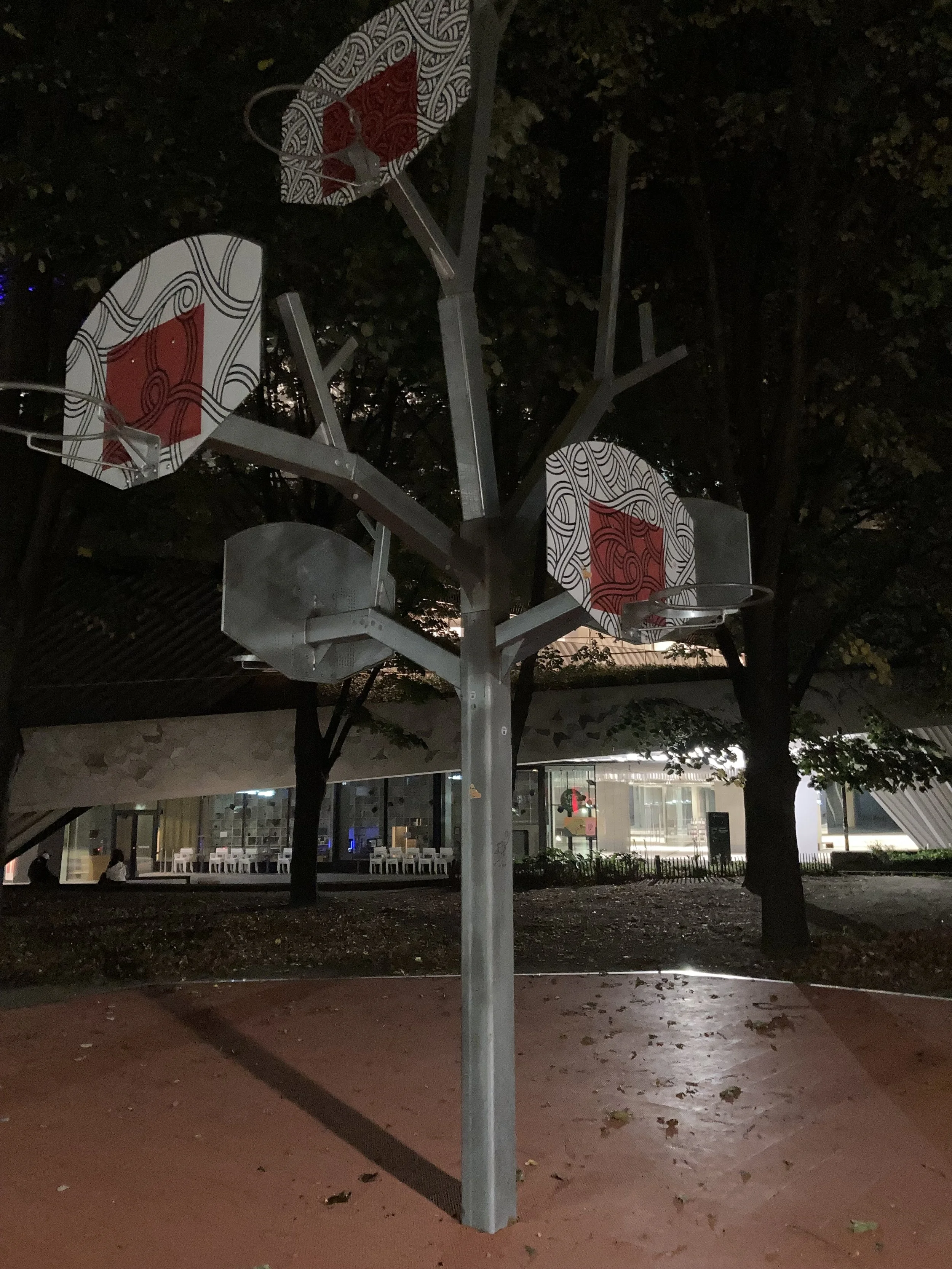 Basketball hoop turned into artwork — or is this just a functional practice spot?