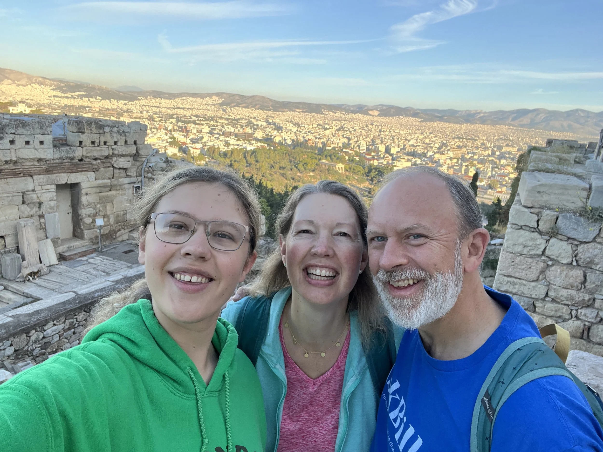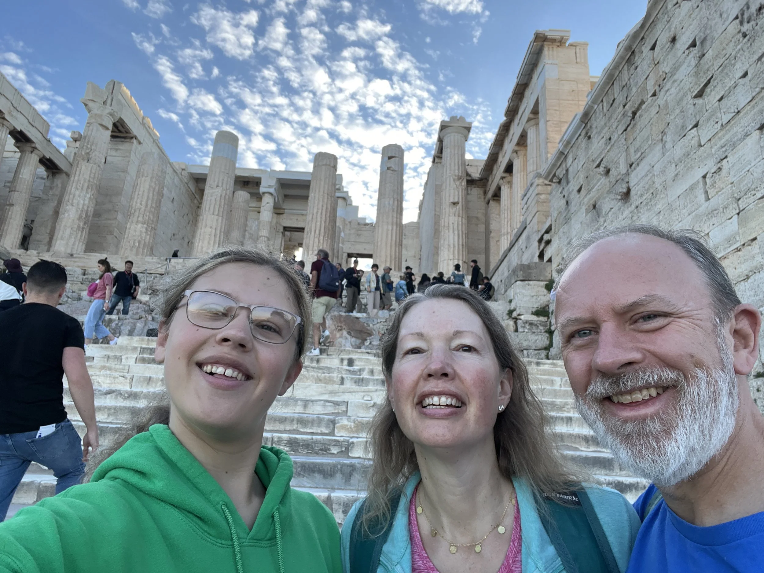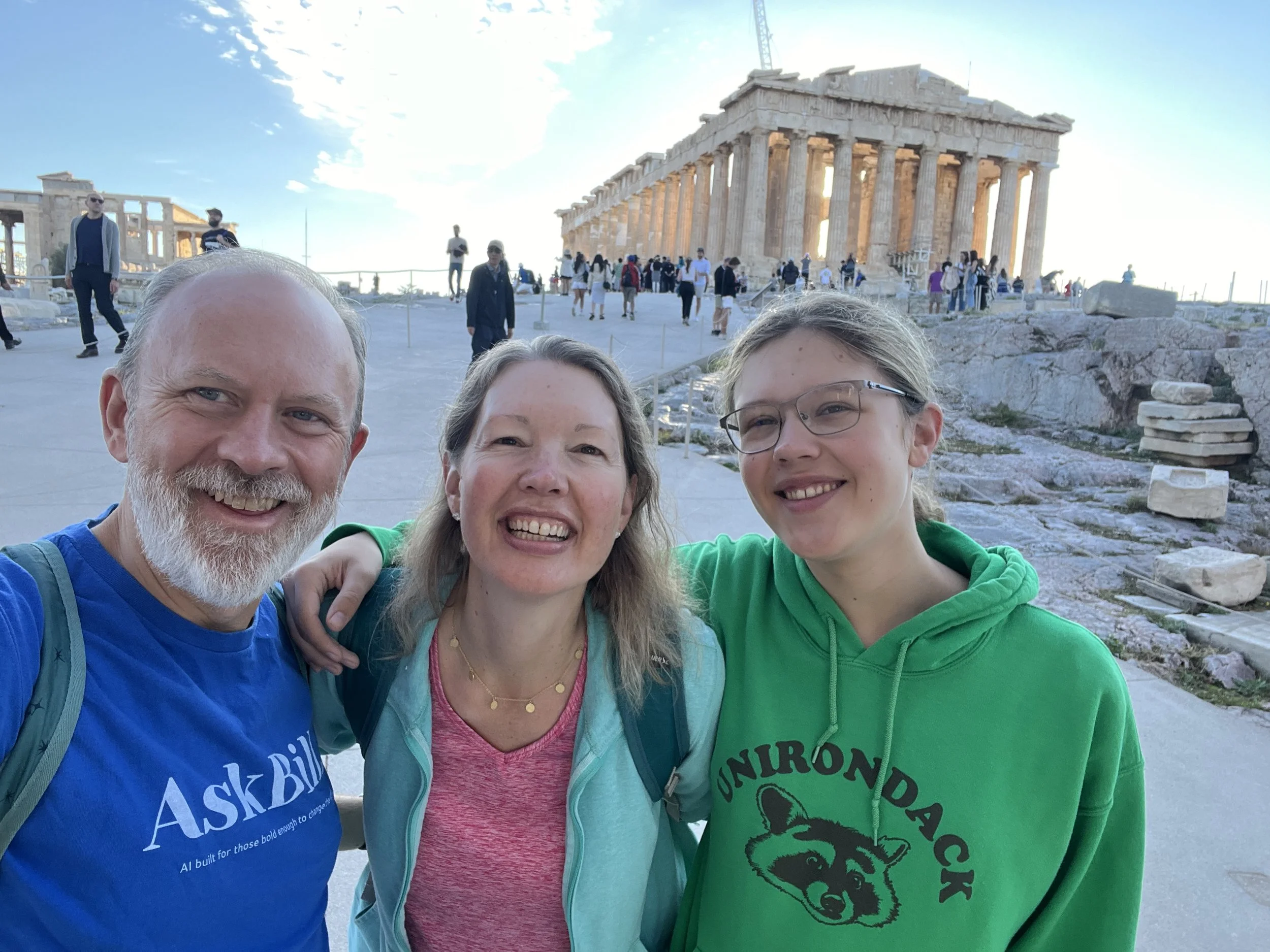 Bill, Elena and Violet standing in front of the Parthenon in Athens