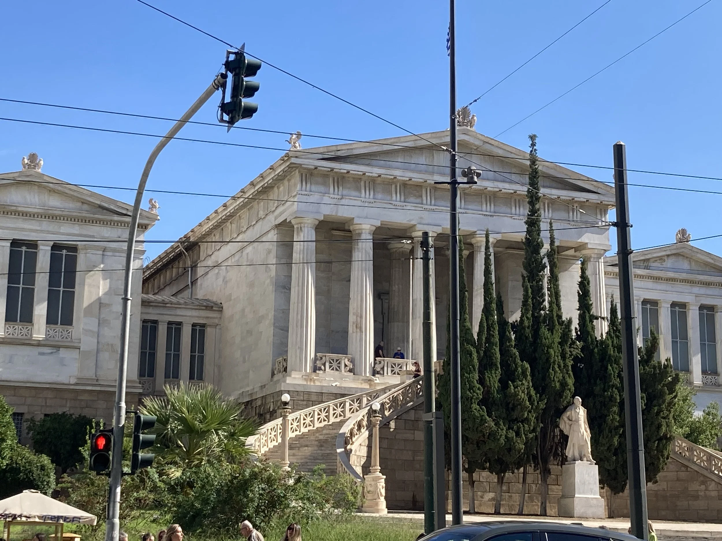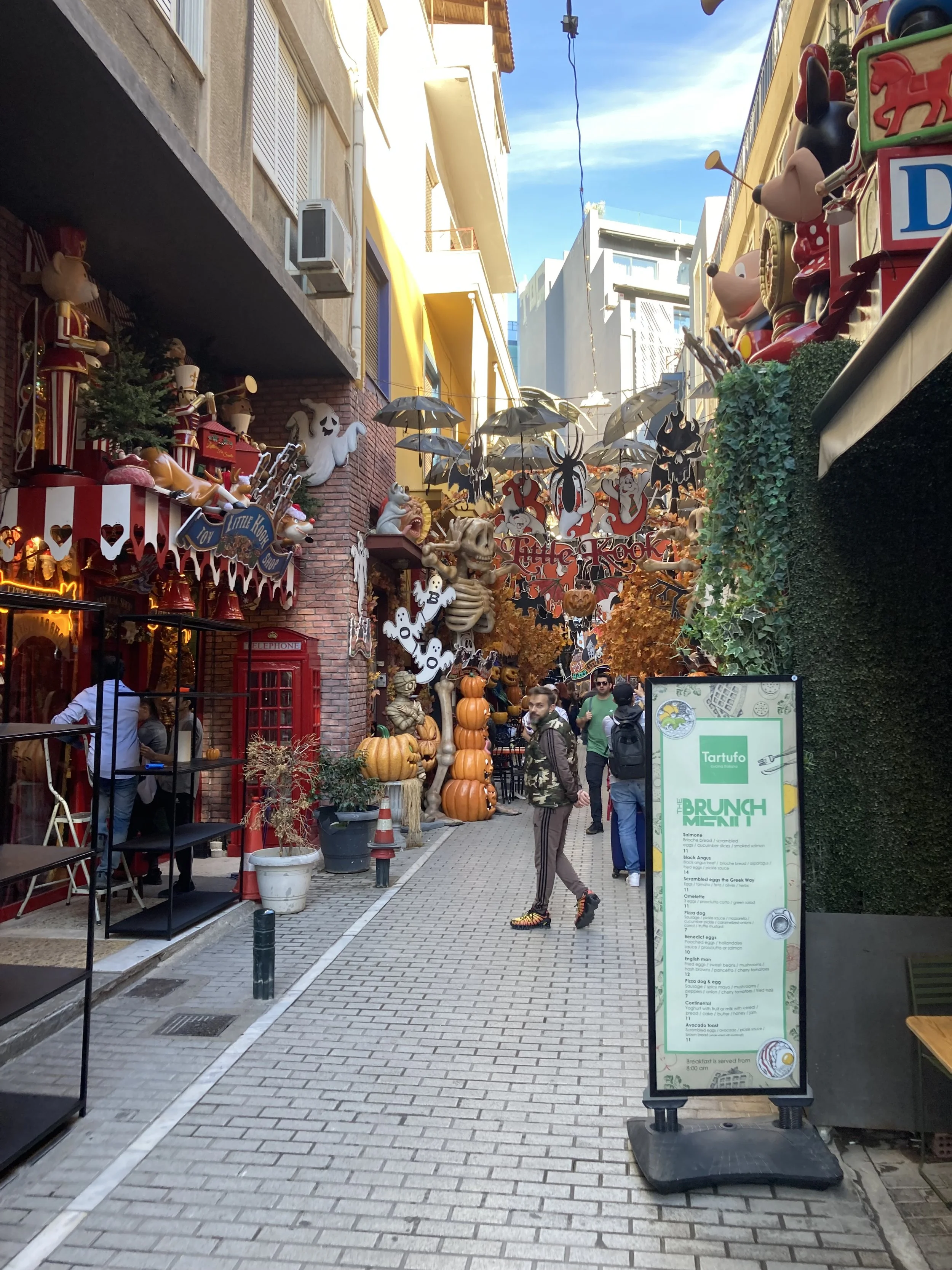 While Violet when back to the hotel, Elena and I met up with Evi (Evthokia Kathrepti) who lives here locally and offered to be our tour guide for the day. What I love is the combination of local side streets and major attractions that she took us to. So while we had the opportunity to witness the changing of guards and get a few pictures of the university and in front of the gorgeous looking library, we also wandered around Greece’s version of Diagon Alley from Harry Potter. At this time, the alley is made up of all sorts of Halloween decorations.