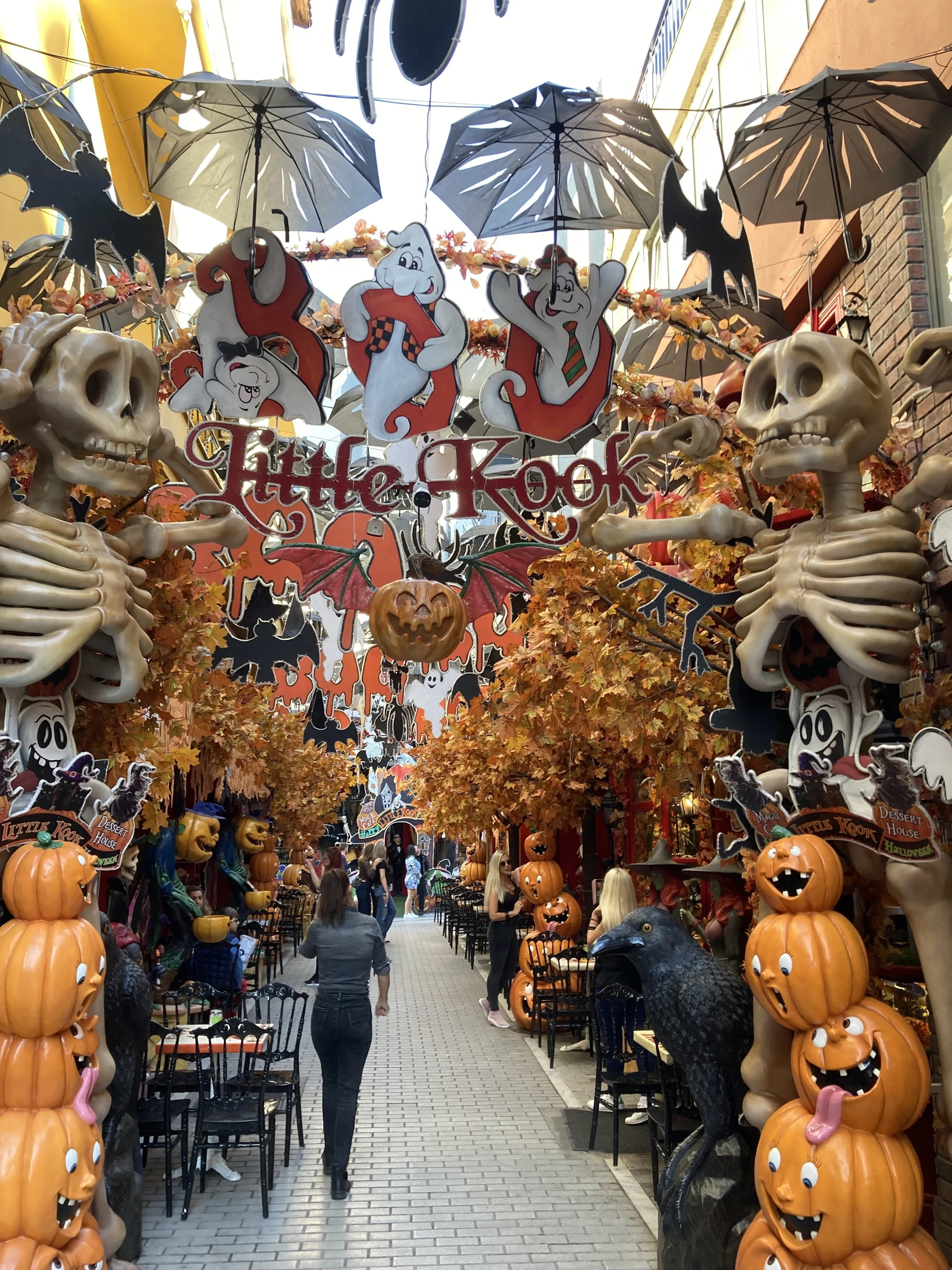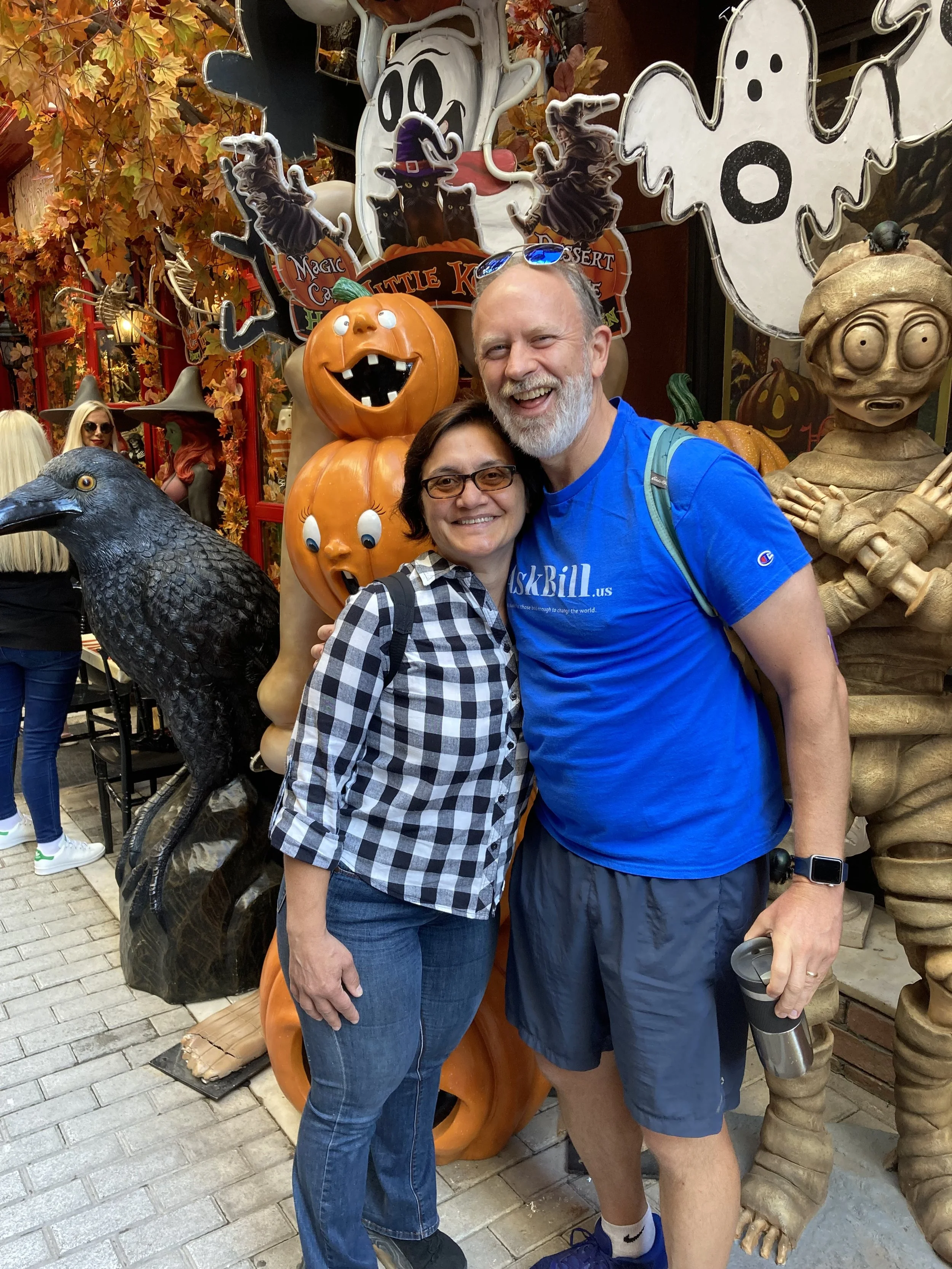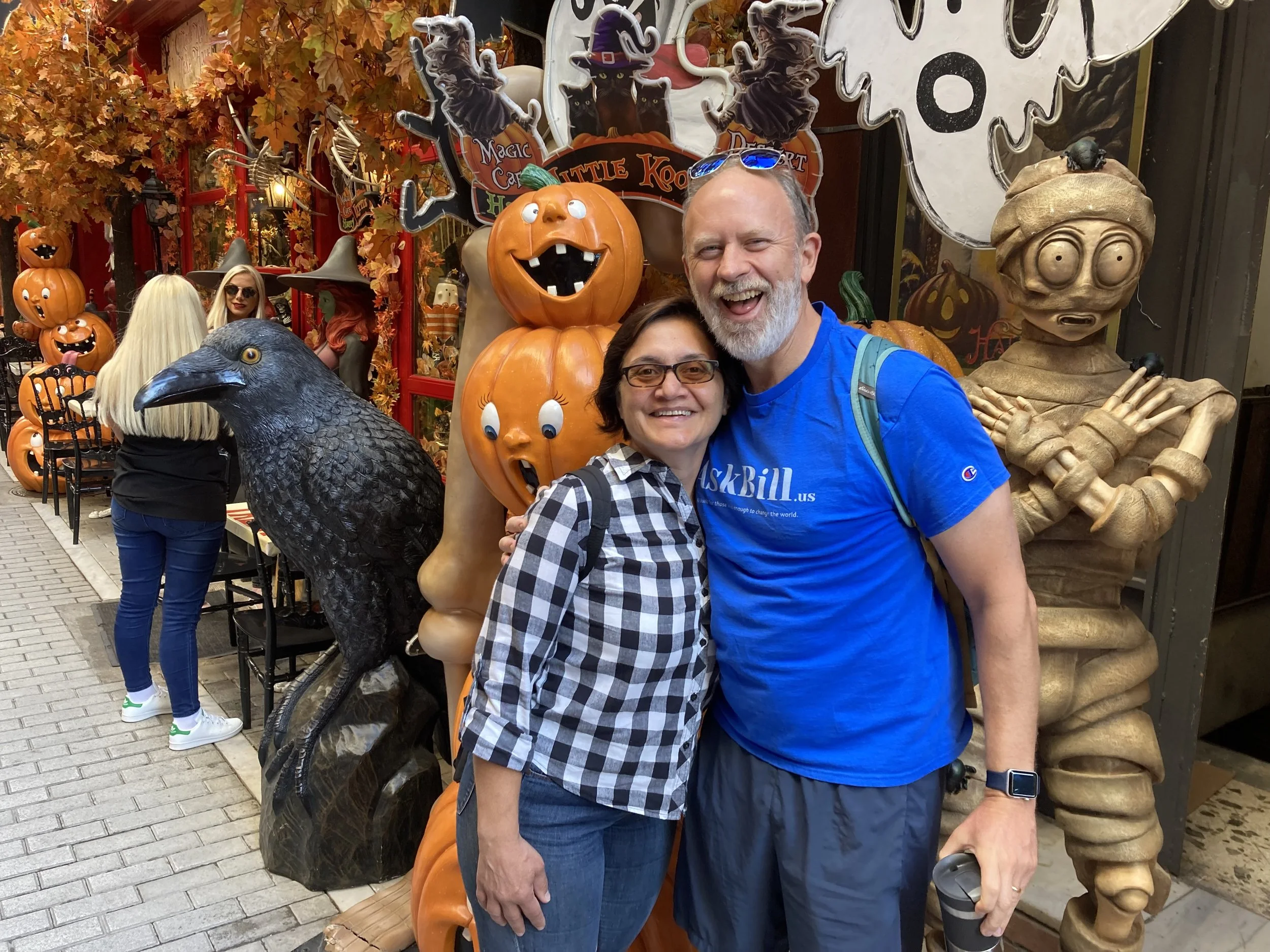 Biil and Evi in front of Greece’s Diagon Alley with Halloween Deco