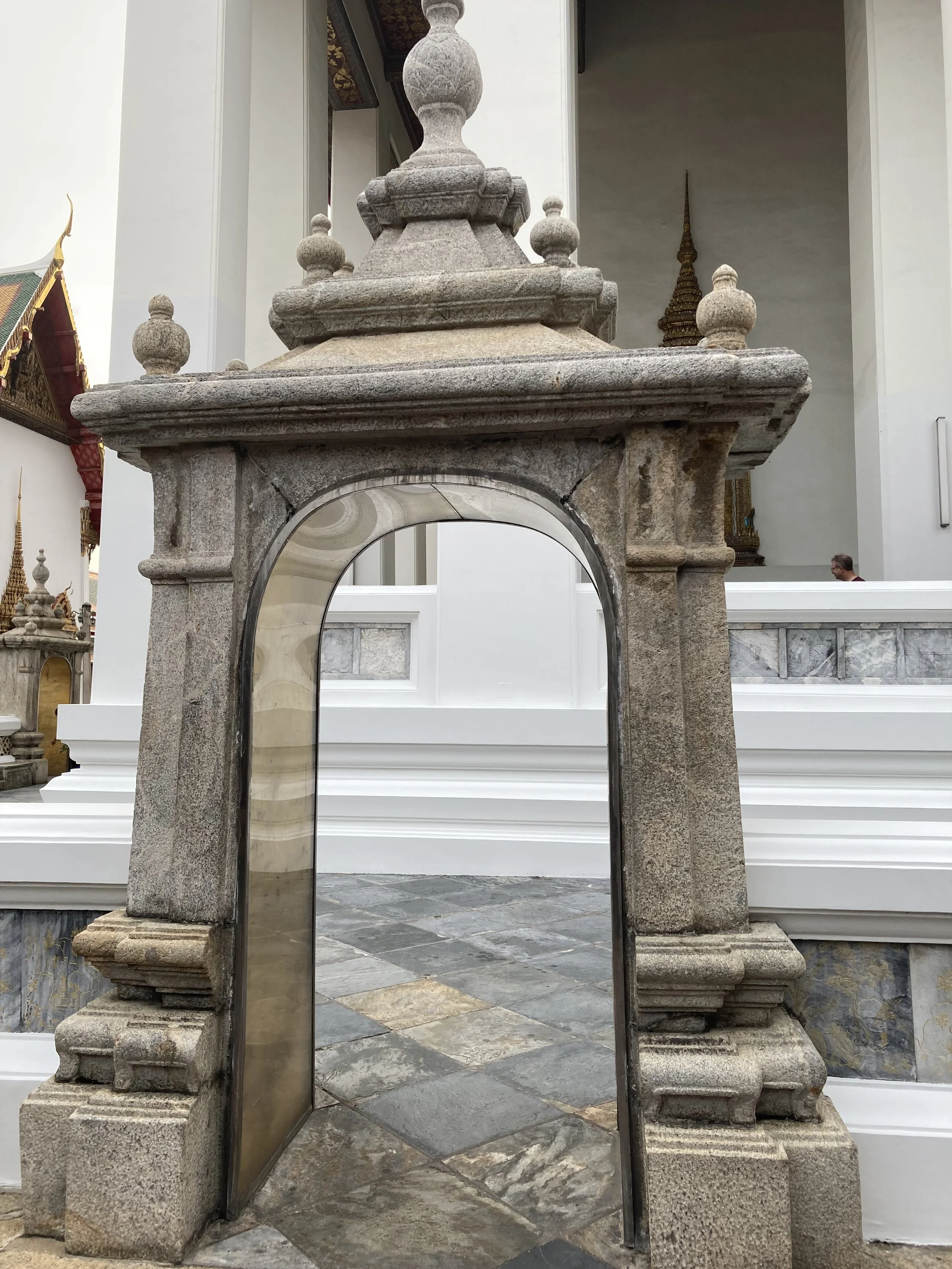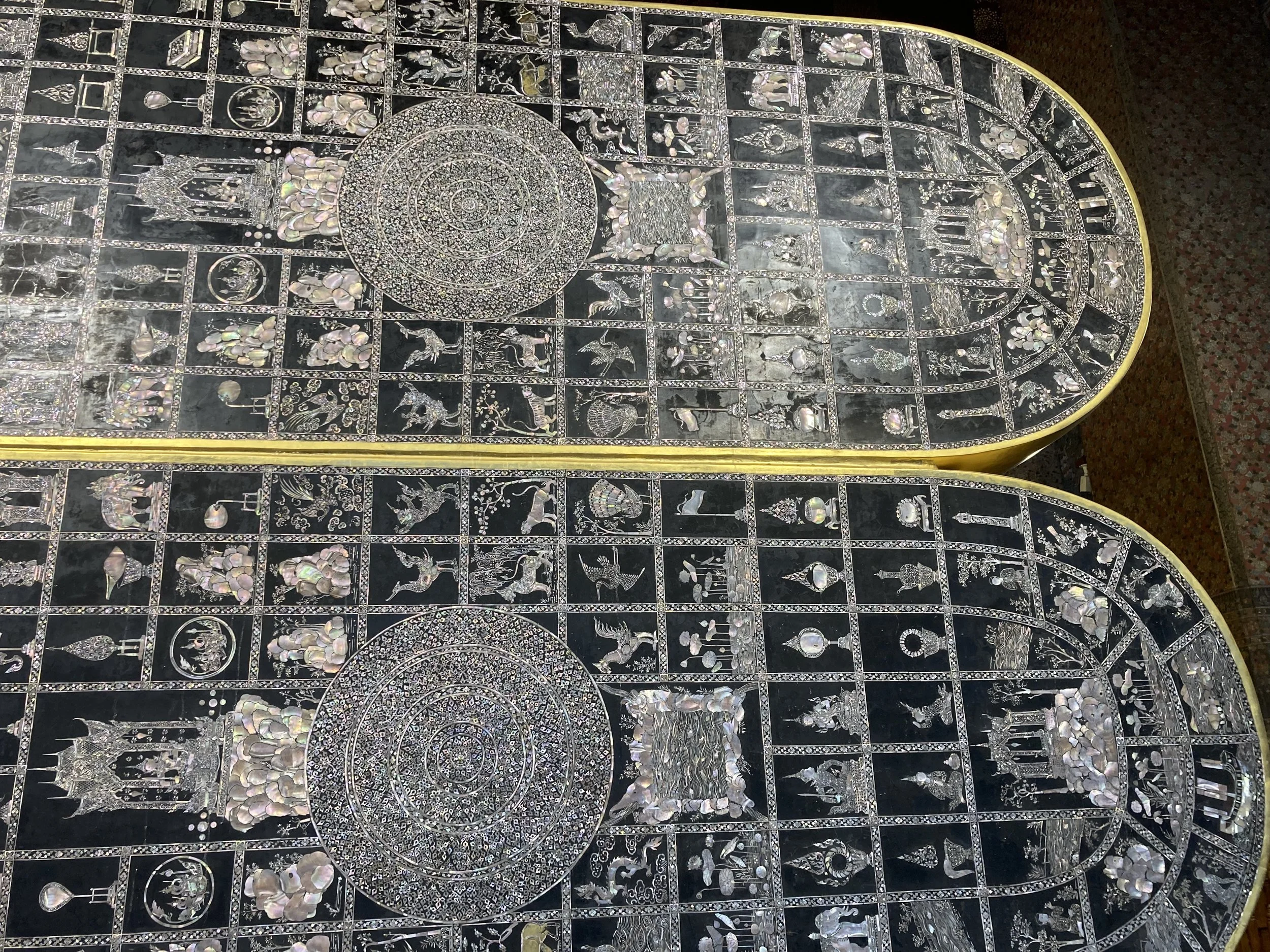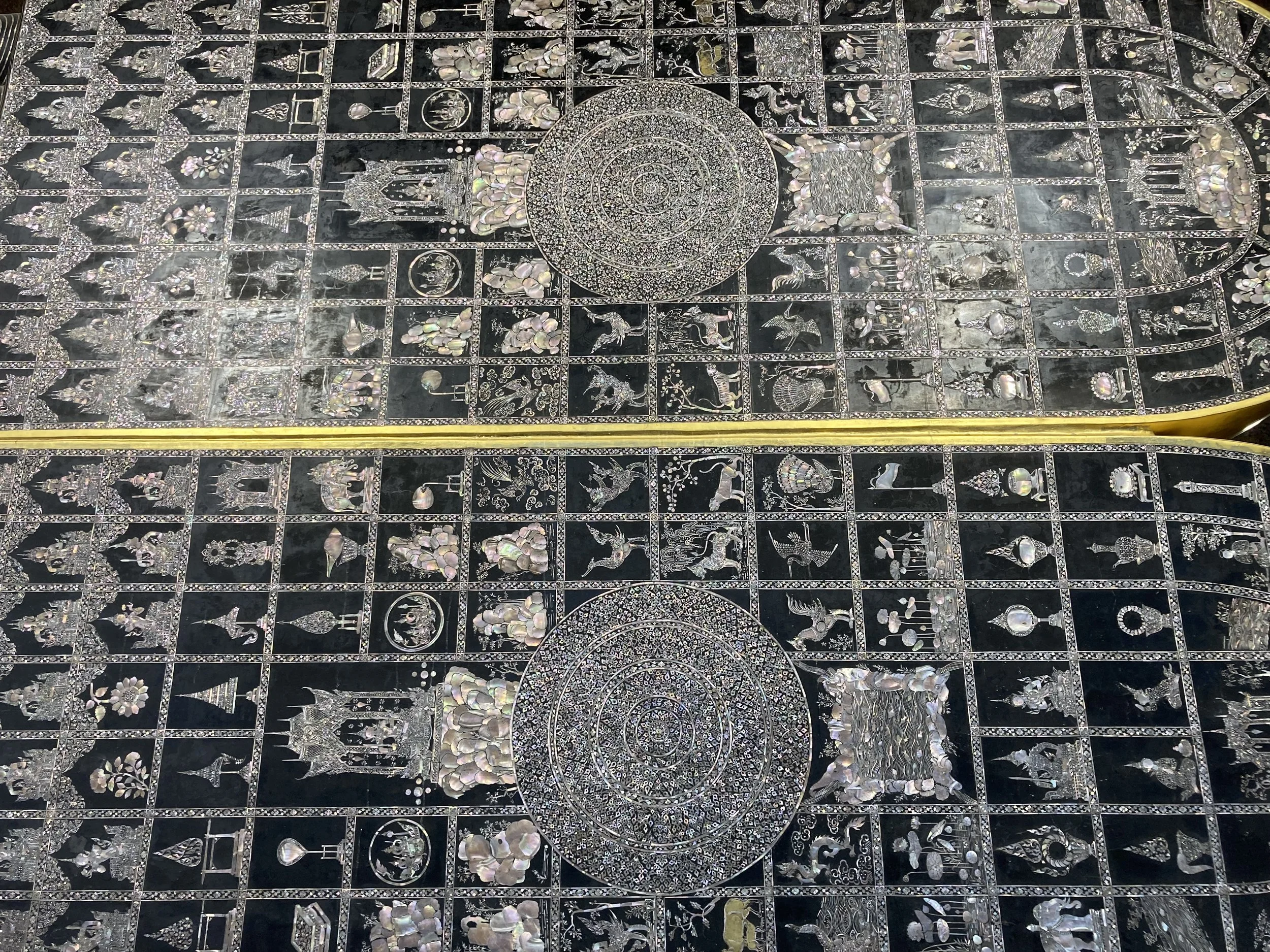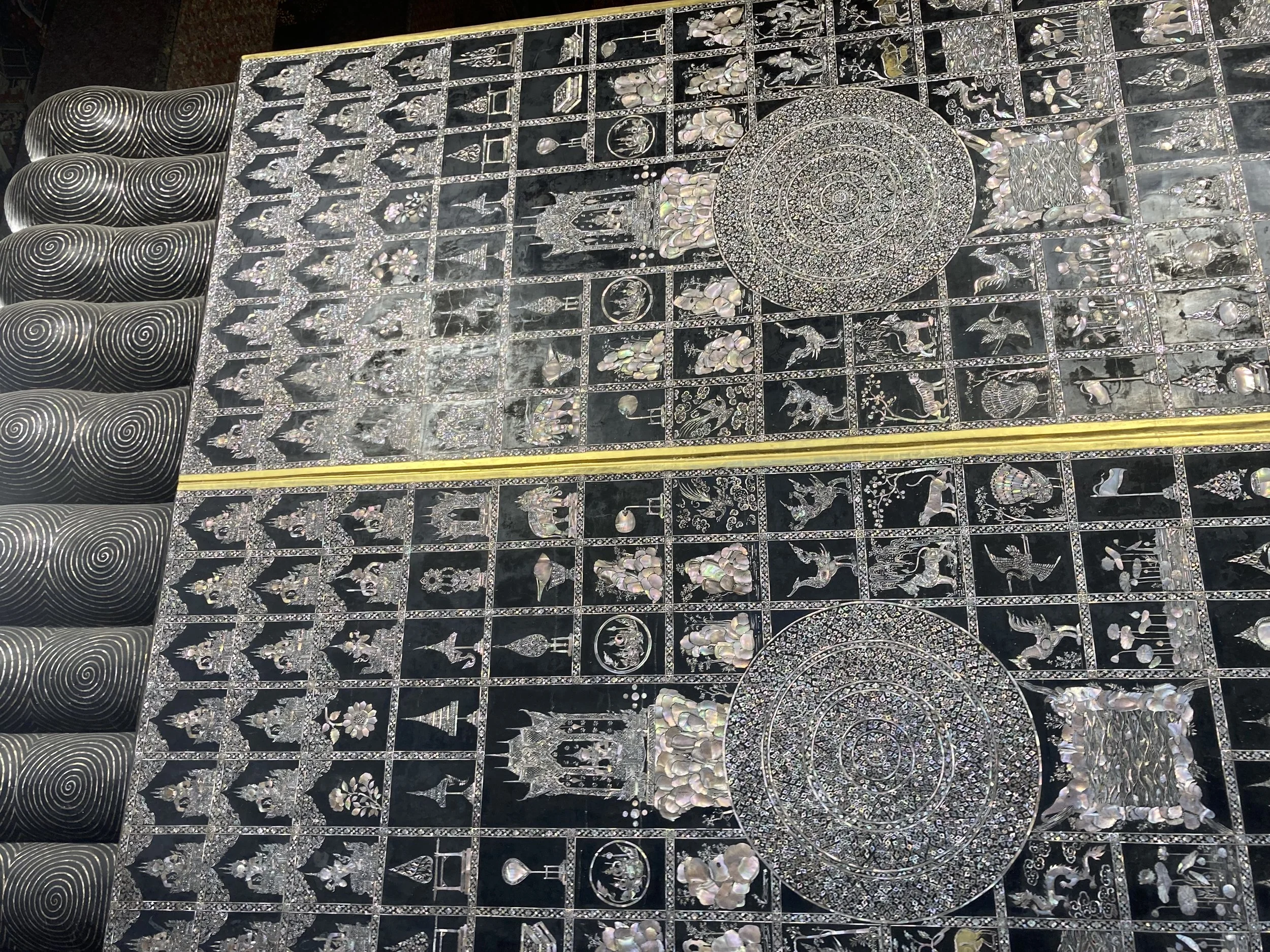 The soles of the Buddha's feet are inlaid with mother-of-pearl, depicting 108 auspicious signs of the Buddha. Again, according to Uncle Google, these are symbols of the Buddha's enlightenment, representing his perfection and the journey to nirvana. These signs include a variety of symbols, such as a central wheel (dharma) on each foot, flowers, dancers, white elephants, tigers, altar accessories, and symbols of fortune and cosmology. The 108 symbols are inlaid in mother-of-pearl and are grouped into categories like symbols of fortune, royal attributes, and parts of religious cosmology.