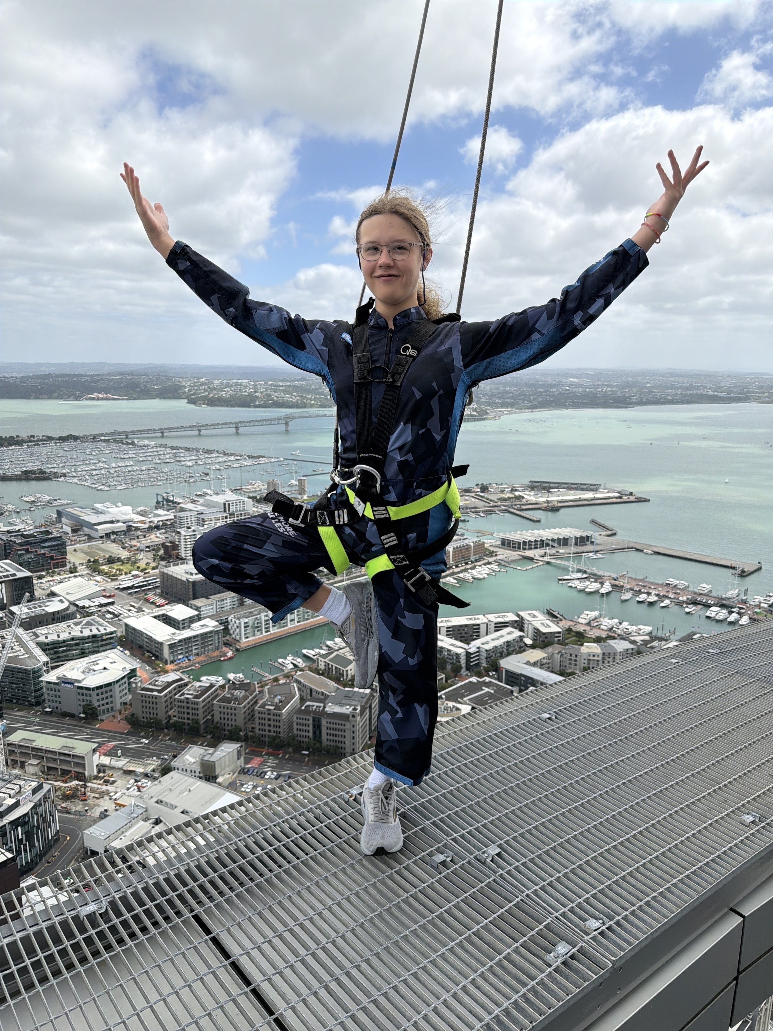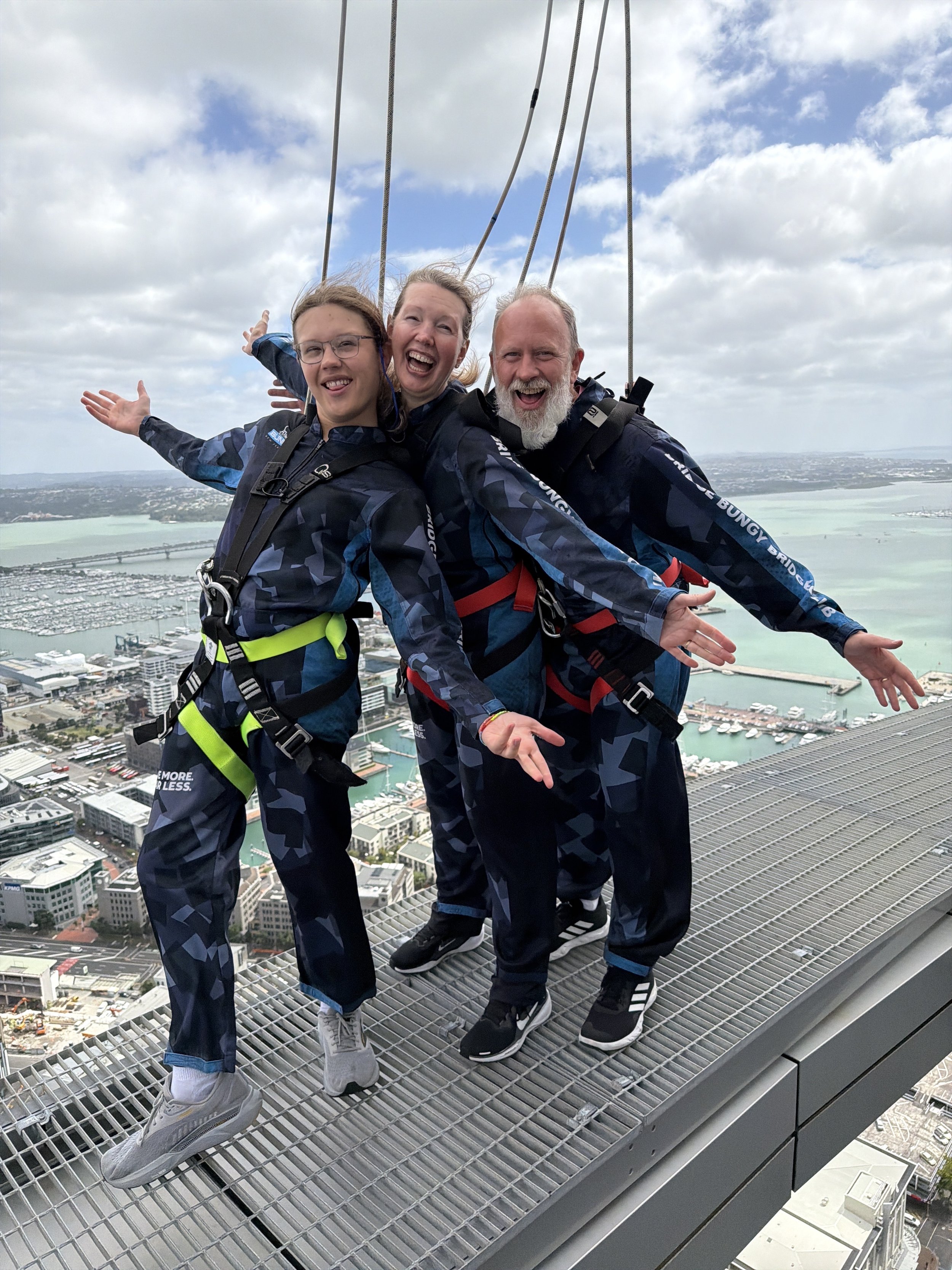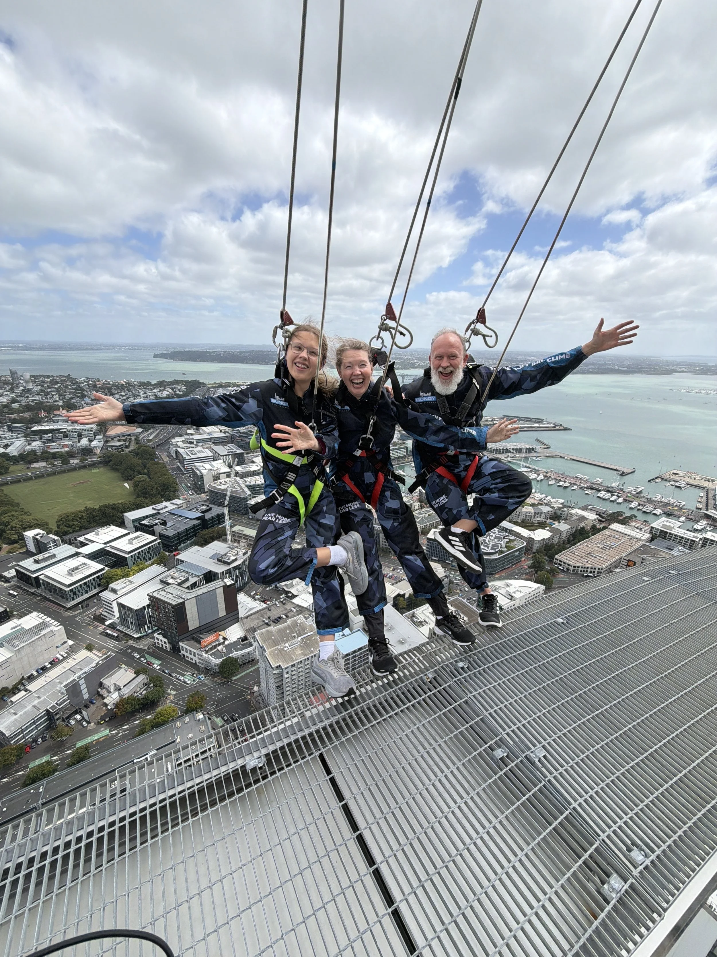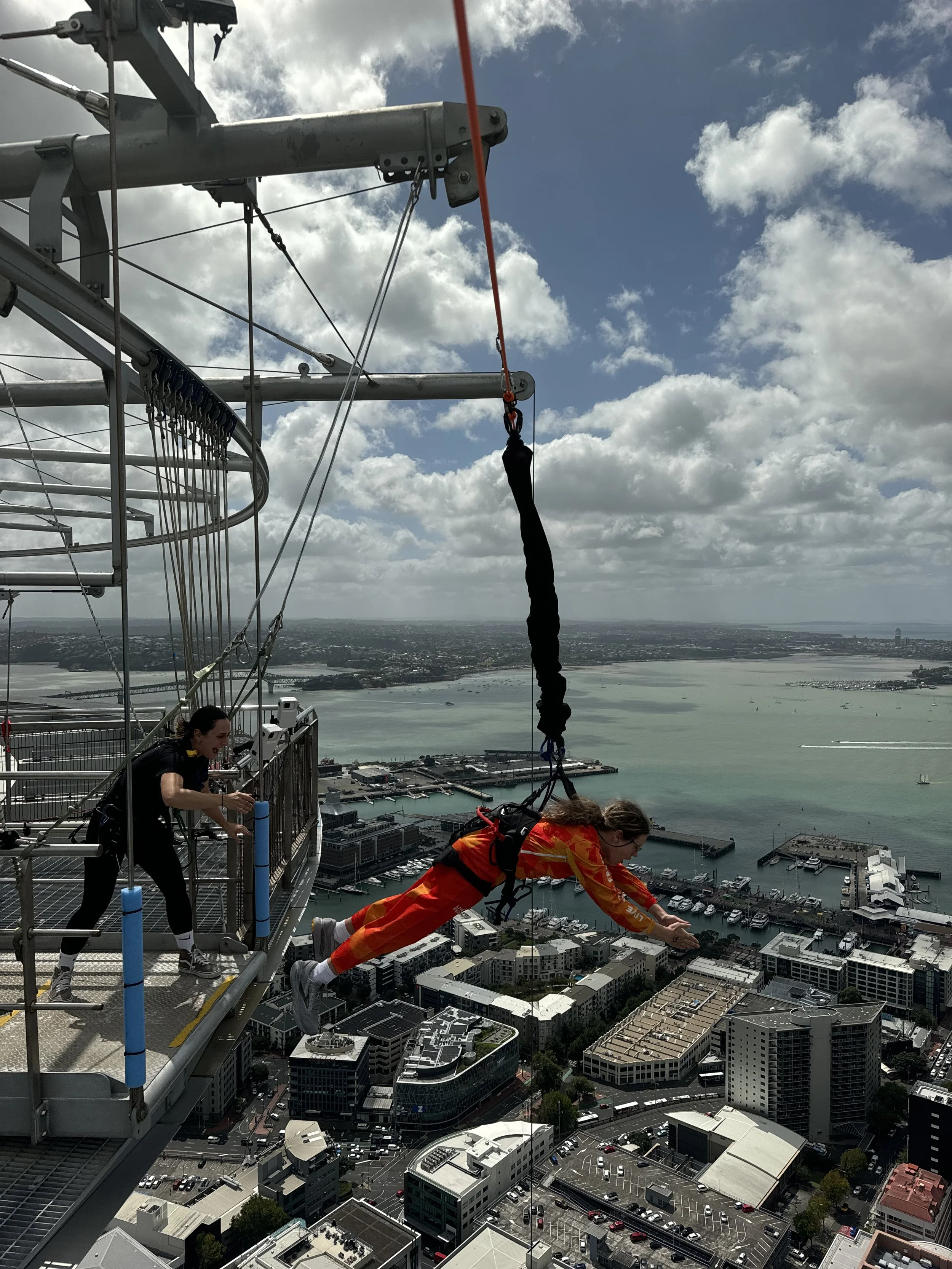 I thought a 43 meter jump off a bridge in Queenstown was epic. I mean, it was and is, for sure, but today we met another challenge that’s nearly 4.5 times more challenging in terms of the 192 meters that Elena, Violet and I jumped from today. You know those Sky Towers most cities have? Well today, here in Auckland, today each of us walked fully around it and jumped!