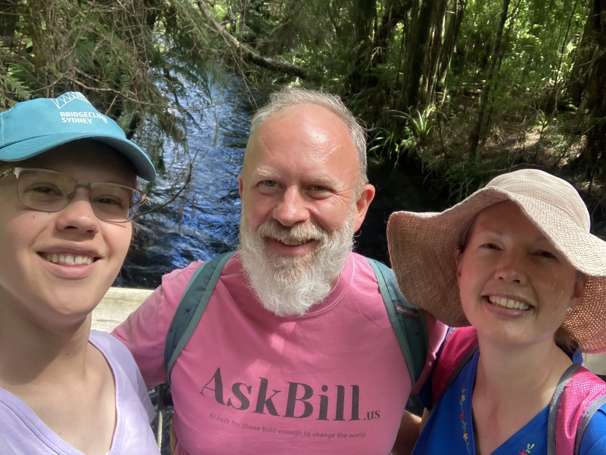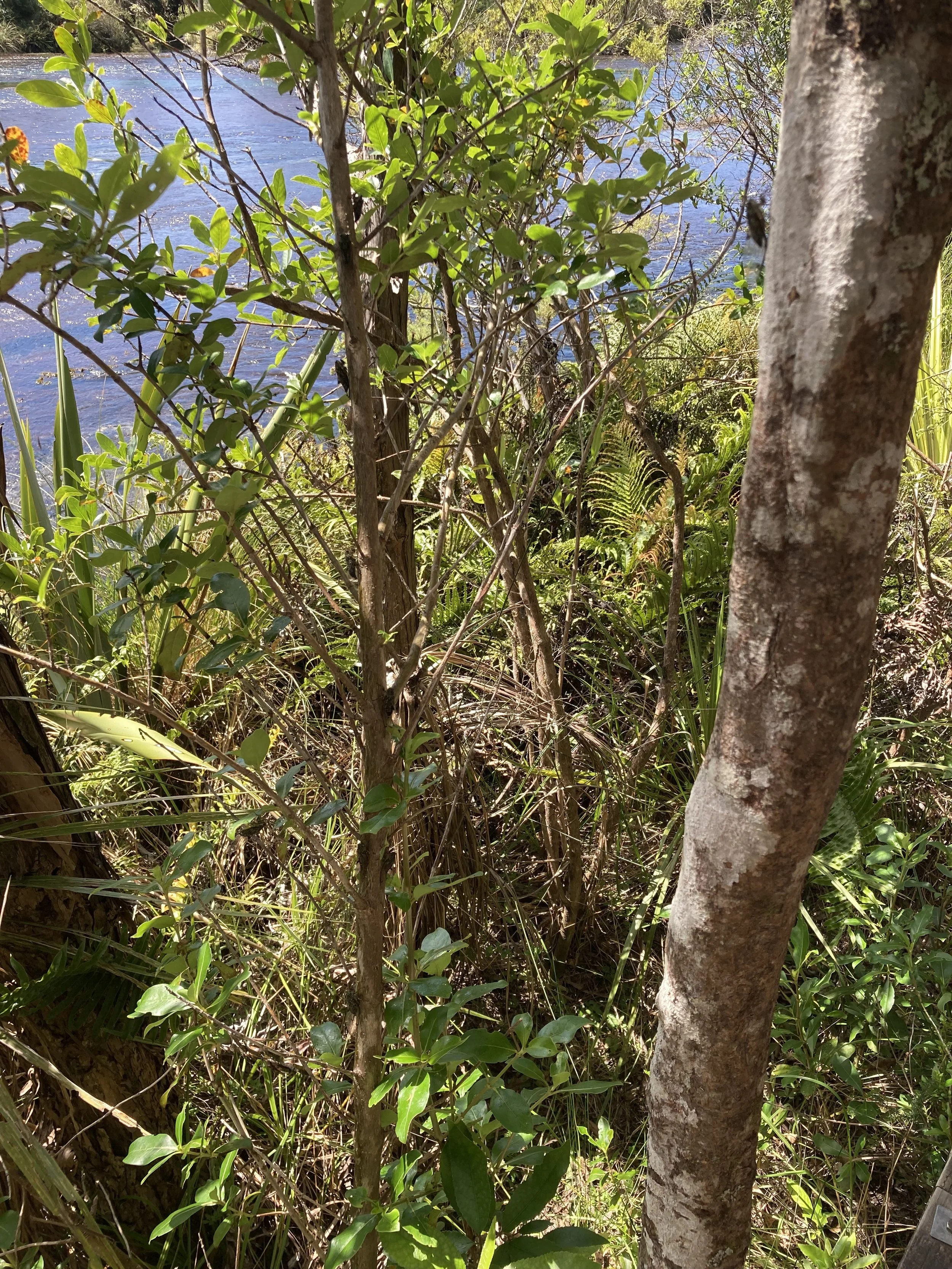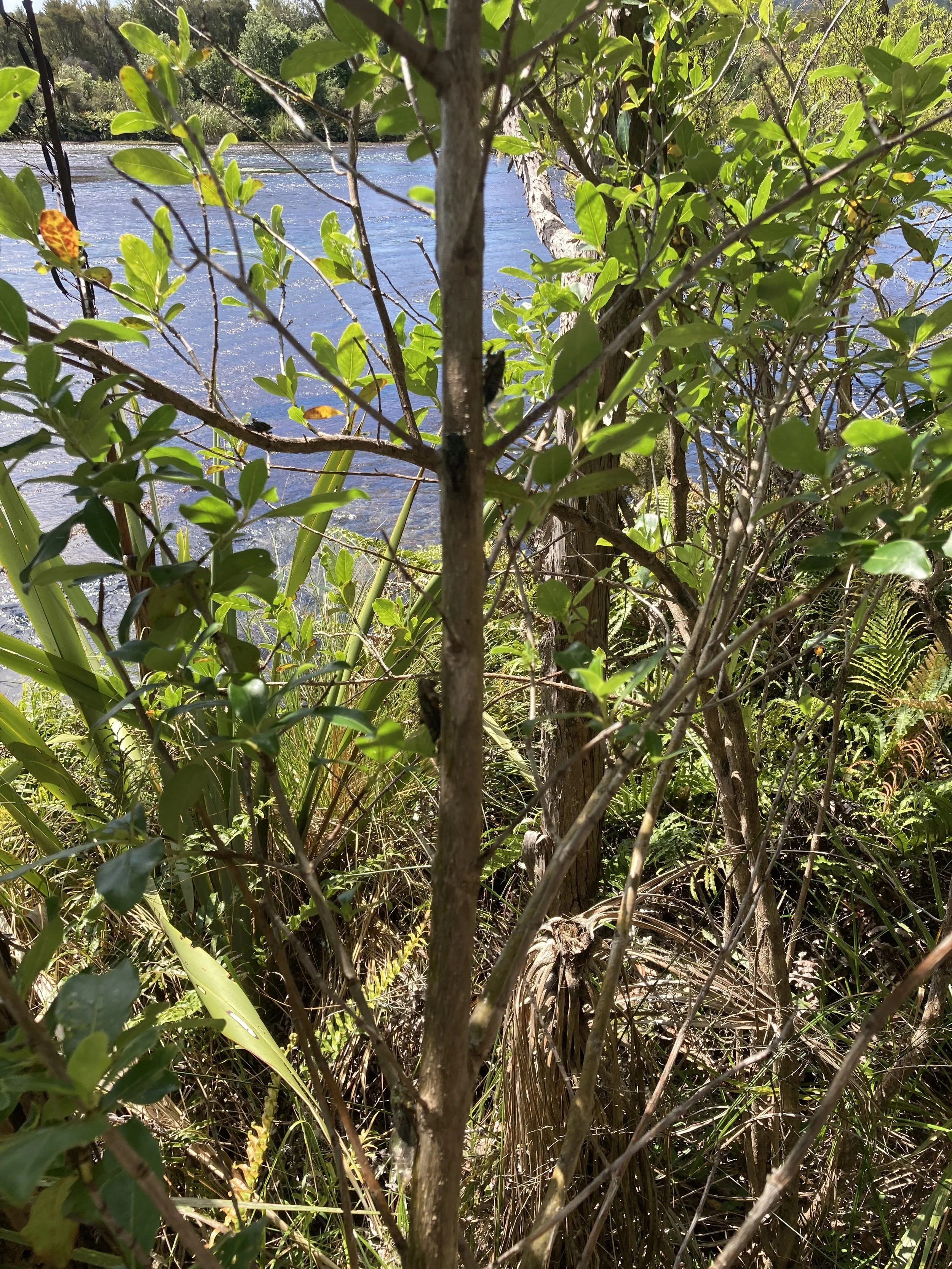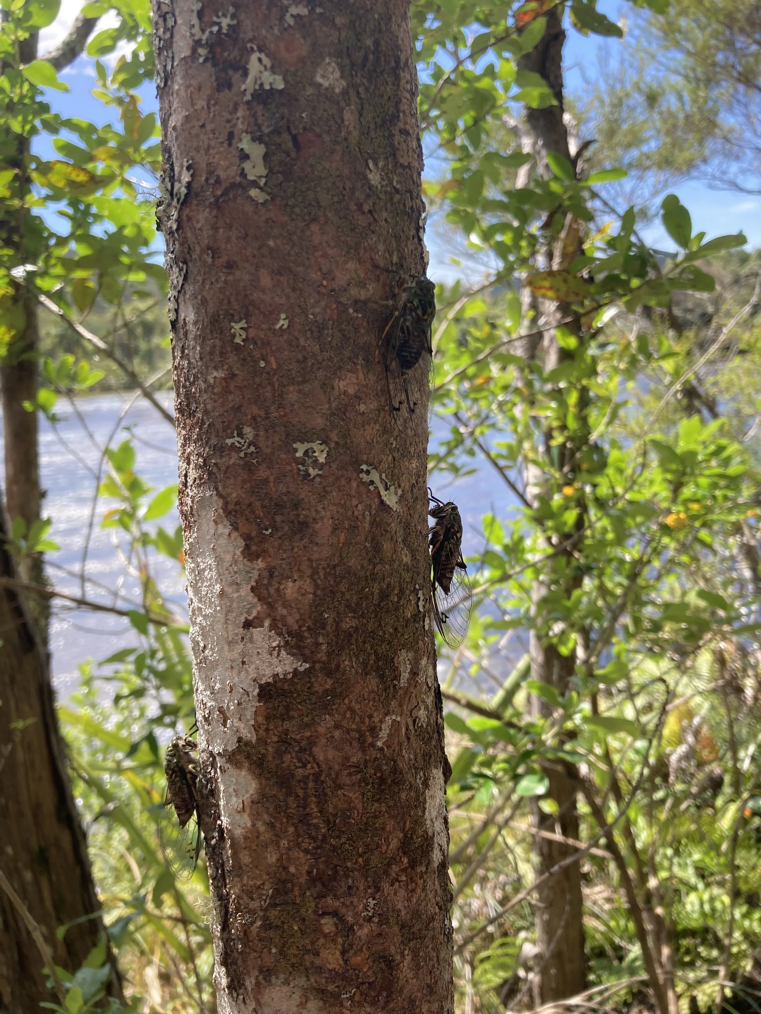 One thing to point out is that the only thing louder than the rushing white water around this spring are the cicadas. Oh my word … these insects LOUD!!! It’s a constant hum in the background, except when they get excited there a sort of crescendo. It’s not just this location, but everywhere we’ve been in nature in New Zealand. It doesn’t bother us as we have cicadas in New York too, but the chorus out here is its own experience. Here’s Violet staring deeply into one of them on a tree: