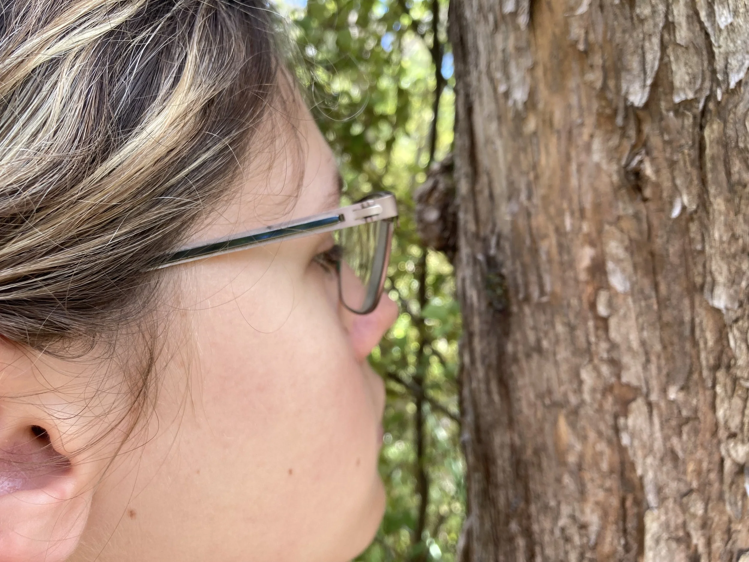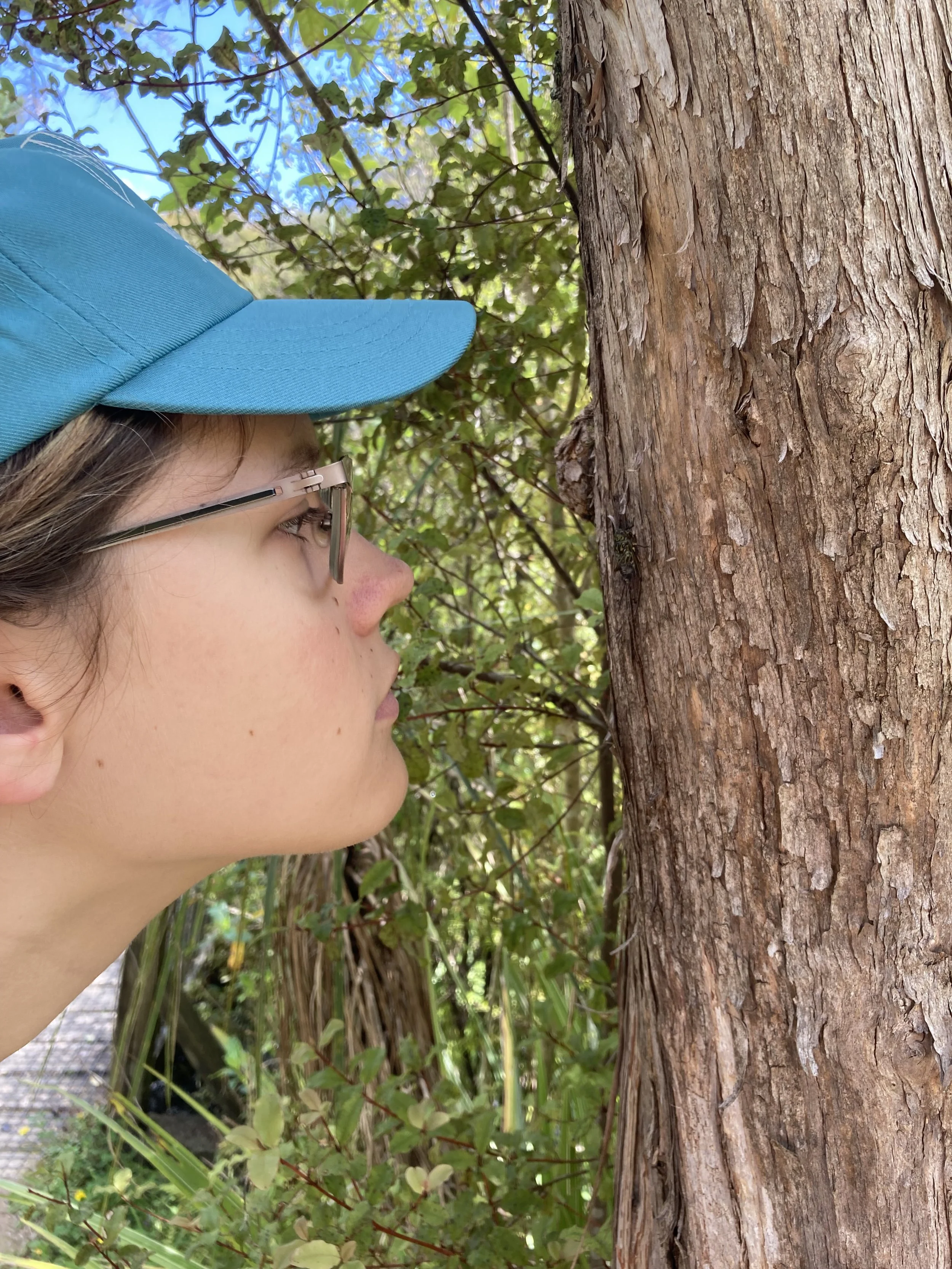The cicada is almost invisible on this tree. Follow Violet’s nose …