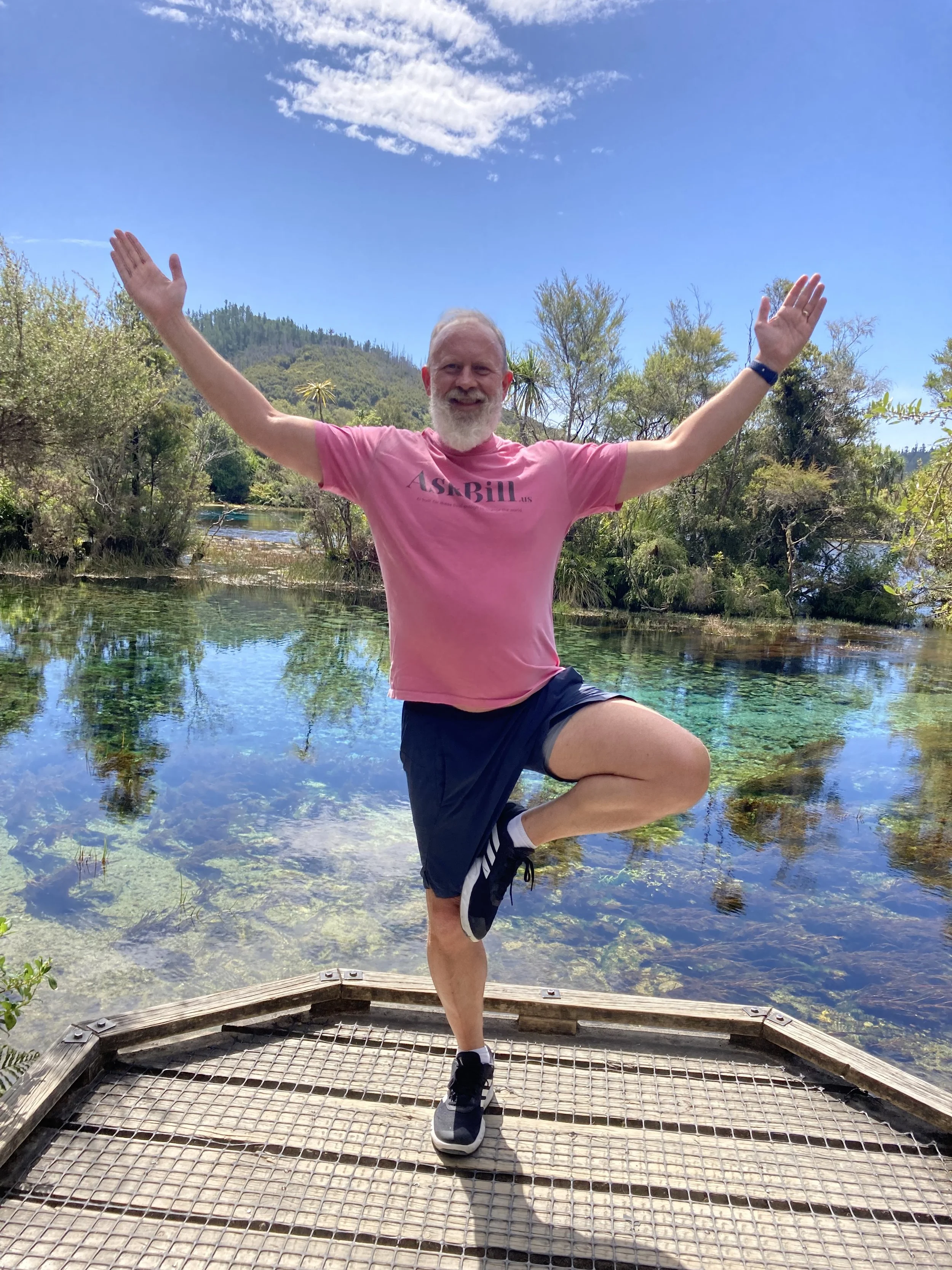 Tree pose in front of Te Waikoropupu Springs. Nice spot for yoga!
