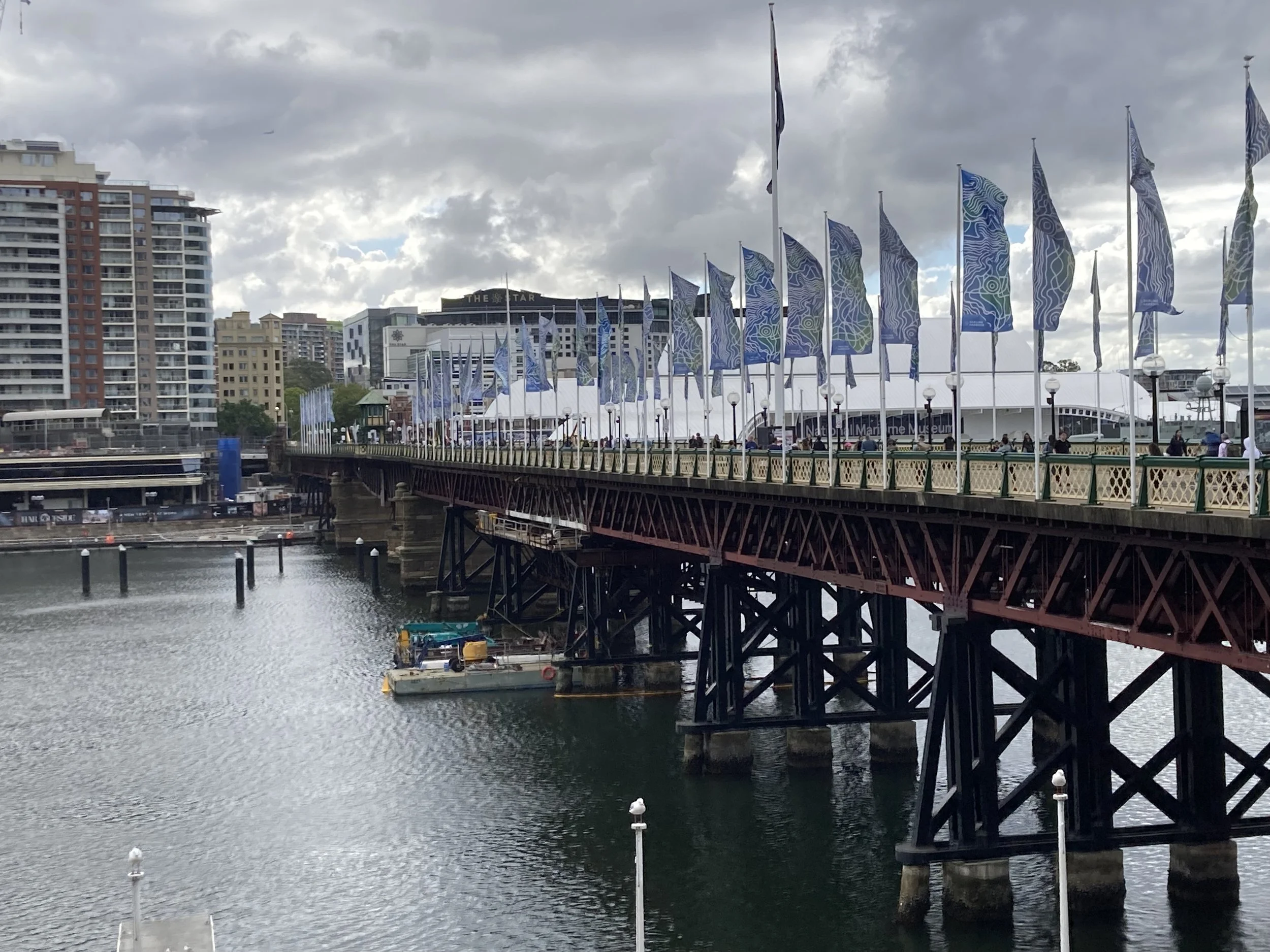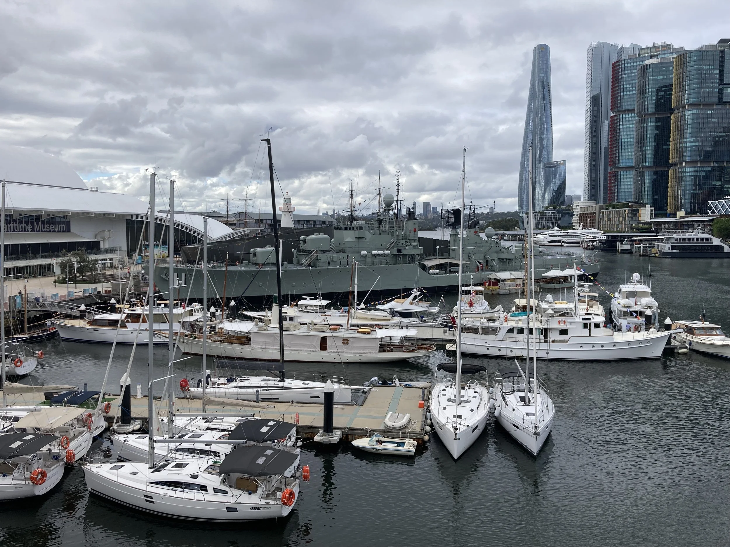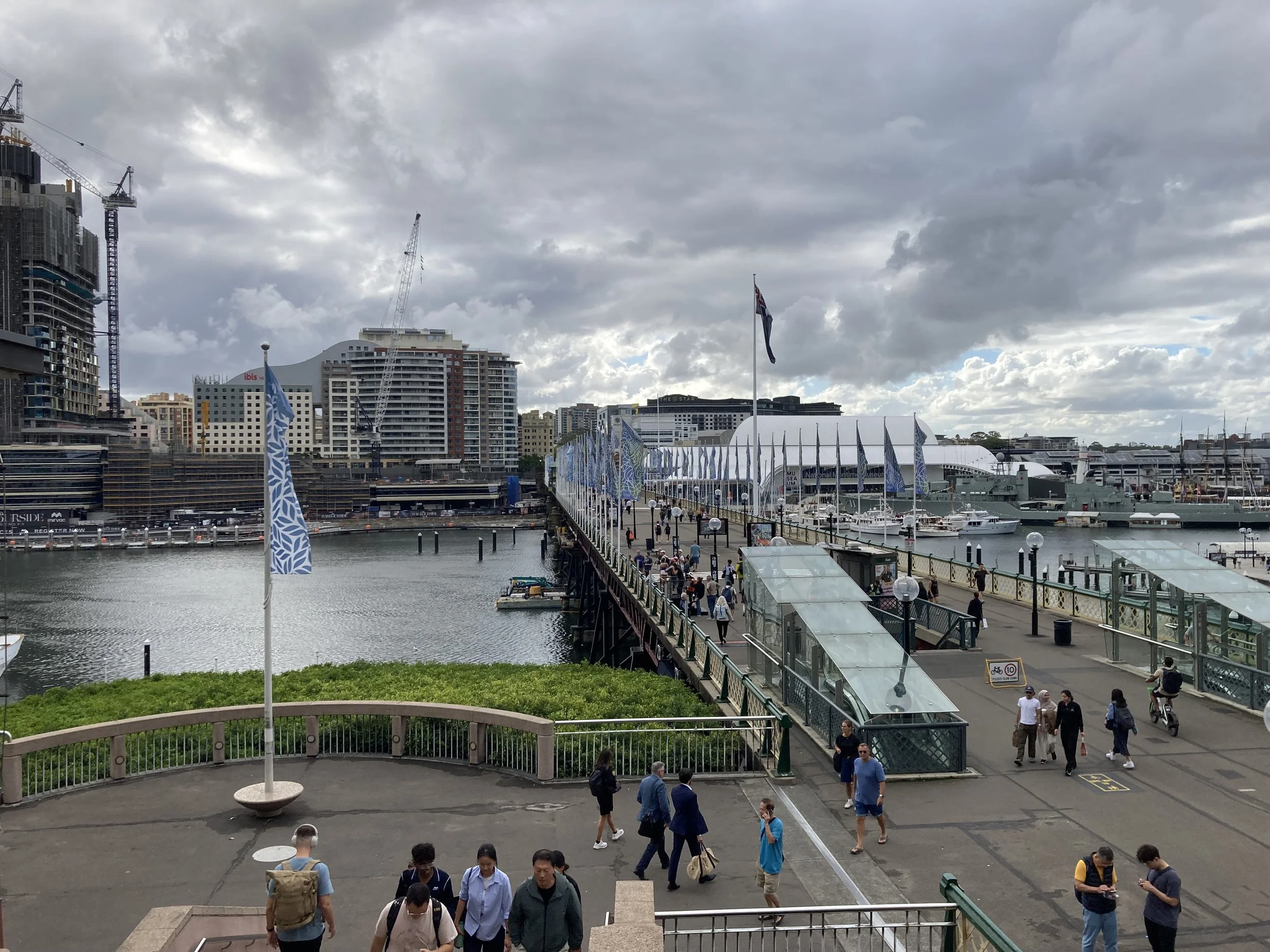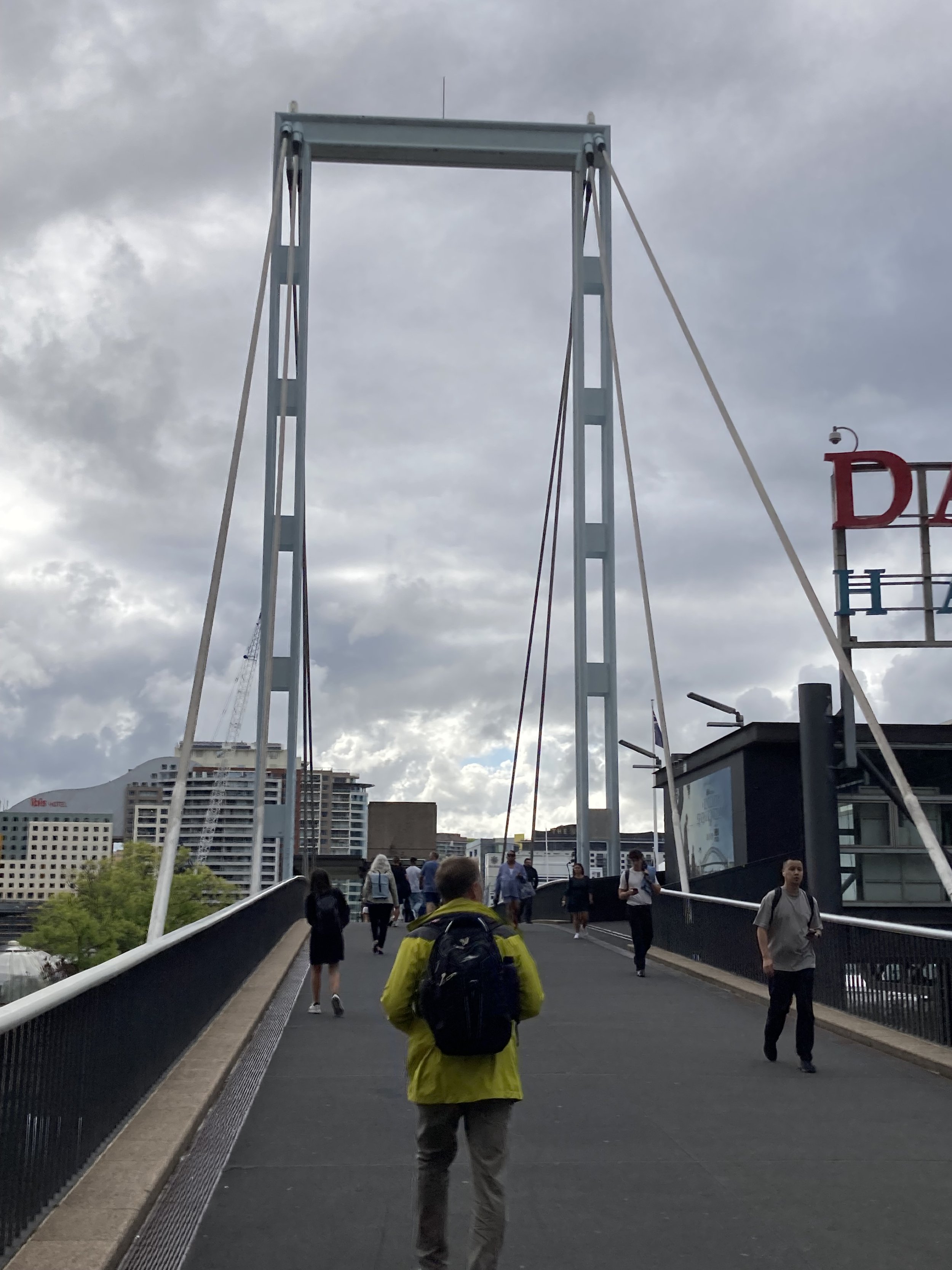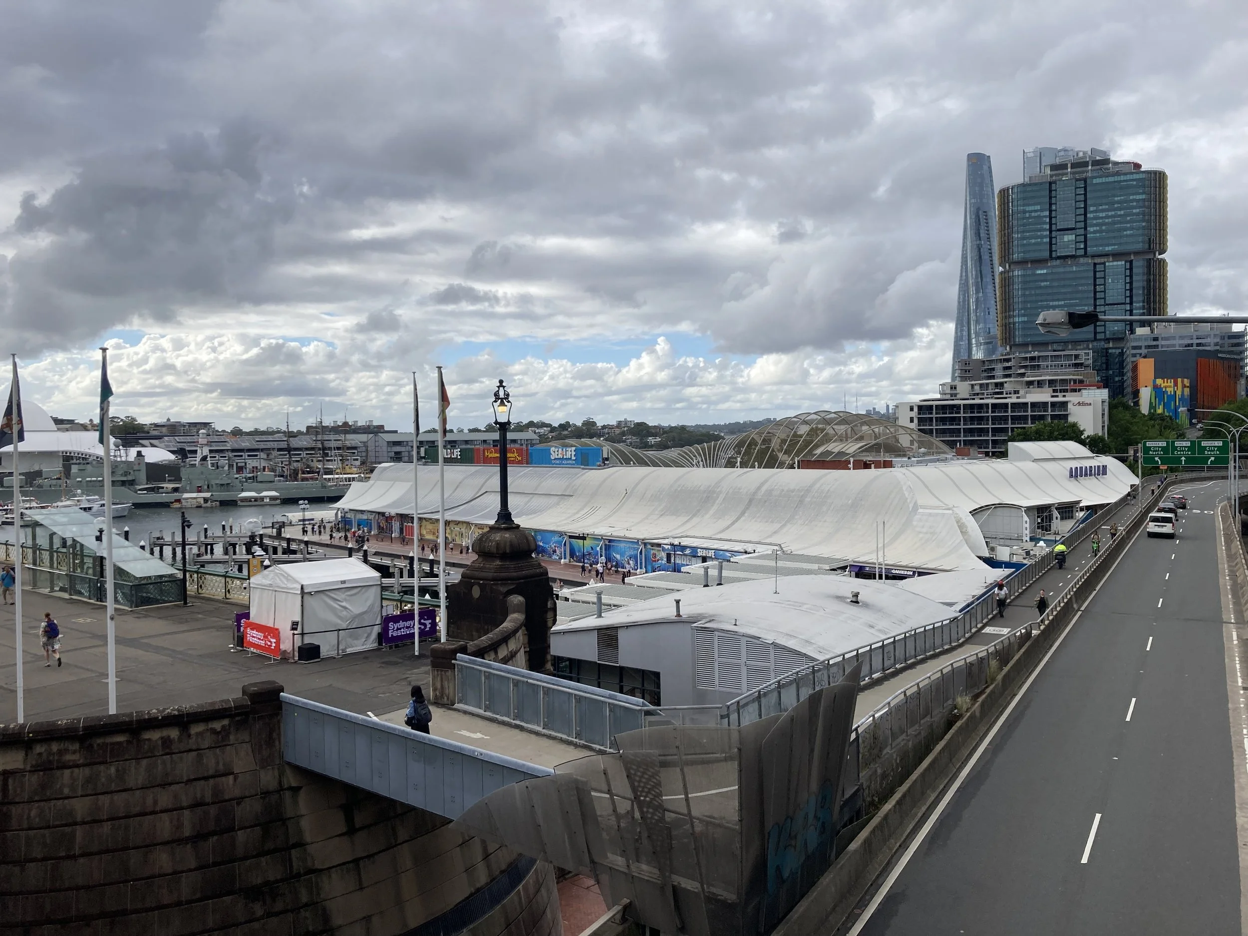 I was THRILLED with what I discovered on my walkabout. Turns out, I’m staying in “Darling Harbor” which has a massive walking bridge overlooking the aquarium, mu-SEA-um, and this really cool exhibit I can’t wait to show Violet when she arrives. I won’t spoil it here. But feel free to take a look at what’s about 5 minutes from where I’m staying.