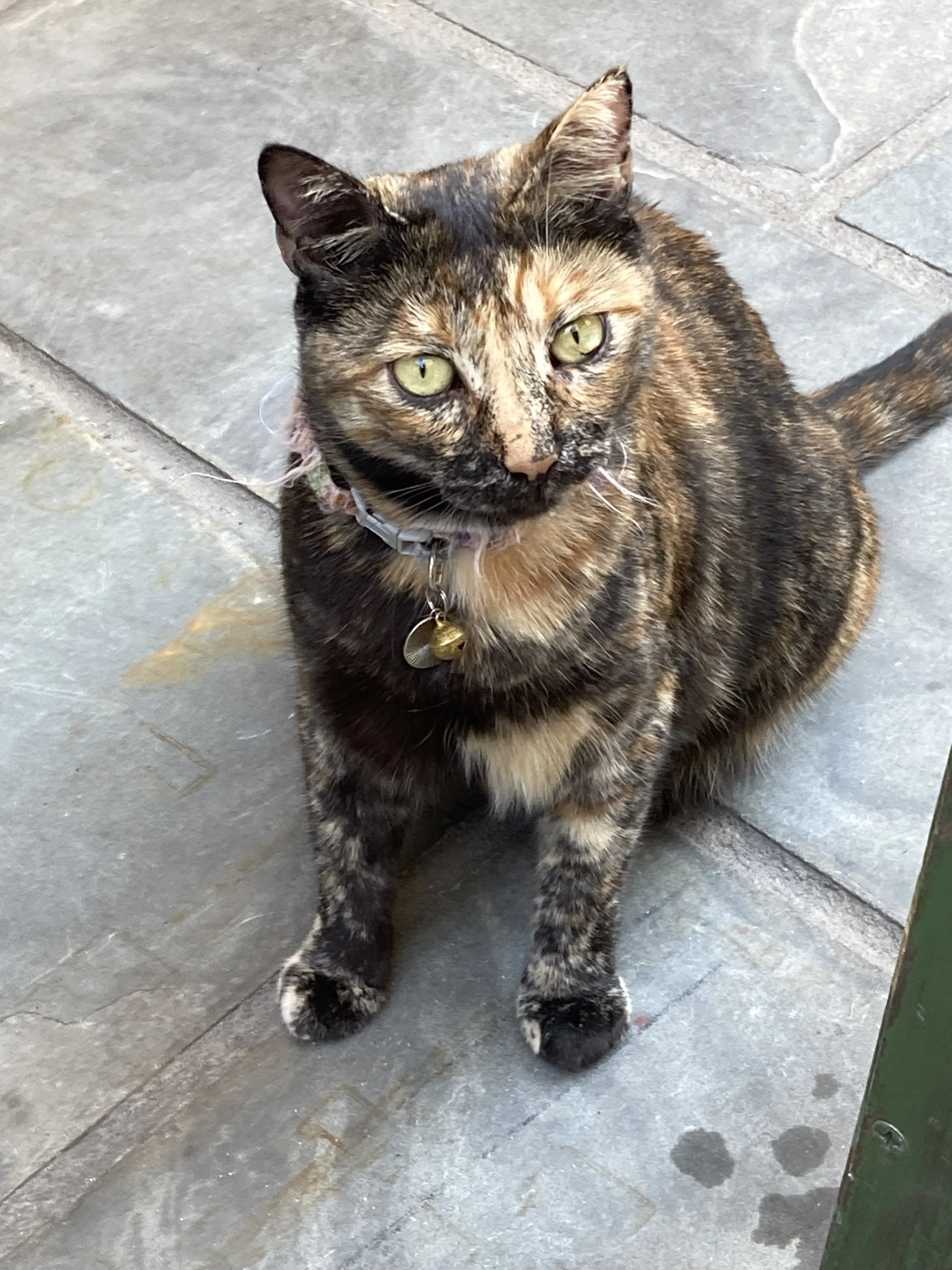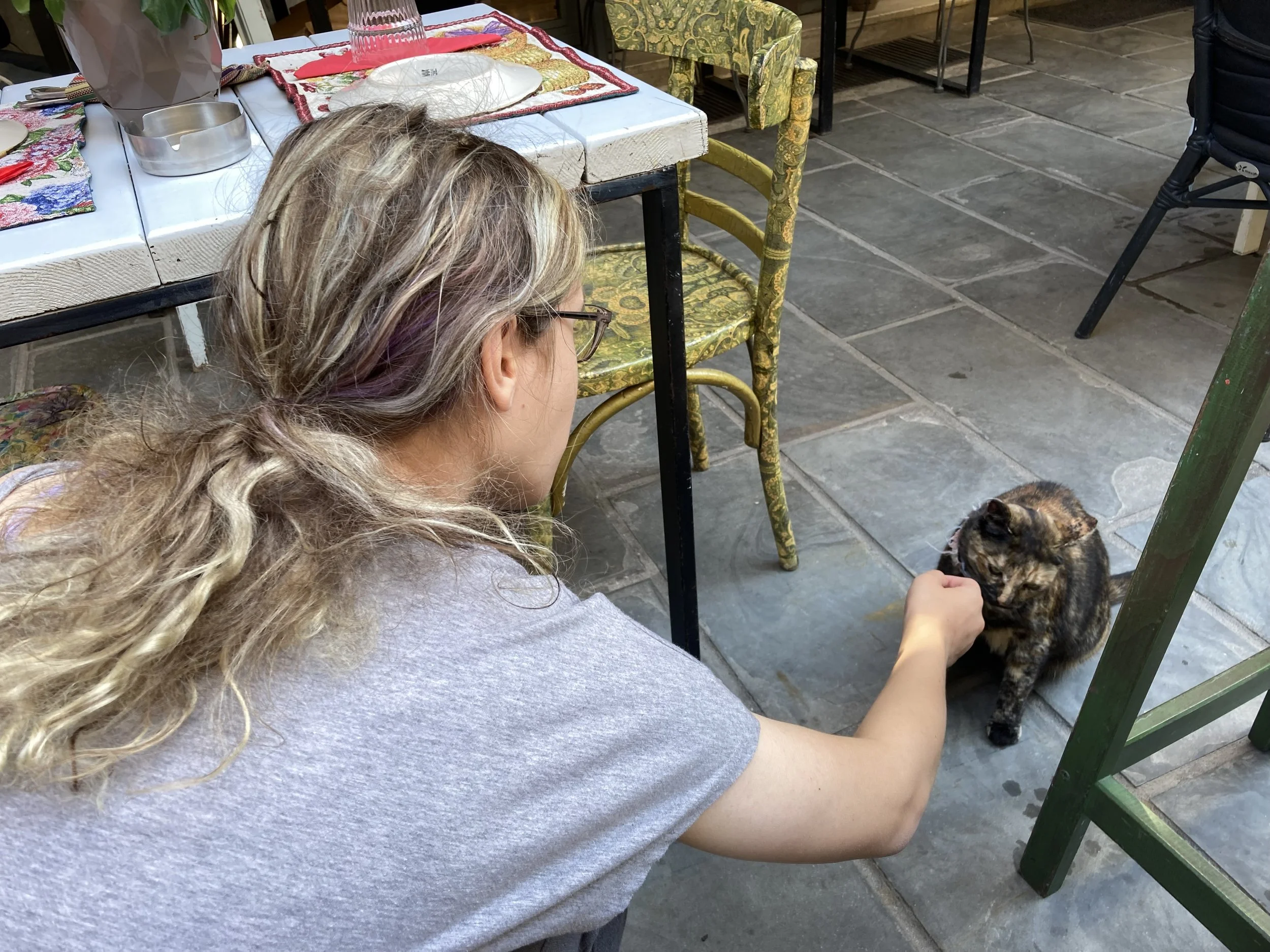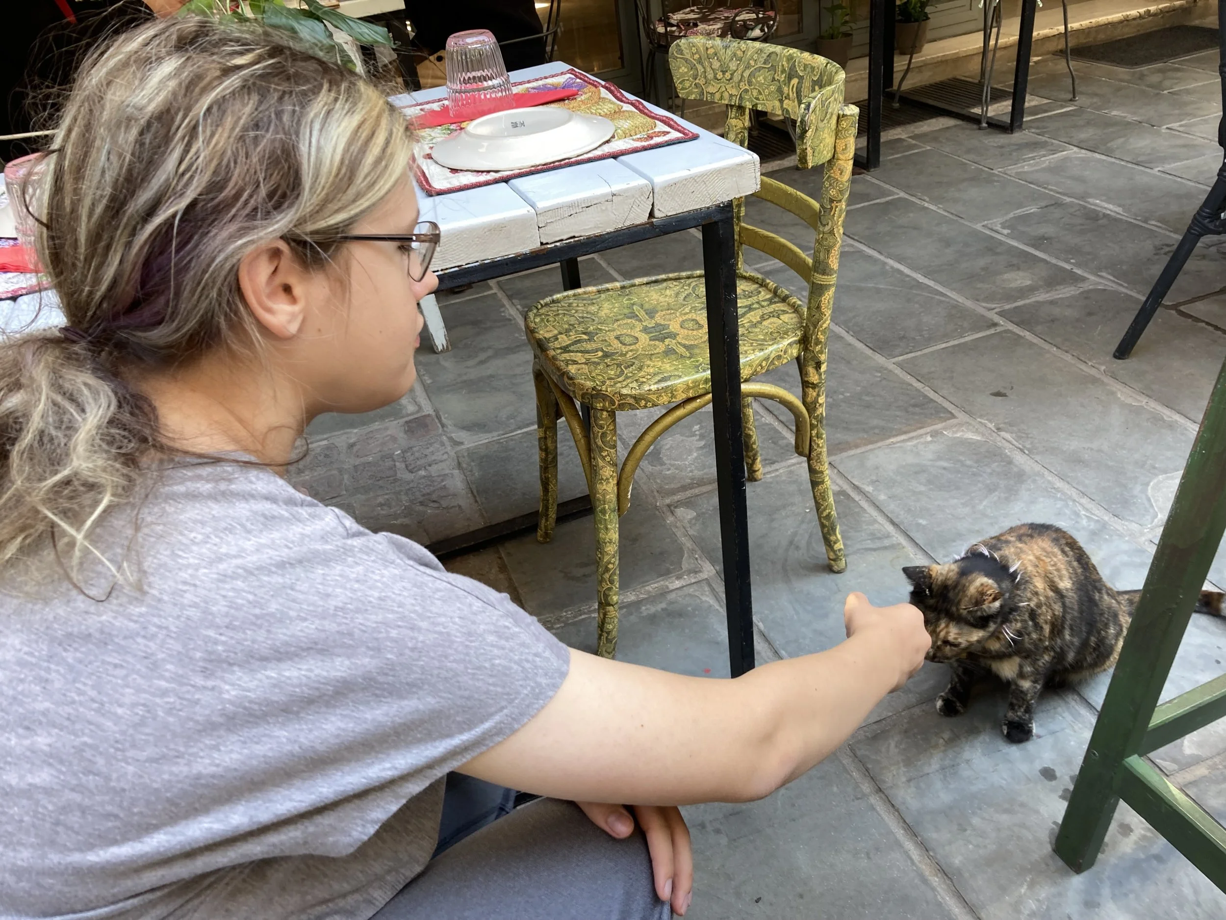 Violet finds one of many local cats hanging out at the restaurant