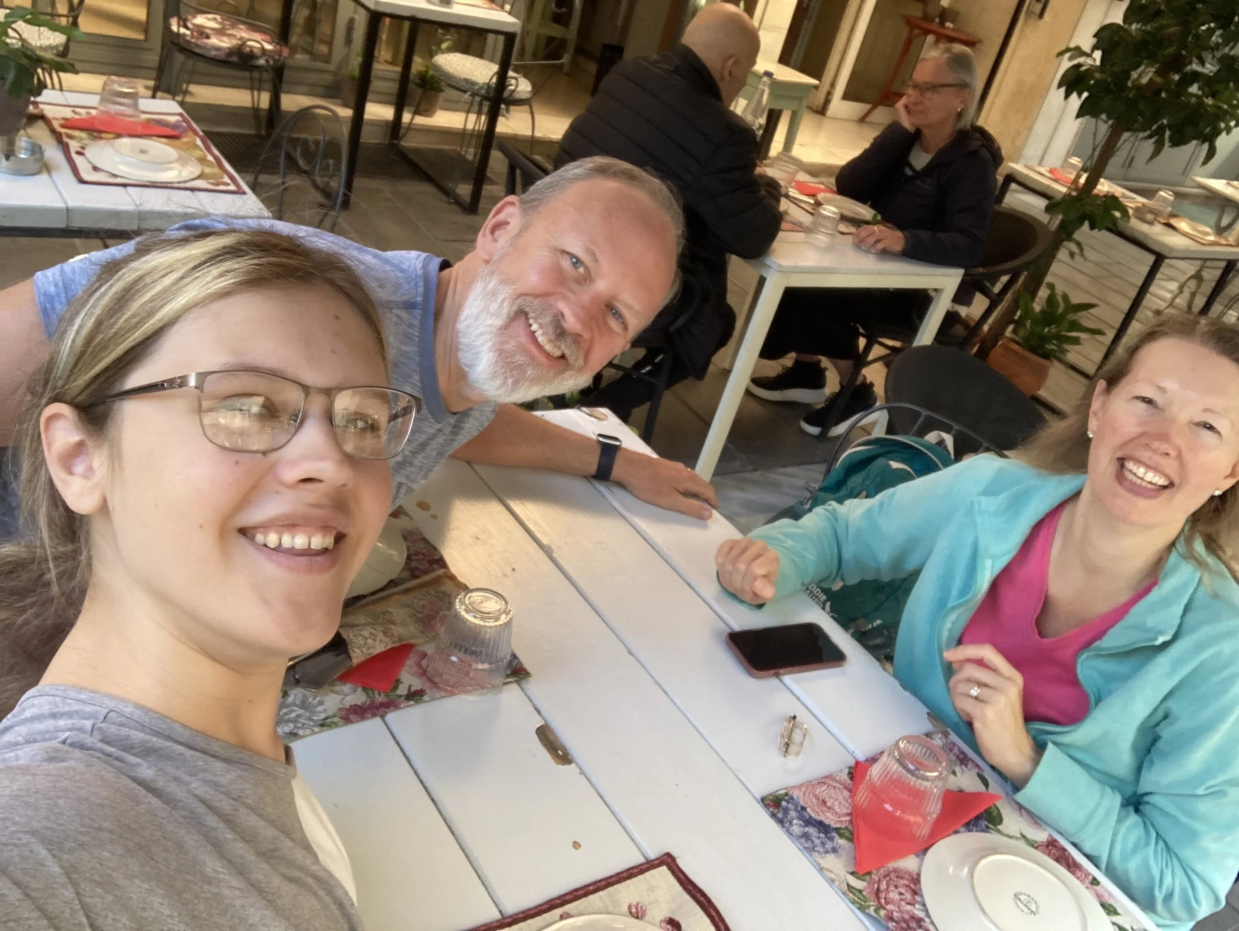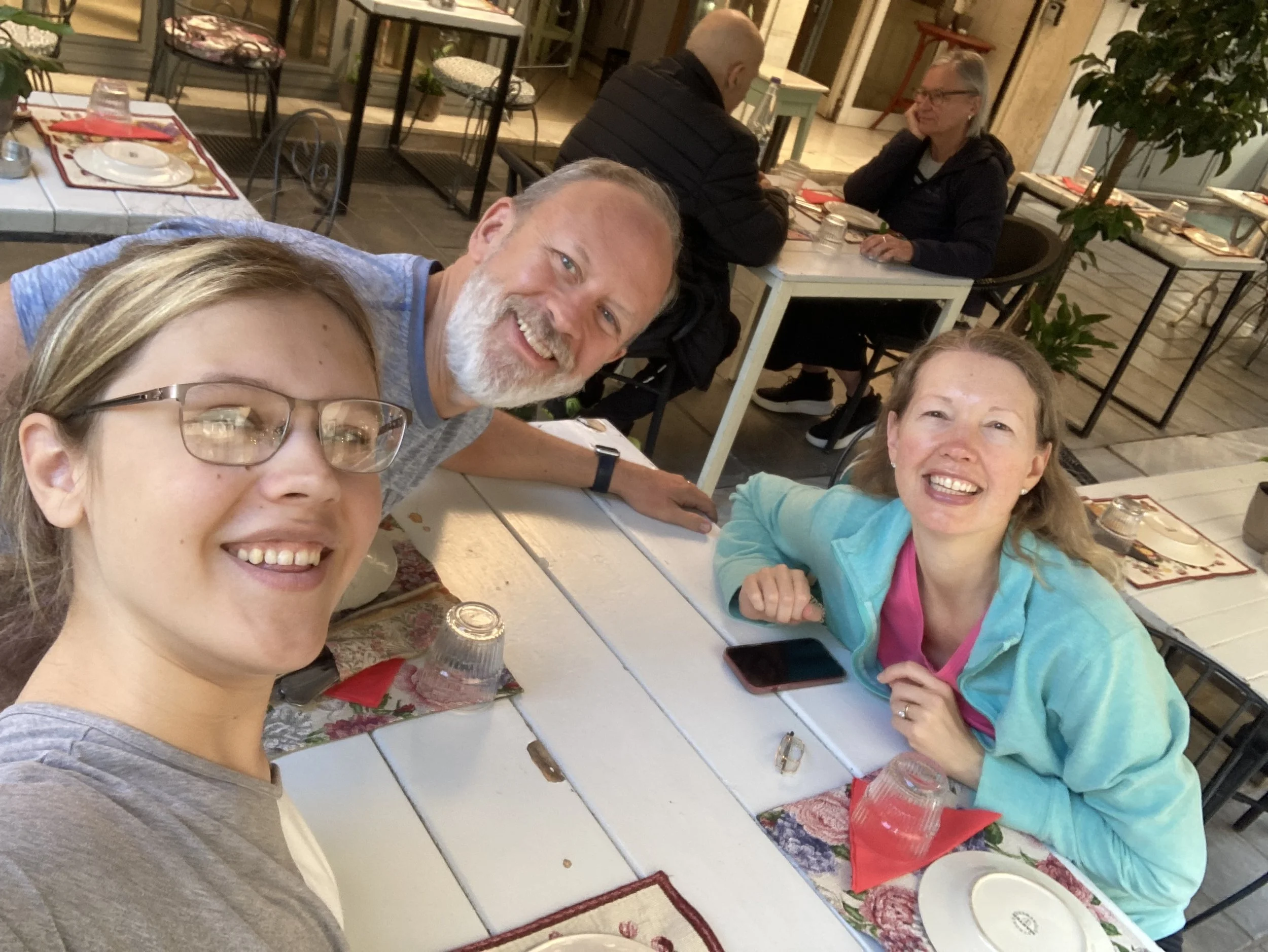 Another epic meal. Violet ordered the “Traditional Beef Dish” (the English translation of the Greek name) and it was heavenly. Slow cooked beef, seasoned to perfection. Spinach and some sort of sauce that we light and delicious. That plus the slow cooked beef stew over eggplant puree, Greek salad, and even the simple chicken and large sized couscous in a light (tahini?) sauce. Everything was gone and no room for desert. So good. So authentic. So wonderful to be here enjoying this with my family.