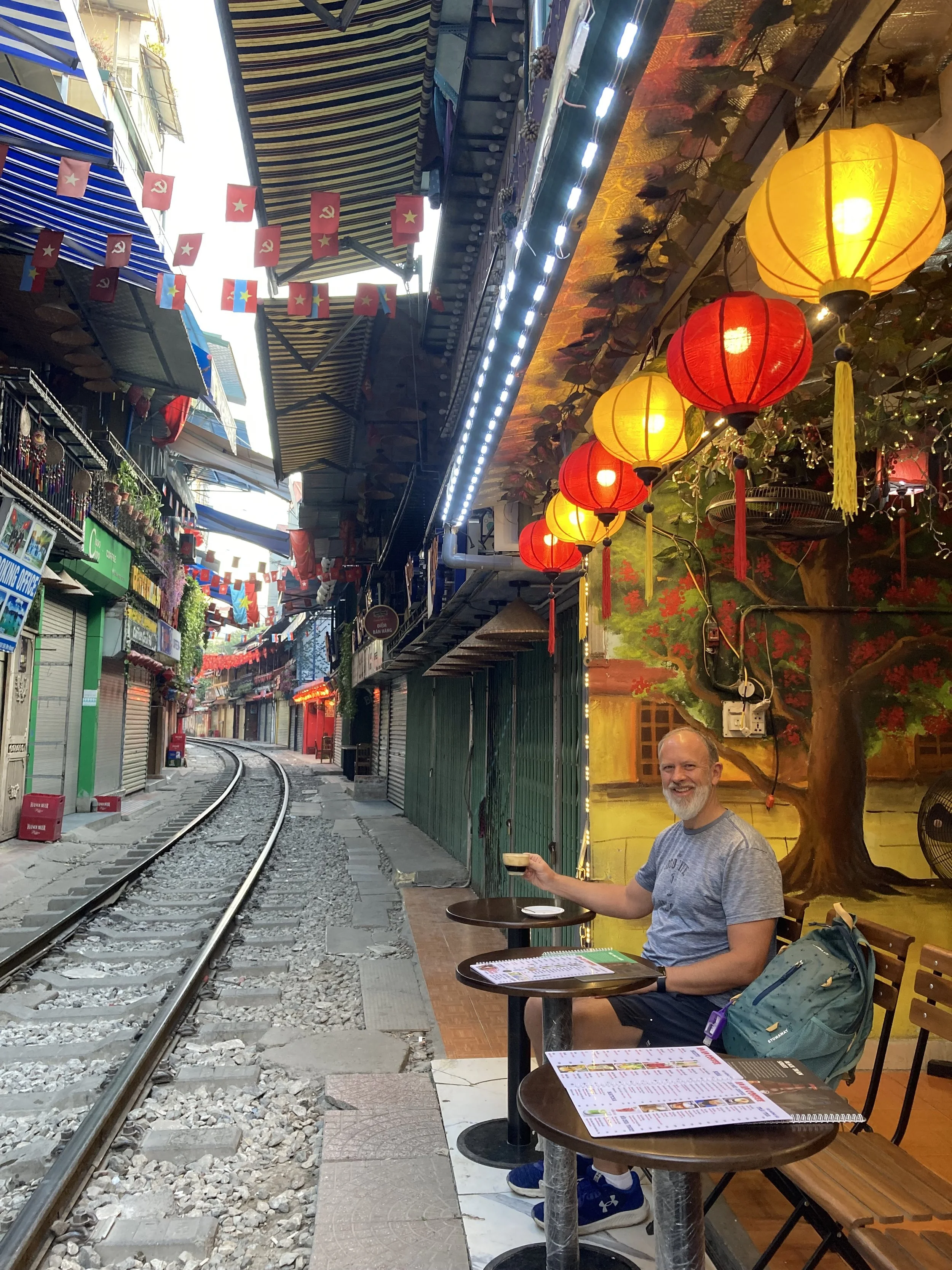 Enjoying an “Egg Coffee” on Train Street this close to the tracks!