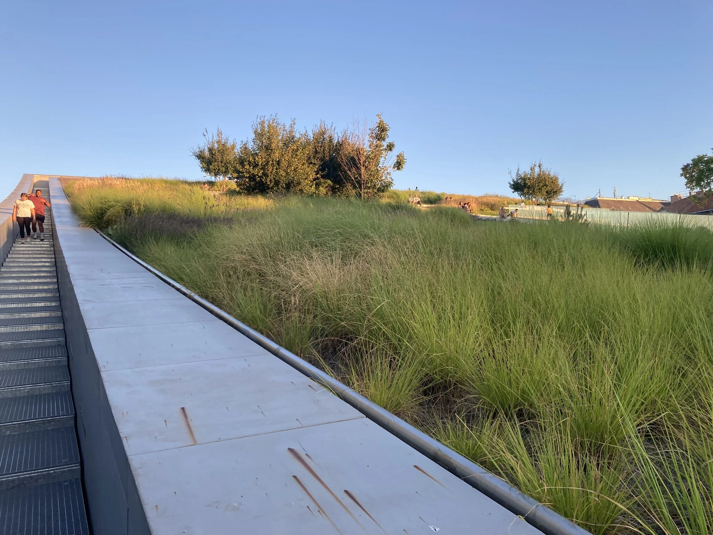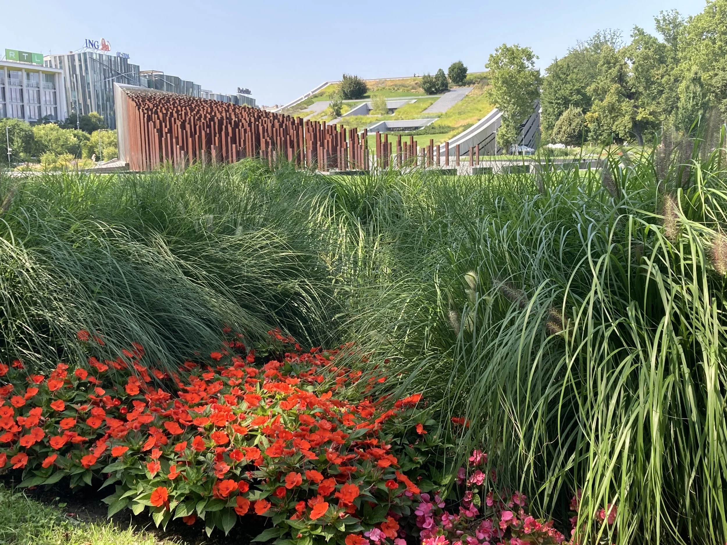 If you look at the picture above, take a moment and consider what you see. I think this is as good a picture as any to capture the depth of all the beauty that surrounds us and yet what exactly do we see? What do I tune into? What do I tune out? Am I drawn to the vibrant colors of the flowers in the foreground? Just the orange and reddish color or do I see the purple too? How much of the green do I allow to take in? The full rich dark green only or the lighter green in the background? The trees? The rust color of the artwork? What is that anyway? And what’s behind the artwork? That ramp slope with it’s own garden in the shape of a half-pipe? And the grey of the buildings to the left — what do they add to this picture?