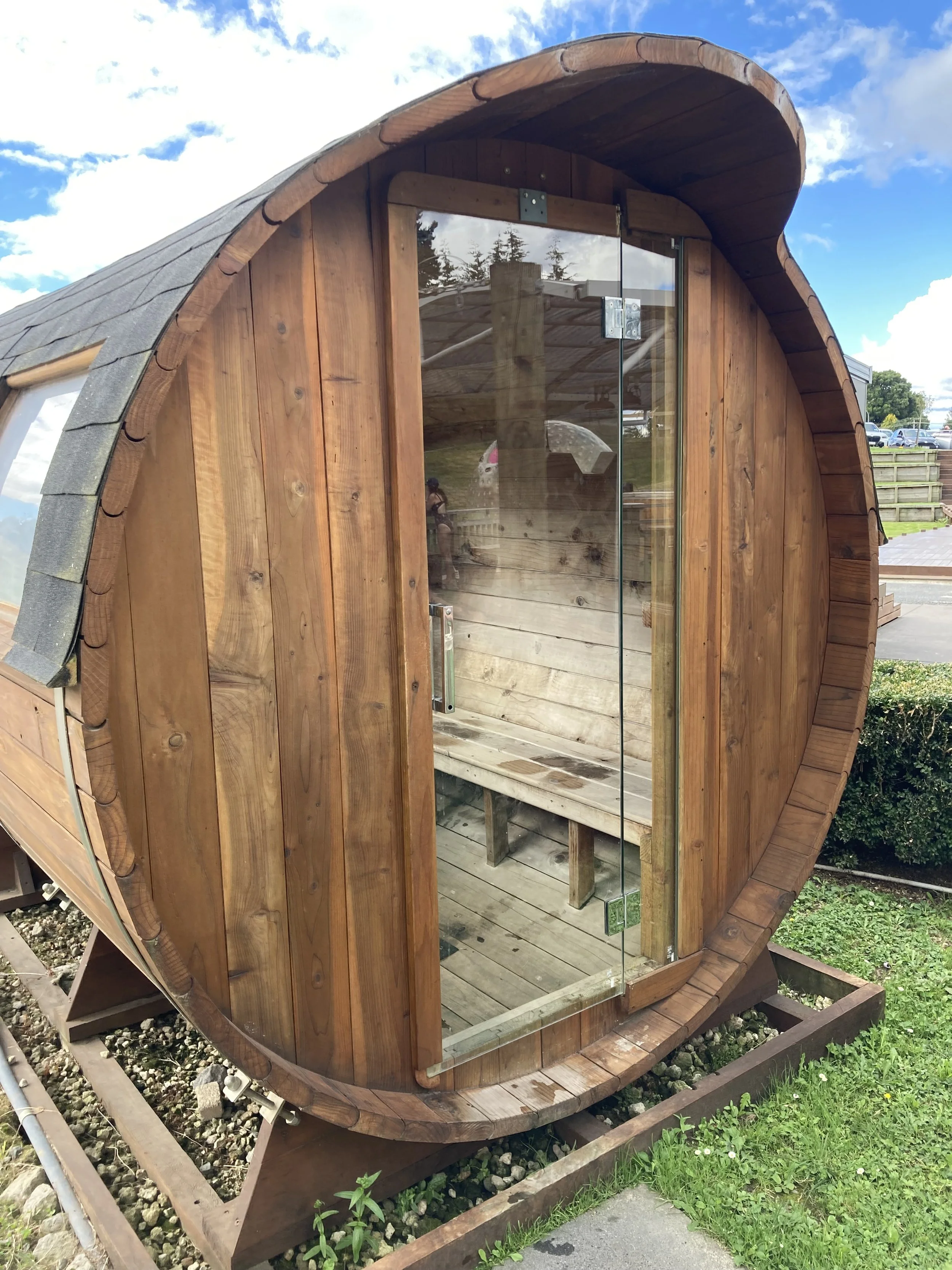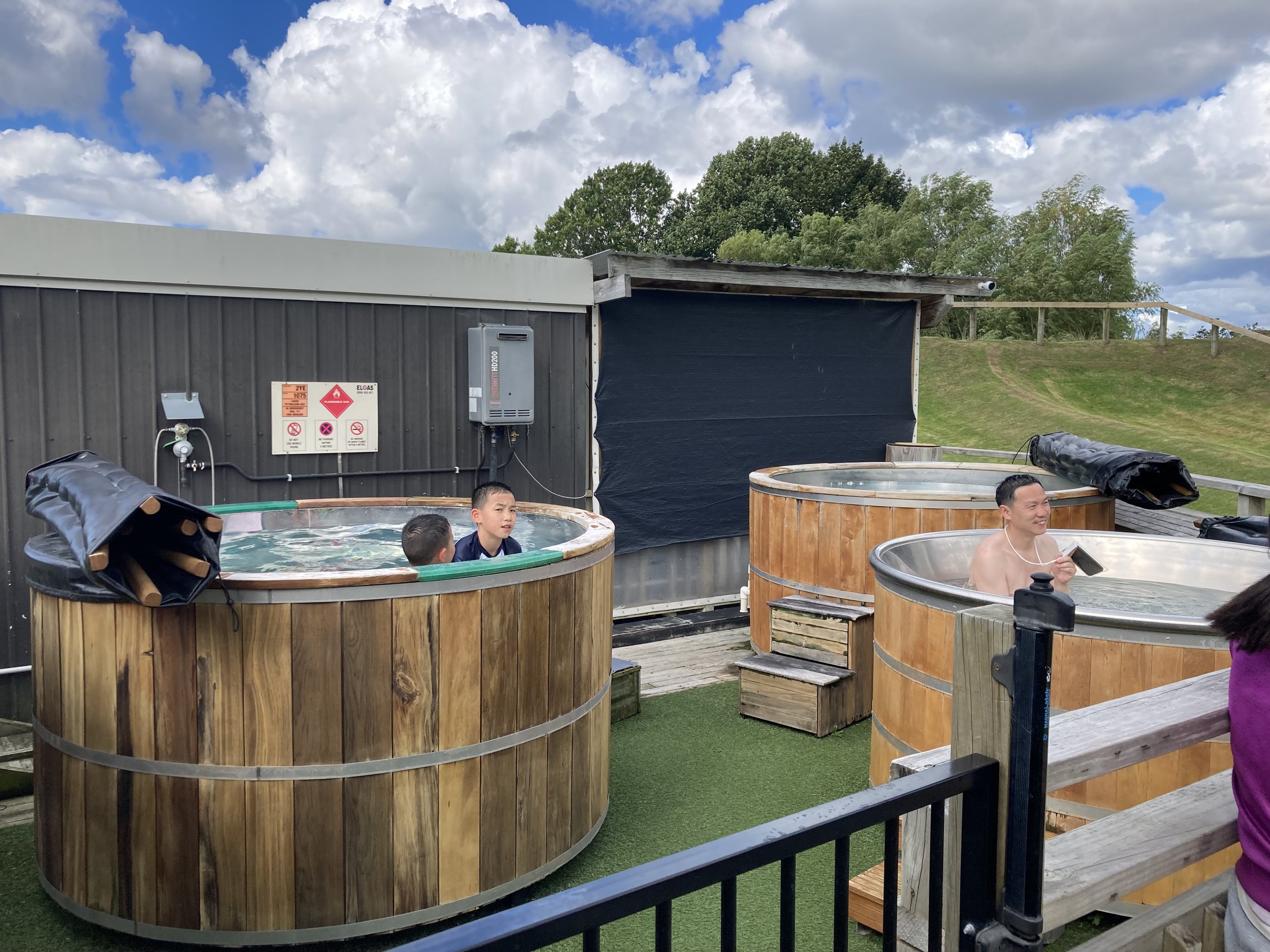 Now, one of the coolest features of Zorbing is that you “wait” in your choice of a hot tub or sauna. Yes, you read that right. While you’re waiting to go up the hill or your turn to go down, if there’s any queue at all, you’re waiting around in a hot tub!!